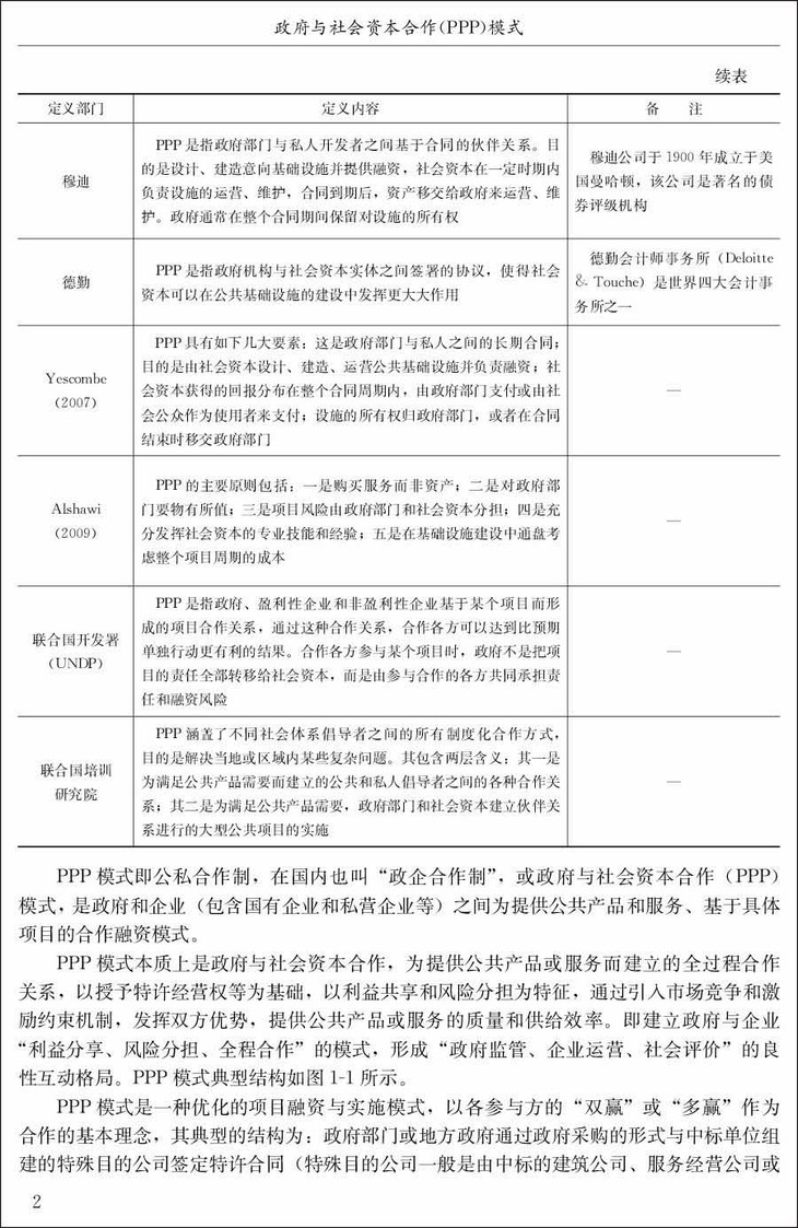 《政府与社会资本合作(PPP)模式》一书内容丰富、实用性强,可作为大中专院校、社会培训机构的培训教材,也可供政府部门(发展改革、财政、物价、建设、市政、水利、水务、医疗卫生、能源、交通、环保、工信、农业、政府采购和招标、开发区、高新区管委会等部门)和地方政府投融资平台(城投公司、建设开发公司、投资公司、国有资产运营公司、国有资本经营中心、交通投资公司、控股集团、基础设施开发公司等)领导及业务骨干工作参考;是专业服务机构(银行、证券、信托、保险、担保、基金公司、工程施工、工程设计、咨询单位、律师事务所等)和相关行业(城市基础建设、城市供水、供暖、供气、污水和垃圾处理、保障性安居工程、地下综合管廊、轨道交通、文体卫生和养老服务设施等企事业单位)负责人与专业人员学习参考及有志于从事政府与社会资本合作(PPP)模式人员快速入门的良师益友。
