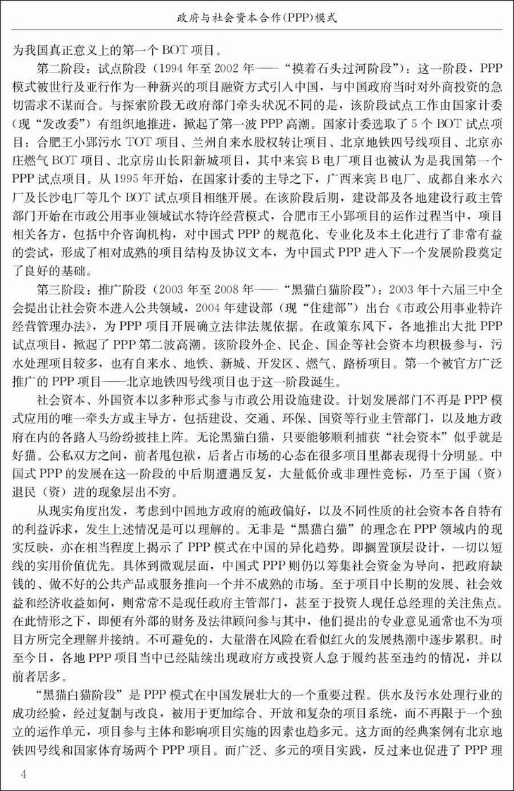 推广PPP模式,要义在合作,内涵是改革。我国从20世纪80年代起即通过特许经营方式开展PPP实践,发展到现在,“特许”不再单纯强调许可与管制,而是演变为政府和社会资本协商谈判的过程;“经营”的重点也不再是向使用者收费,而是更加强调“运营”这个内涵。在制度建设方面,从20世纪90年代开始,截至目前以特许经营命名的中央和地方法律制度文件达60余件。《政府与社会资本合作(PPP)模式》是一本指导实践的工具书,诠释了当前以PPP命名的政策适用范围、调整对象、基本原则、主要目的和内容,可以帮助解决目前PPP领域一定程度上存在的制度政策不一致、不衔接甚至相互冲突等问题,从而为PPP实践提供清晰、有效的智力支持。