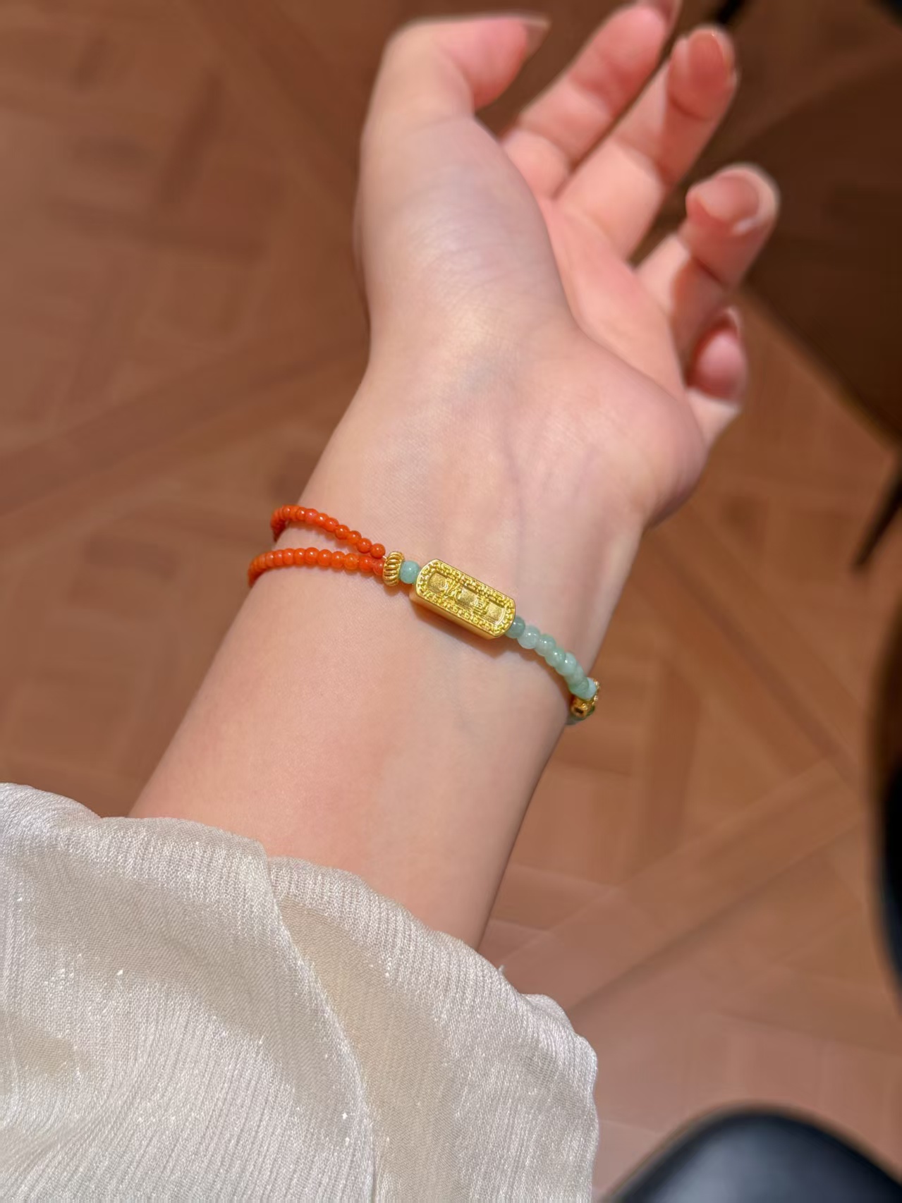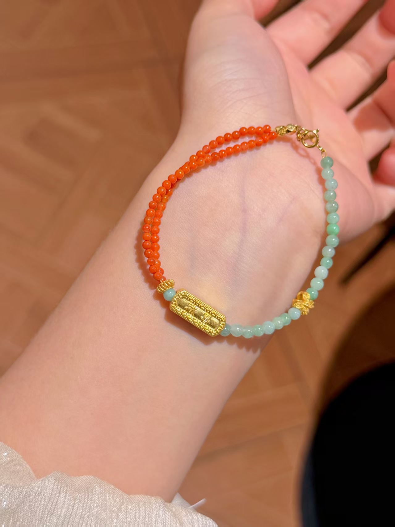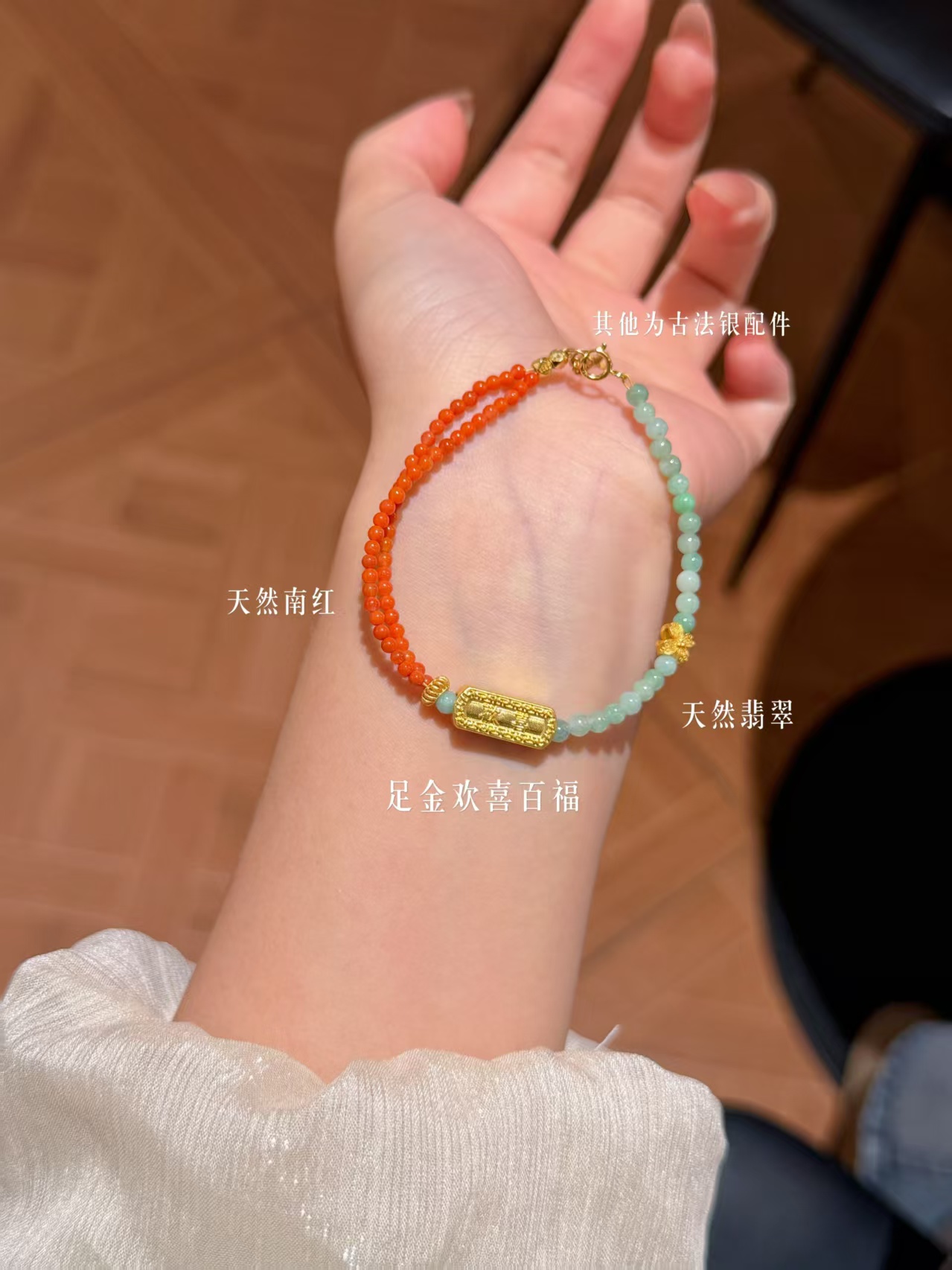 足金欢喜百福+天然翡翠南红+古法银配件
