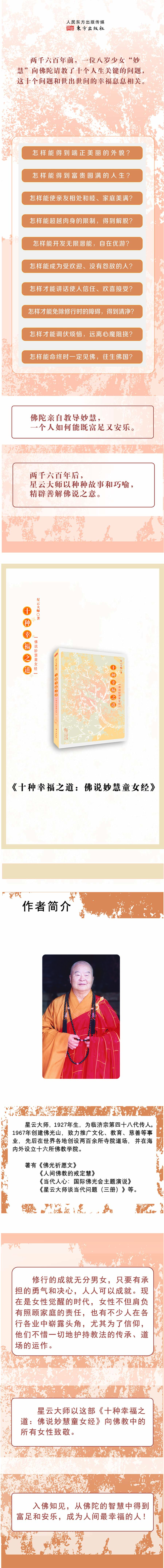 佛陀亲自教导妙慧,一个人如何能既富足又安乐。近两千六百年后,星云大师通过《十种幸福之道(佛说妙慧童女经)》一书,以种种故事和巧喻,精辟善解佛所说之义,为我们指引了“十种幸福之道”的不变价值与现代意义。