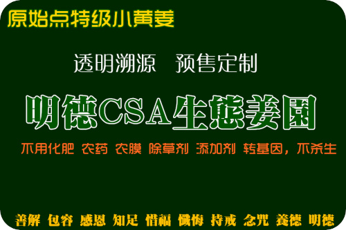 明德CSA生态姜园是首家原始点志愿者众筹合作共建的透明溯源 预售定制的良心小黄姜基地。2015年第一年春于山东曲阜及浙江仙居开始种植,2018年第四年秋收。使用”七不”方法生态养植小黄姜,促进万物和谐共生! '七不'生态养植,“养”是戒杀生以惜物命,慎剪伐以养天和。“七不”是,不用化肥、不用农药、不用农膜、不用除草剂、不用添加剂、不用转基因、不杀生!
