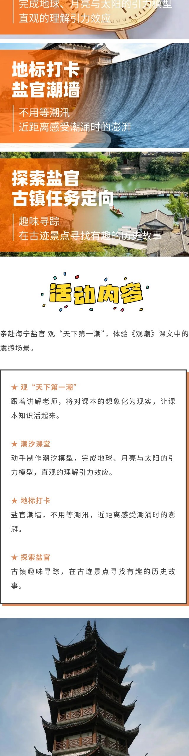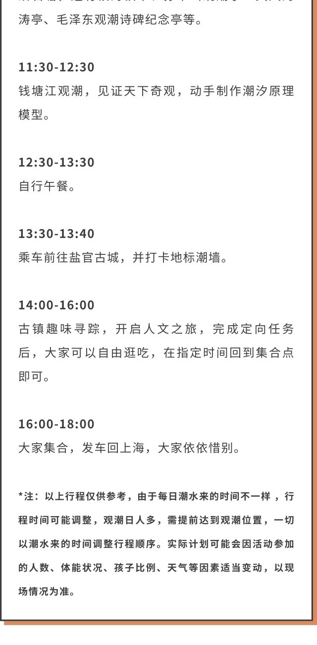 活动组织费、导师费、交通费(往返大巴费及过路费)、门票费(成人观潮胜地公园+潮乐之城门票套票费用80元/人,儿童观潮胜地公园+潮乐之城门票套票优惠票40元/人,不去不退)、活动体验费(儿童潮汐原理模型费用、观潮胜地公园讲解费用)、公用物资(对讲机、外用药品、饮用水、垃圾袋)、保险费等。