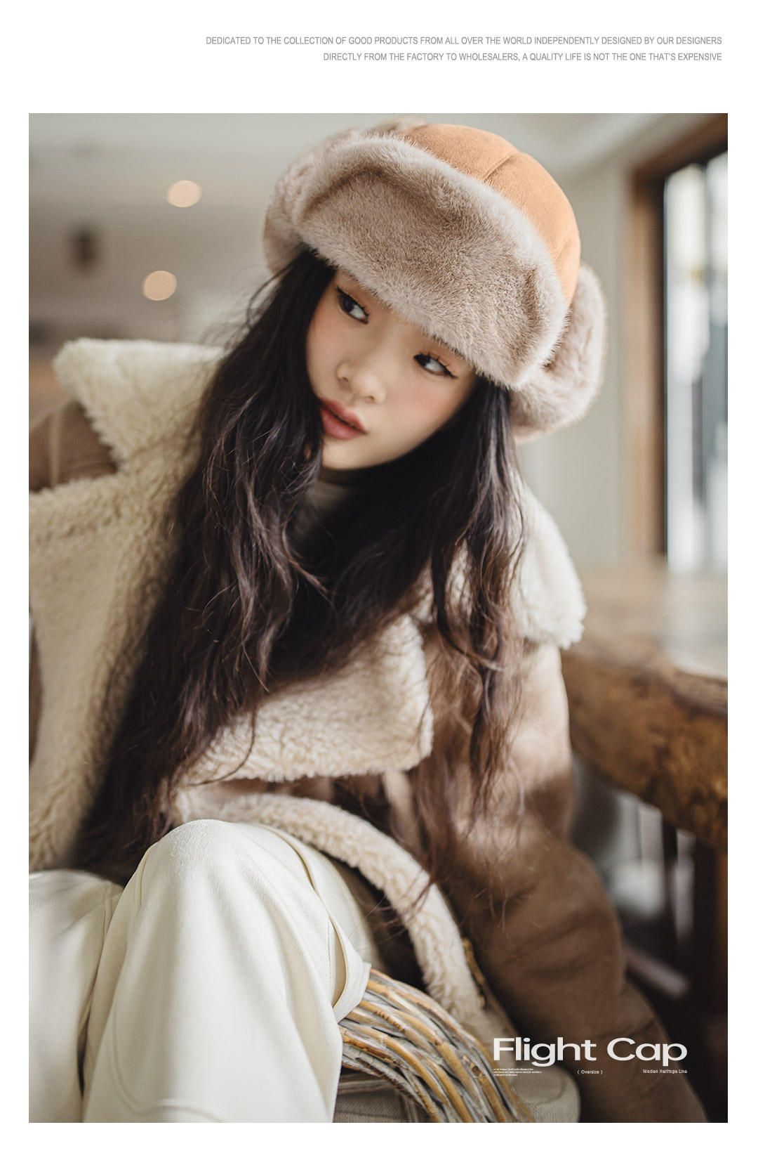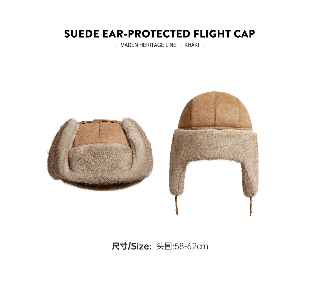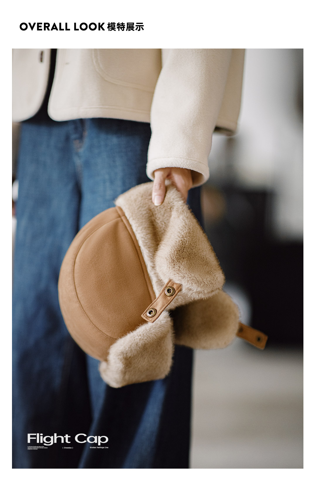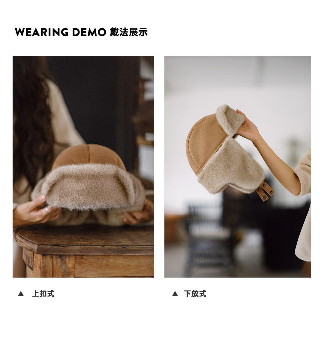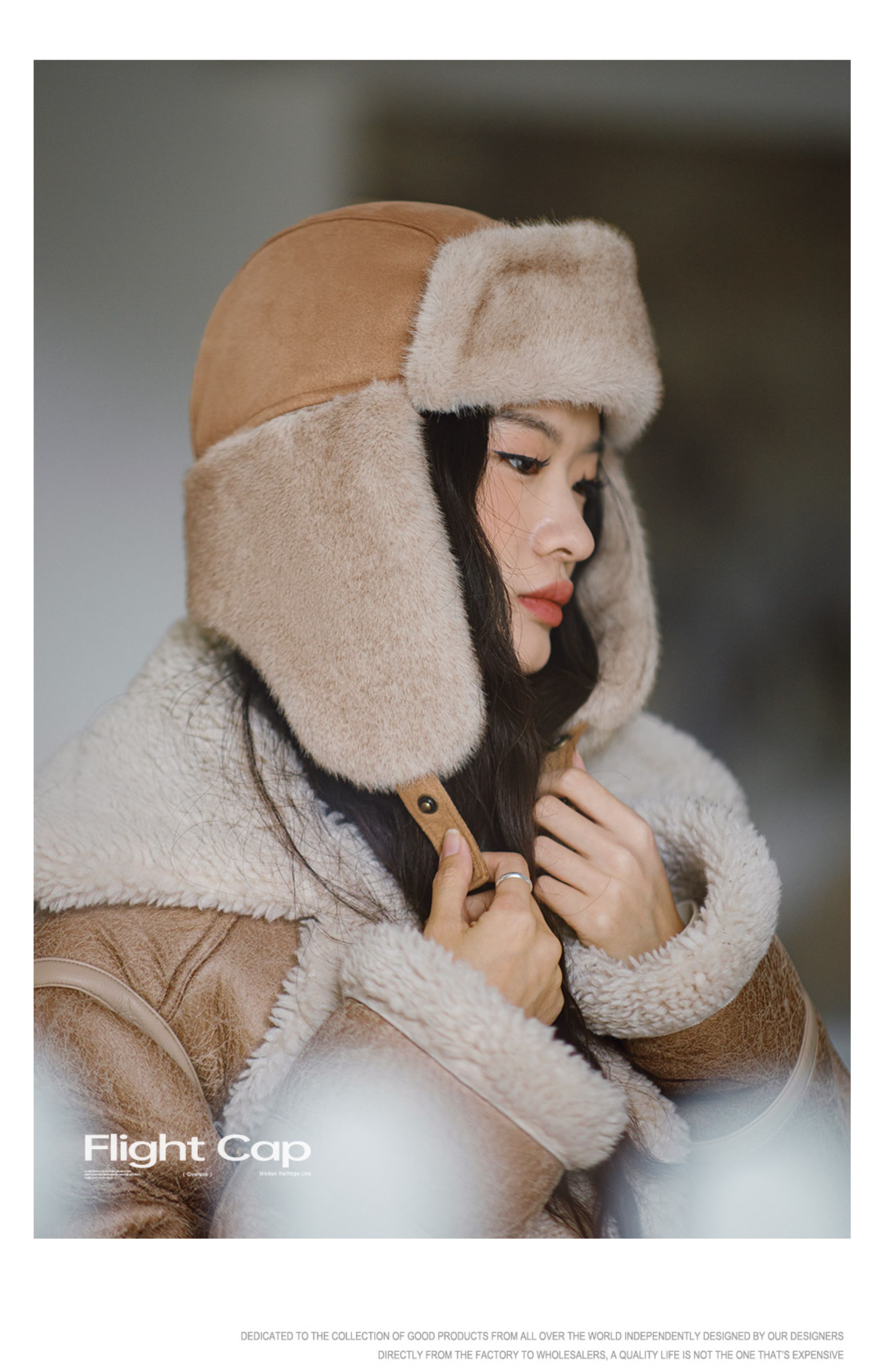 马登斯拉夫摩卡棕皮毛一体麂皮绒护耳帽仿貂绒防风加厚冬飞行帽女