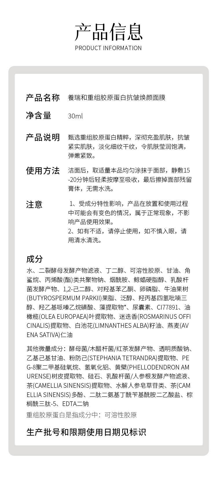 养瑞和 | 重组胶原蛋白抗皱焕颜面膜100g·可溶性胶原·二裂酵母·烟酰胺·透明质酸钠·角鲨烷·白池花籽油·乳木果油·类蛇毒肽·玻色因·棕榈酰三肽