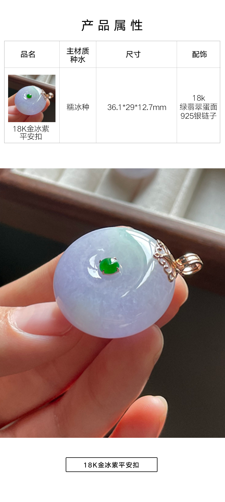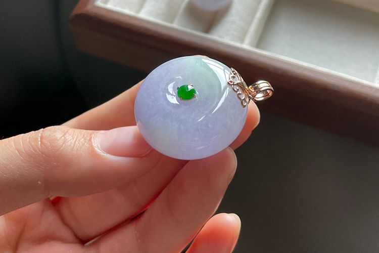 烟雨入春俏,彩祥出云端,这款带着紫韵的春彩翡翠平安扣,中心镶嵌小点位正阳绿冰种翡翠,仙气又贵气。