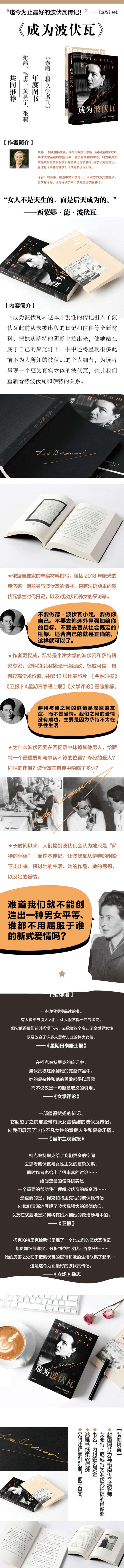 《成为波伏瓦》是根据近几年新曝光的波伏瓦信件、早期日记等材料撰写的波伏瓦全新传记。“女人不是天生的,而是后天成为的。”波伏瓦如是说。这本开创性的传记引入波伏瓦此前从未被出版的日记和信件等全新材料,把她从萨特的阴影中拉出来,使她站在属于自己的聚光灯下。这本传记将为读者呈现一个更为真实立体的波伏瓦,也让我们重新看待波伏瓦和萨特的关系。