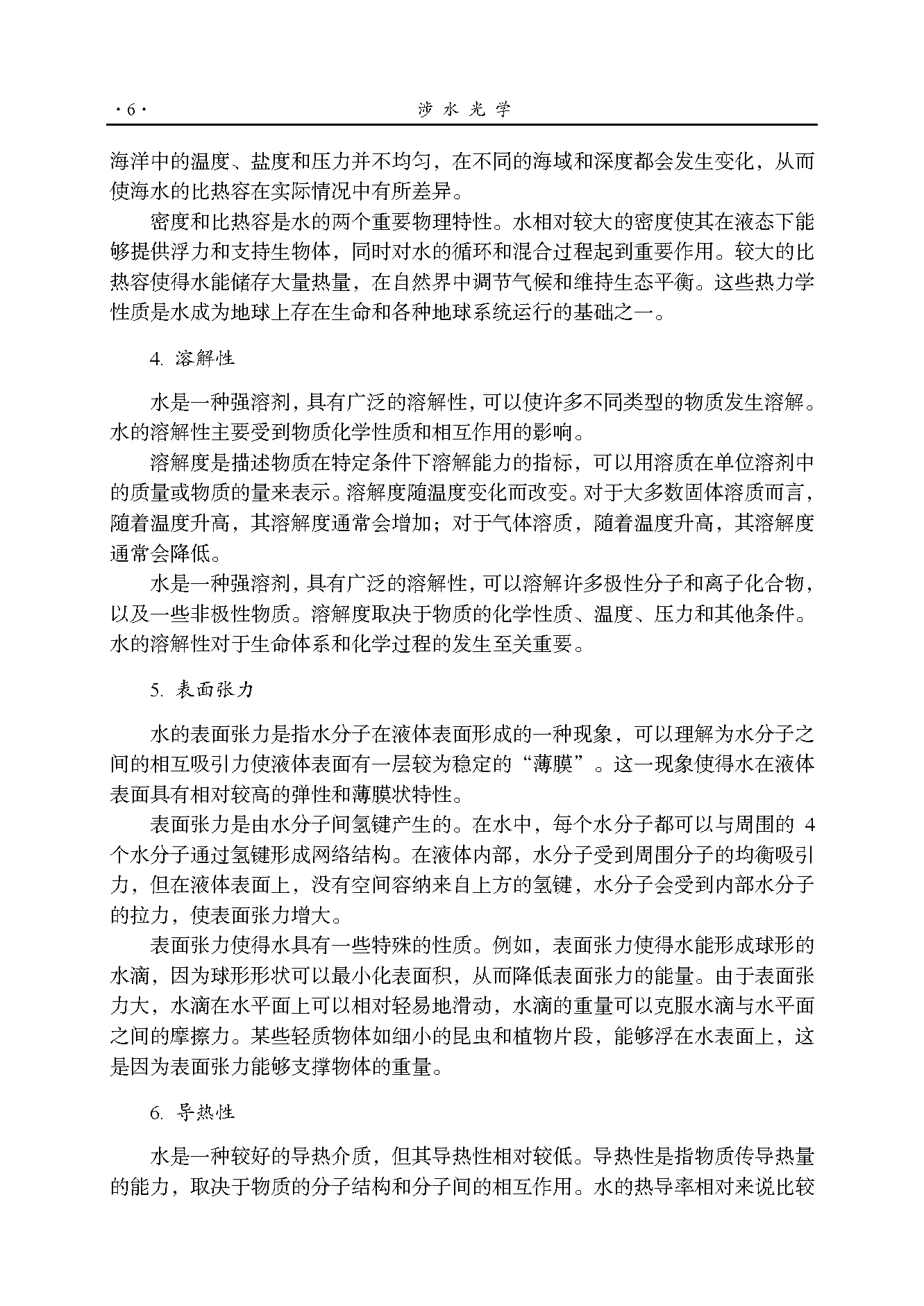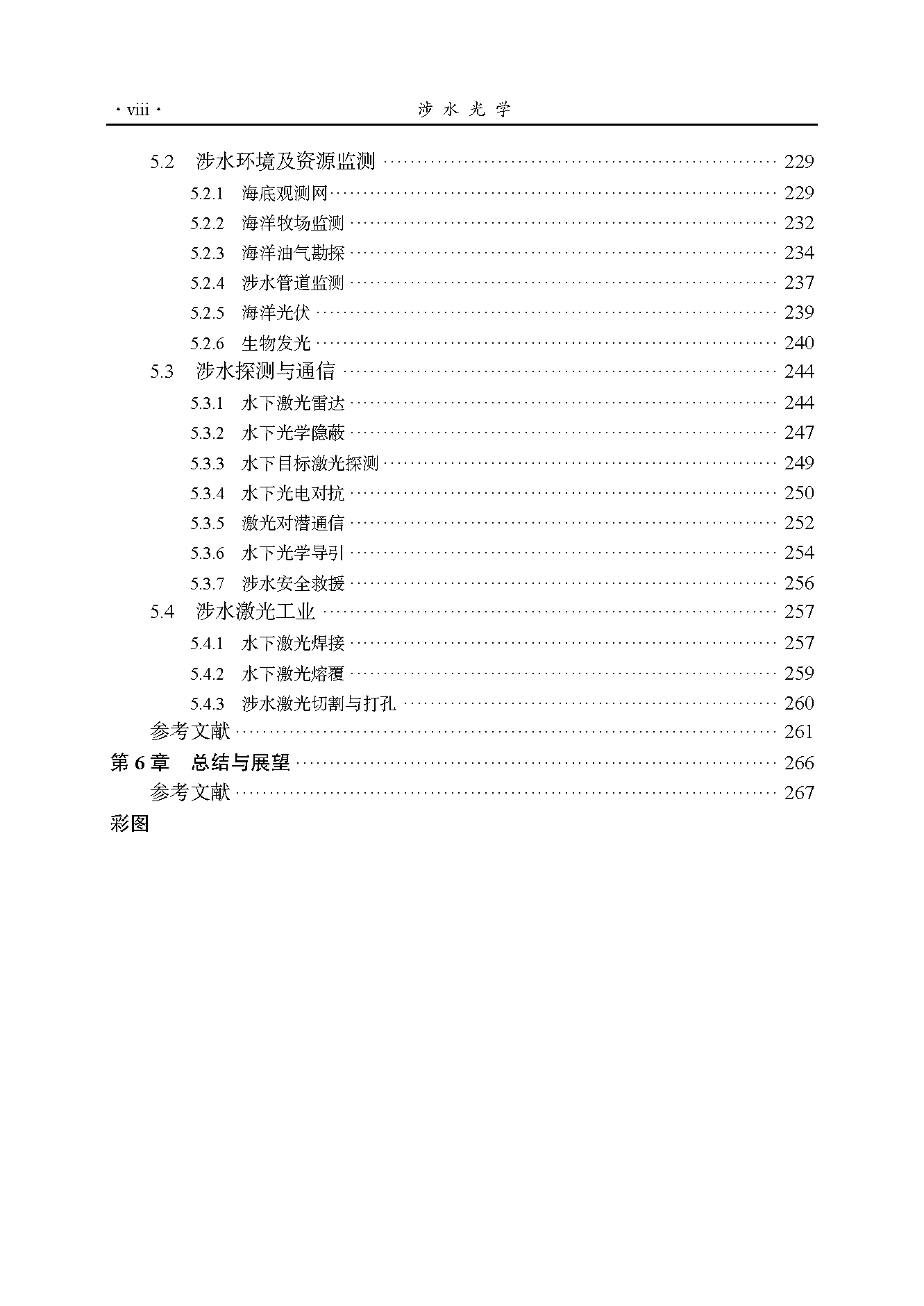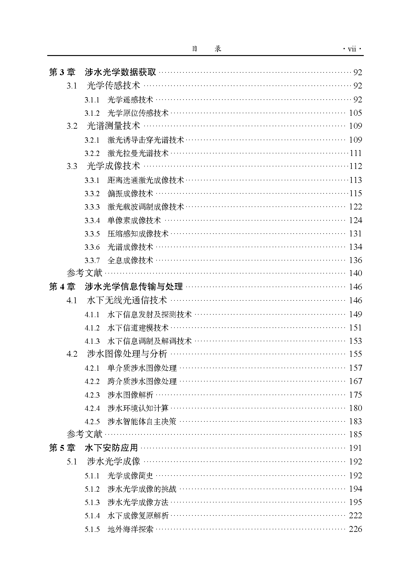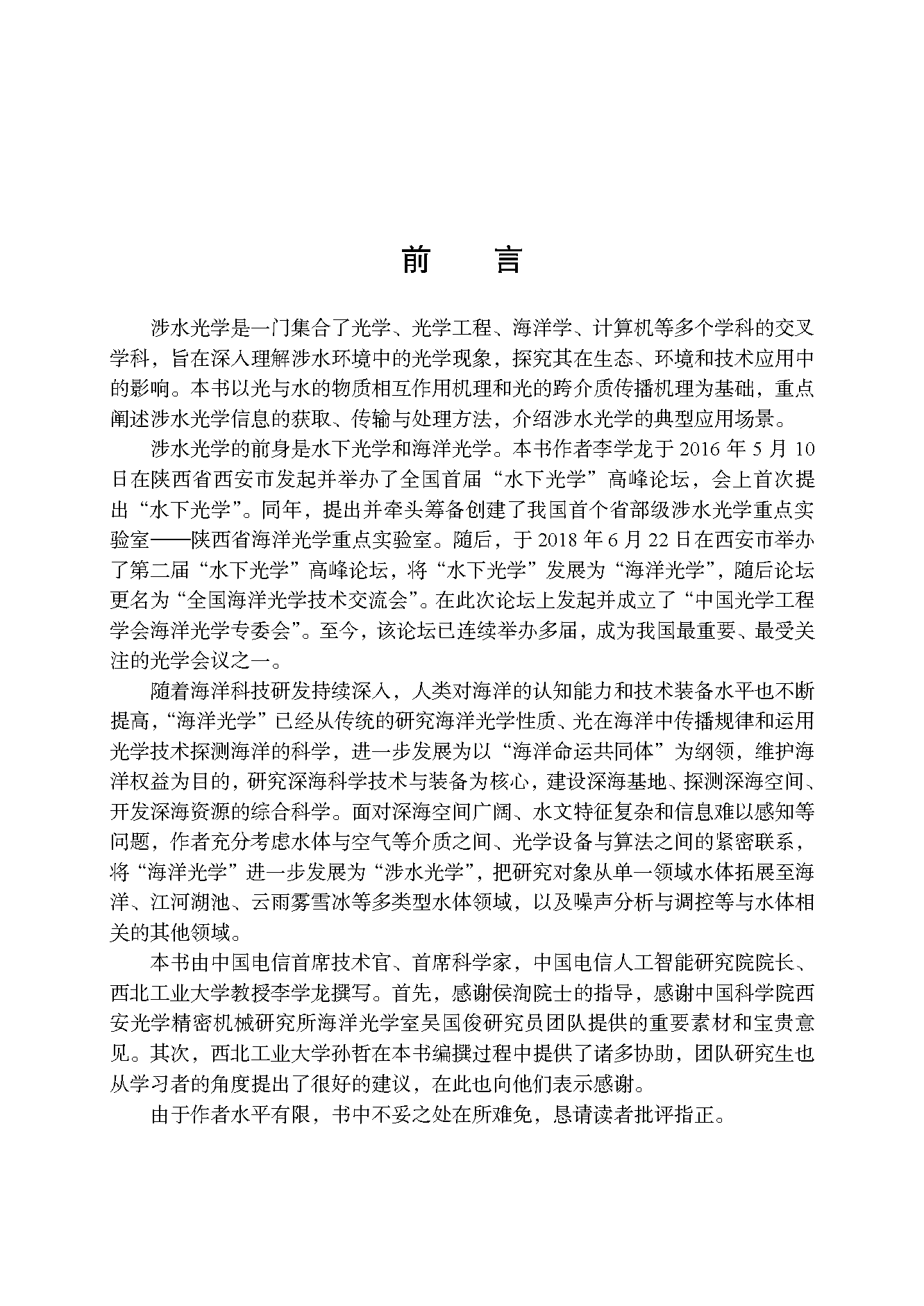 涉水光学是探索光学在涉水领域中应用的科学。本书首先介绍光与水的物质相互作用及跨介质传播;其次,介绍几何光学及成像定律;再次,从光学成像的历史背景出发,详细阐述涉水光学数据获取,涉水光学信息的传输与处理;最后,介绍涉水光学的典型应用场景——水下安防。本书可供光学、海洋学、计算机科学等相关领域的科研工作者和感兴趣的人士阅读。对于我国海洋政策制定者、海洋资源管理者及水下安防领域的实践者来说,本书是一本极具参考价值的资料。