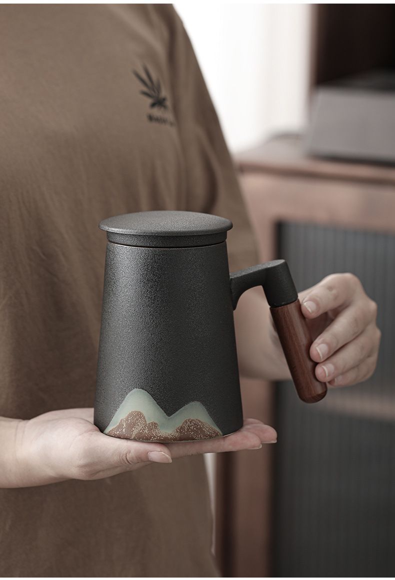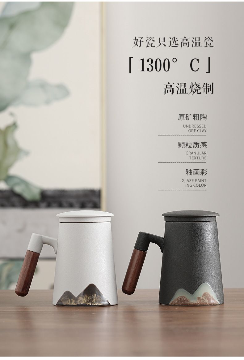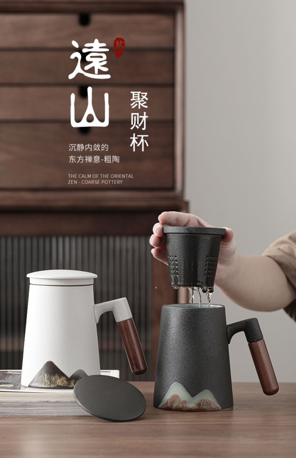 远山陶瓷马克杯带过滤泡茶杯茶水分离水杯办公带盖个人专用杯定制