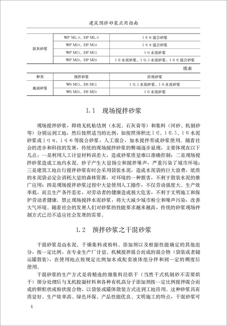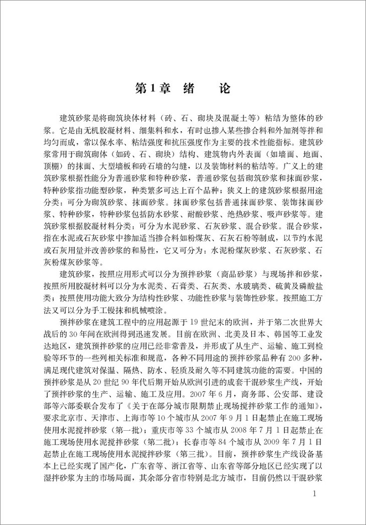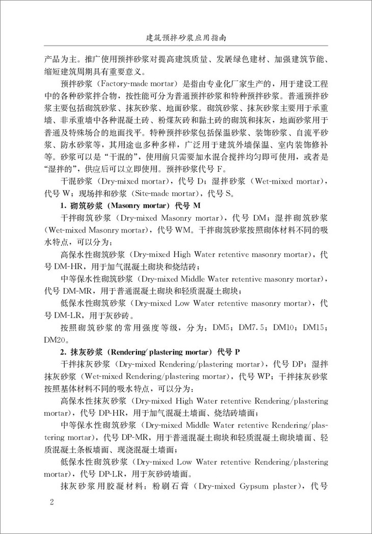 预拌砂浆是指区别于工地现场按经验制作的手工或机械搅拌的传统砂浆,并由专业化工厂配制生产的,用于建设工程中的各种砂浆。预拌砂浆可分为普通预拌砂浆和特种预拌砂浆。普通预拌砂浆是指用于普通建筑的砌筑、抹灰、地面的砂浆,又分为干混砂浆和湿拌砂浆。特种砂浆一般是指装饰砂浆、保温砂浆、防水砂浆、修补砂浆等具有特殊性能的砂浆。预拌特种砂浆主要是干混砂浆。20世纪50年代初,欧洲国家就开始大量生产和使用预拌砂浆,至今已有70年的发展历史。我国自20世纪90年代后期,才从欧洲引进并逐渐消化了预拌砂浆技术和关键设备。目前,预拌砂浆生产线设备已经实现了国产化,预拌砂浆技术已经日趋成熟。推广使用预拌砂浆对环境保护、提高建筑质量、发展绿色建材、加强建筑节能、缩短建筑周期等具有重要意义。到21世纪中叶,我国建设领域仍然有20~30年的中高速发展期,城市化进程不断加快,老旧危房拆迁改造以及新农村建设等对预拌砂浆的需求仍然可期,砂浆是除水泥混凝土、砖瓦以外建筑物用量最大的建筑材料,市场空间仍然十分大。