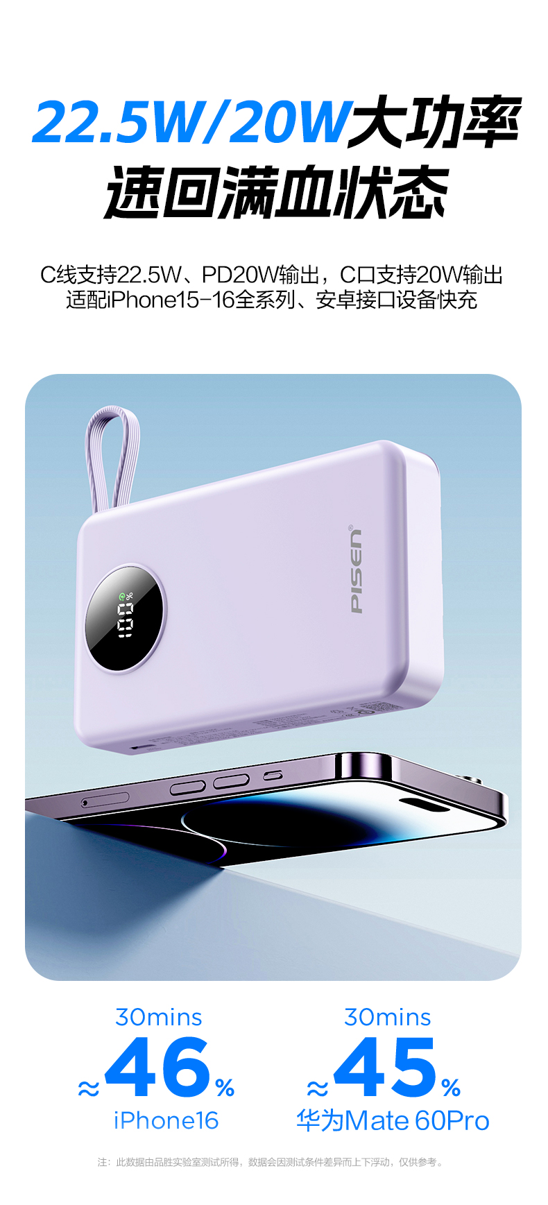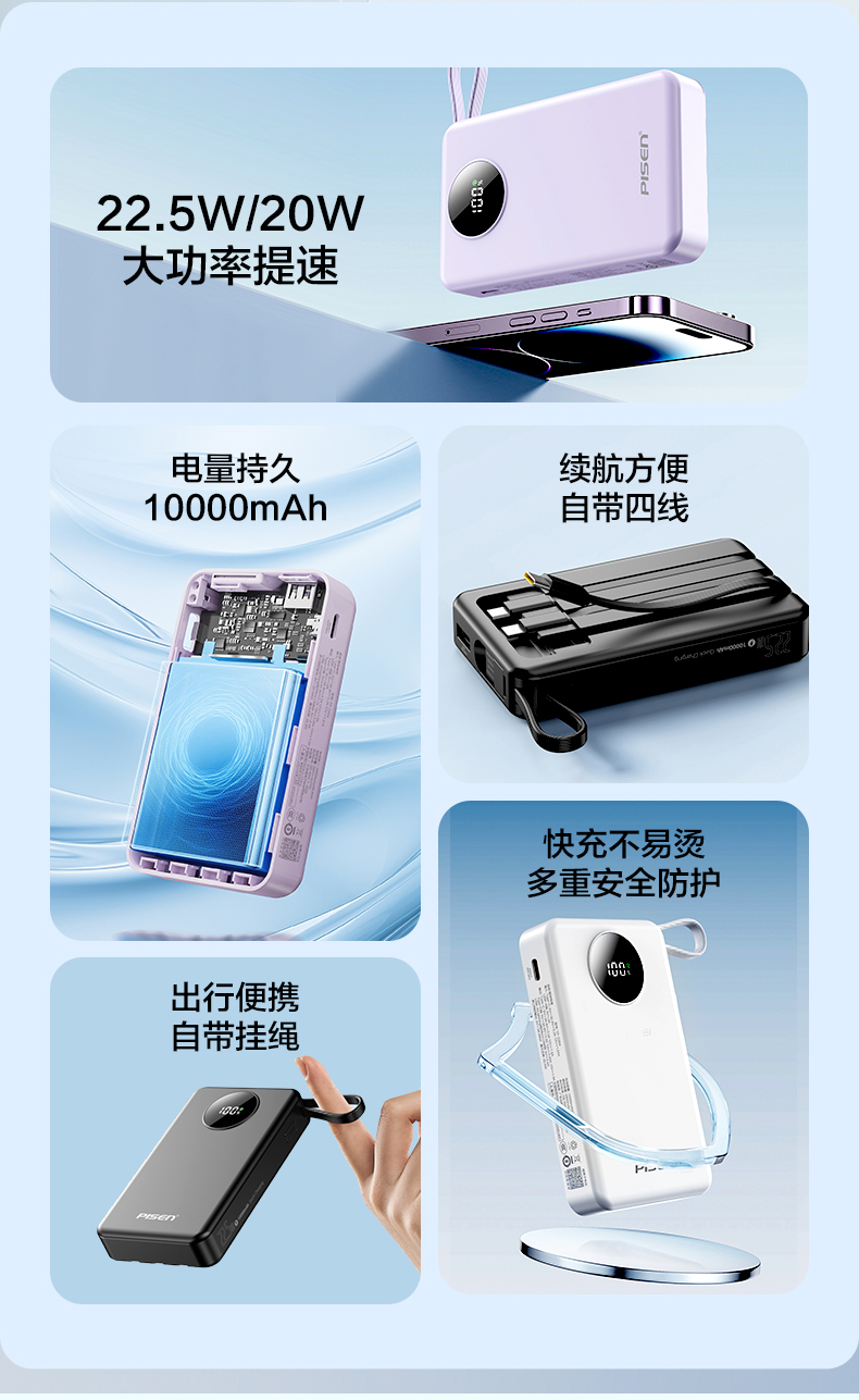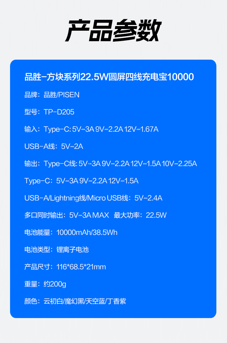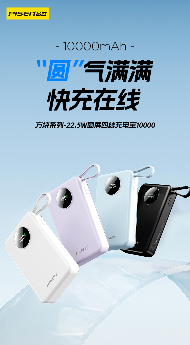 品胜 方块系列22.5W圆屏四线充电宝10000毫安 适用华为小米苹果手机支持PD快充移动电源