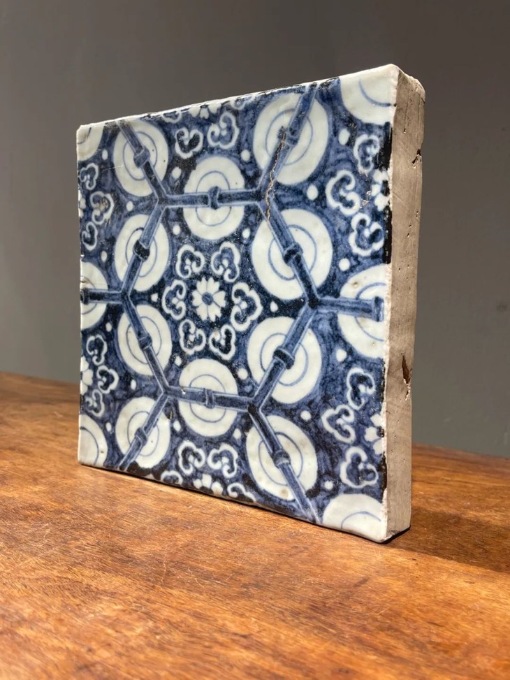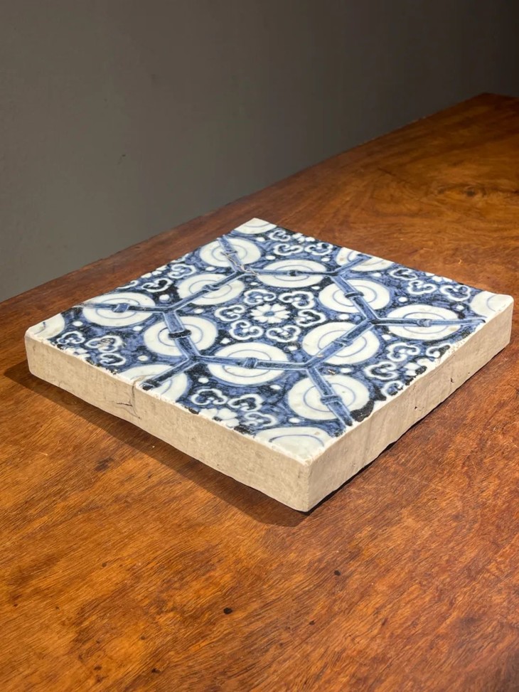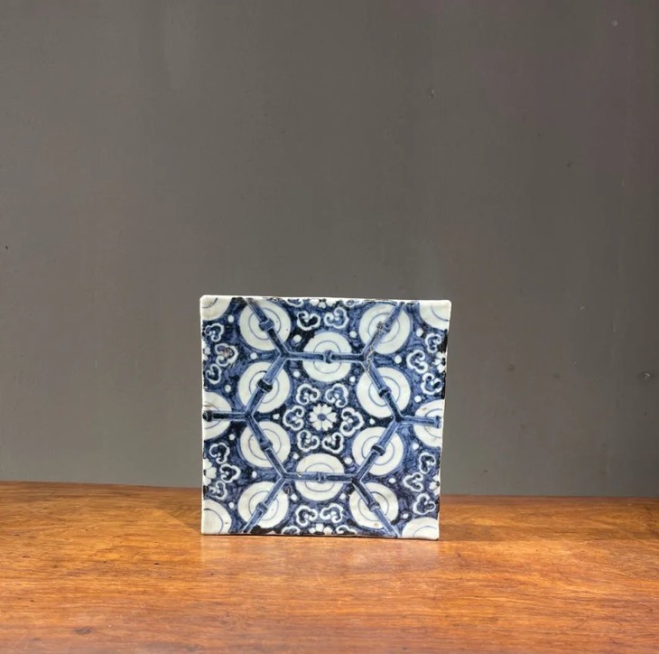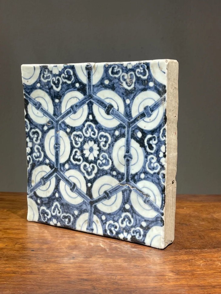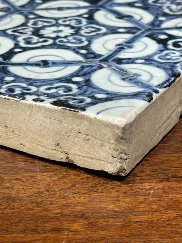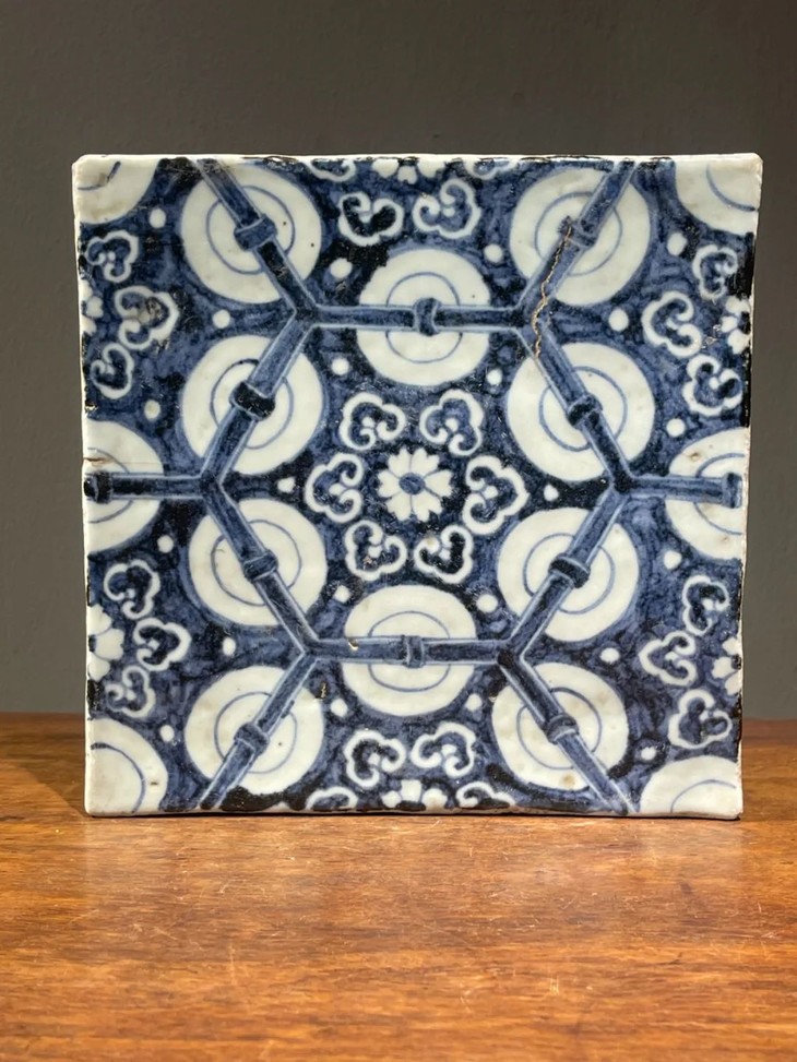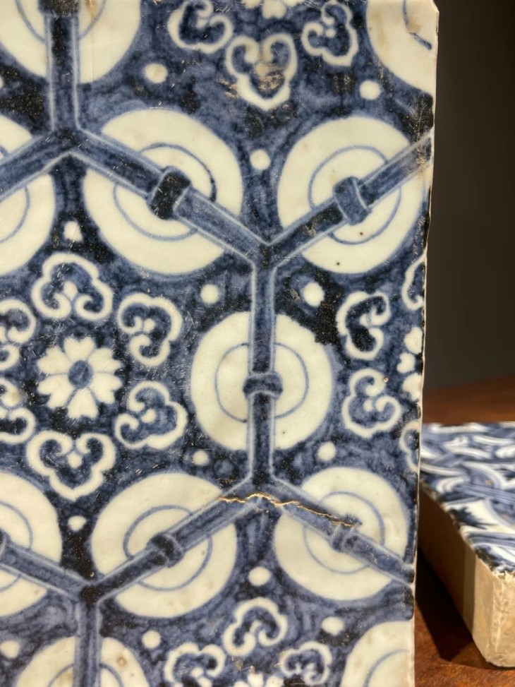 这是一件景德镇烧制的早明永乐大报恩寺地砖风格老青花瓷地砖,高岭土细白胎的长方型厚瓷板,以进口苏麻离青钴蓝料绘与永乐大报恩寺地砖类似的六方框如意纹连续几何图案,胎质比重高,尺寸近二十厘米见方,瓷板厚度达三厘米,重逾二点五公斤,釉水凝厚光润,青花发色深蓝,偶带进口青料特有的黑色斑点,四侧与底部露涩胎,呈现出洁白细密之瓷胎,体现早明永乐青花瓷器的风格与特质。