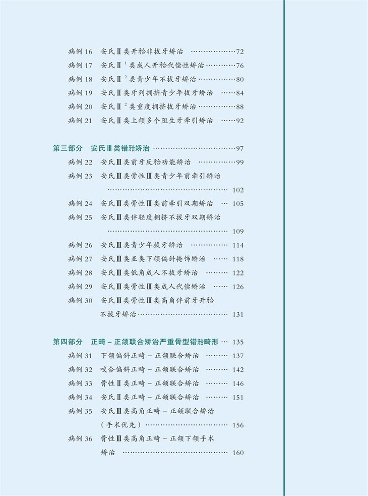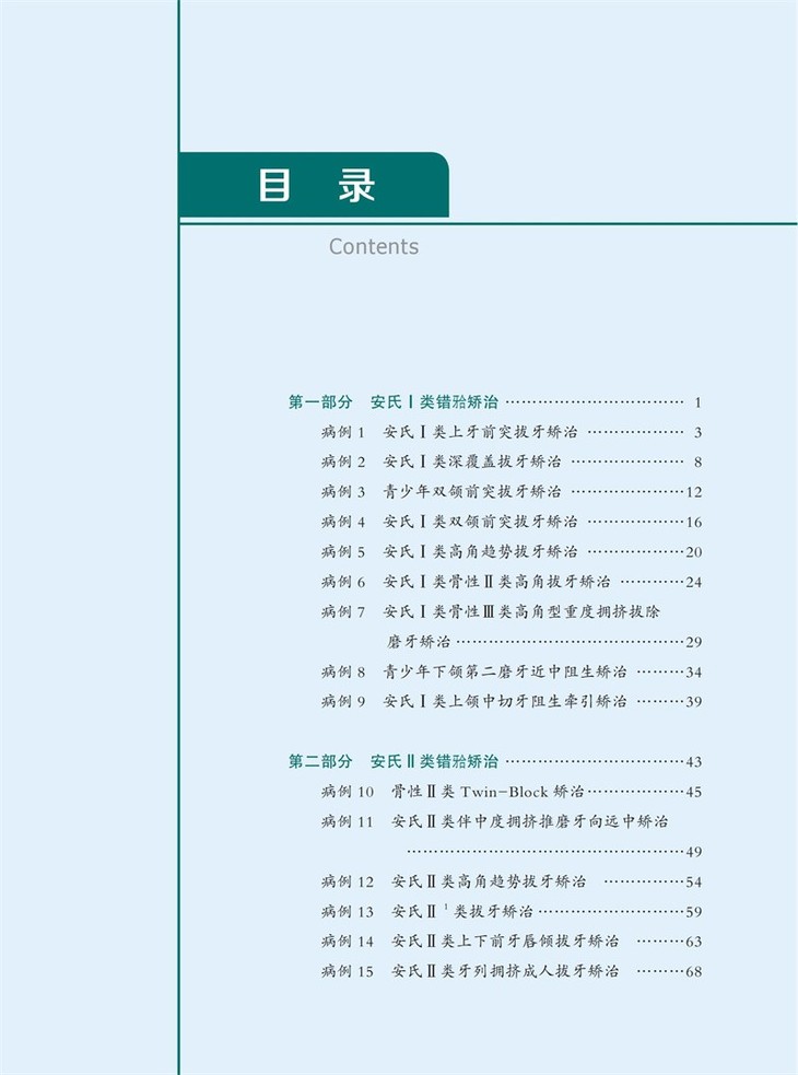 全书共分为7部分54例病例,每部分依次讨论安氏I类错矫治、安氏II类错矫治、安氏III类错矫治、正畸-正颌矫治严重骨型错畸形、多学科联合矫治复杂错畸形、舌侧矫治、隐形矫治。在病例的选择中兼顾高角、低角患者,骨性、牙性问题,手术优先、普通顺序的手术治疗,力求尽可能全面地展示临床上常见的病例种类和治疗方法。本书精选病例,讨论全面,完整地展示出从诊断分析到治疗实践的临床思维全过程。