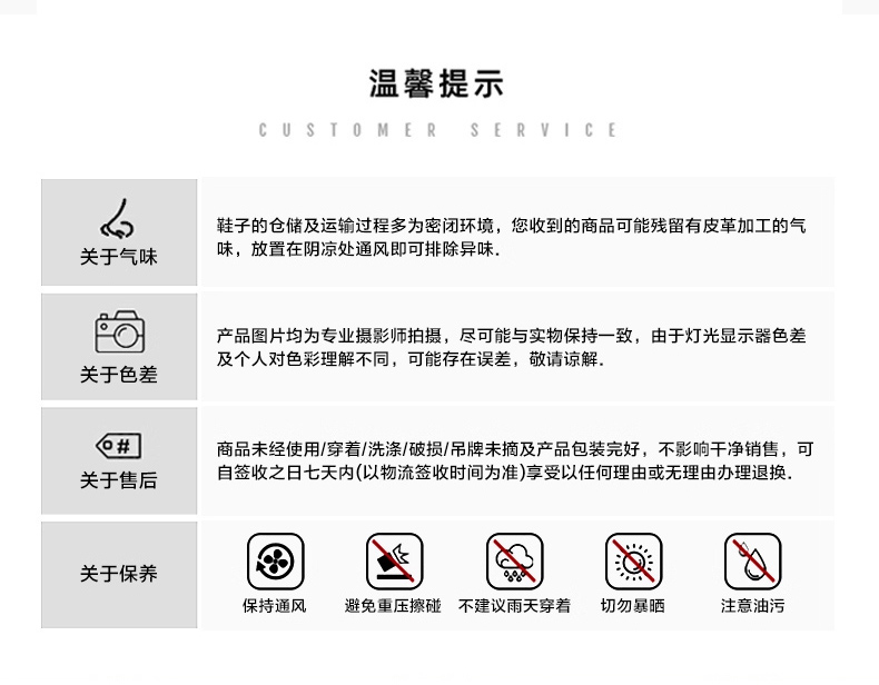1.因穿用不当(鞋面因磕碰、磨损、鞋底漫水时间过长等)、保养不当或人为原因造成鞋子损坏。
