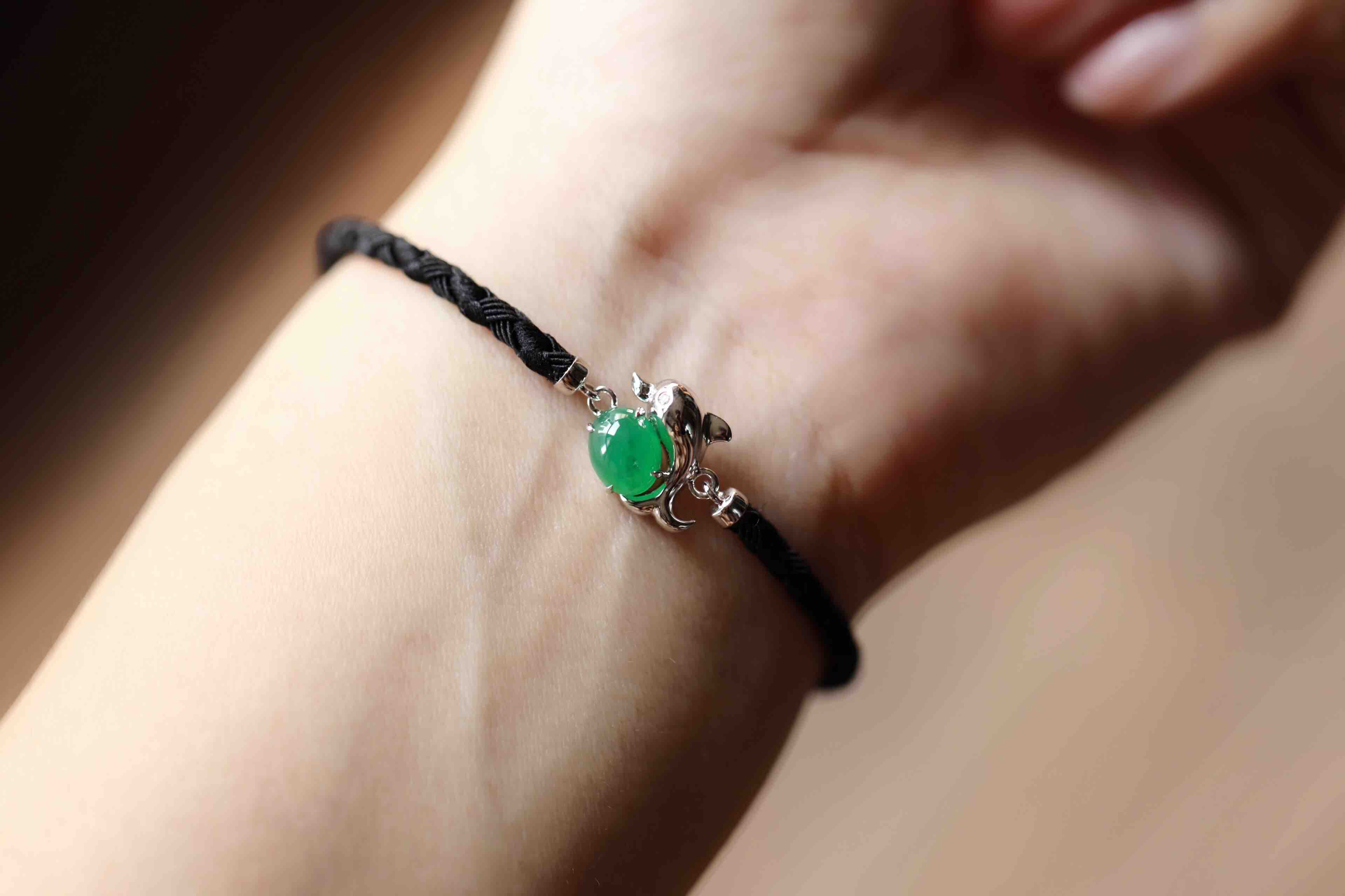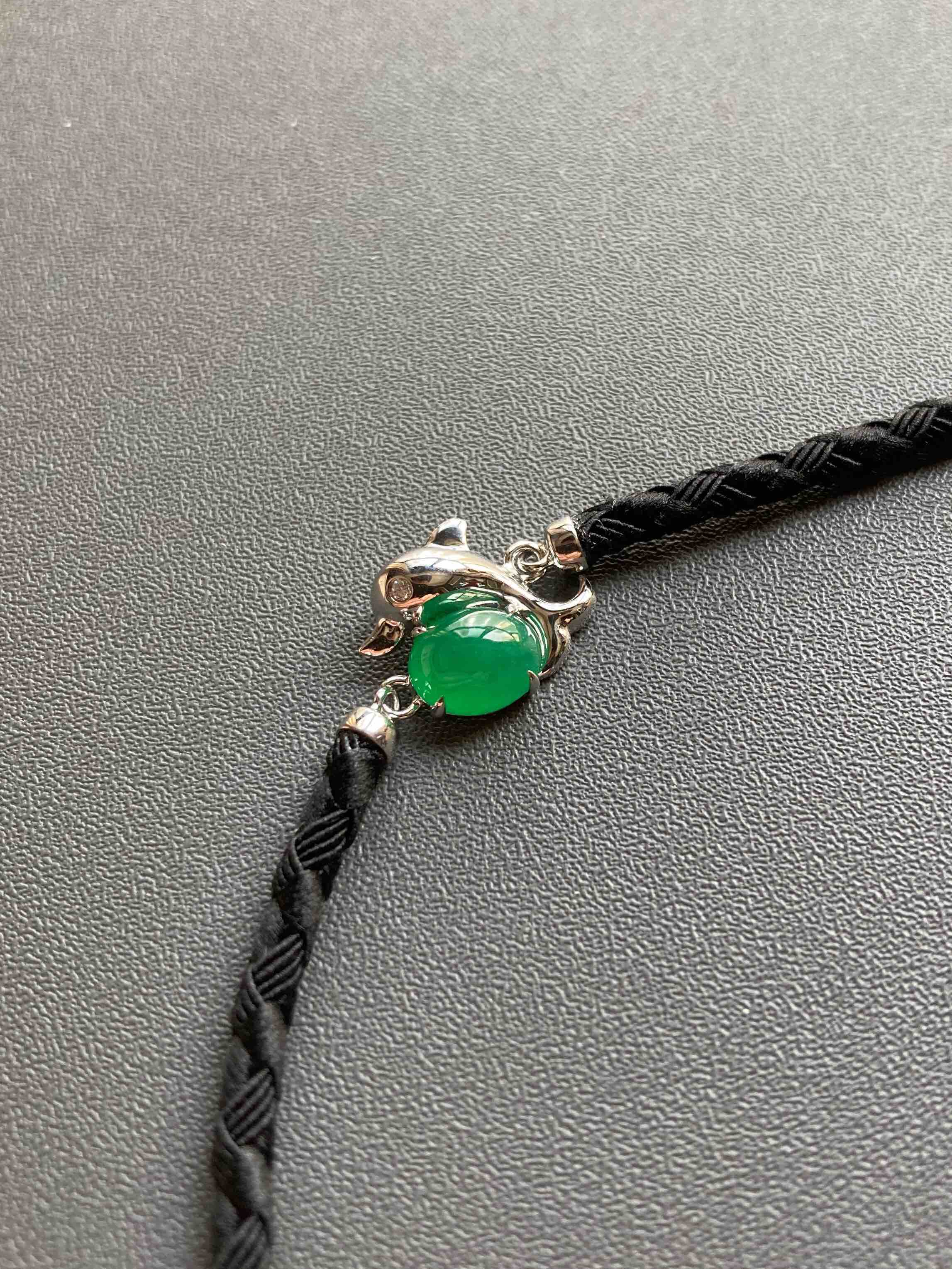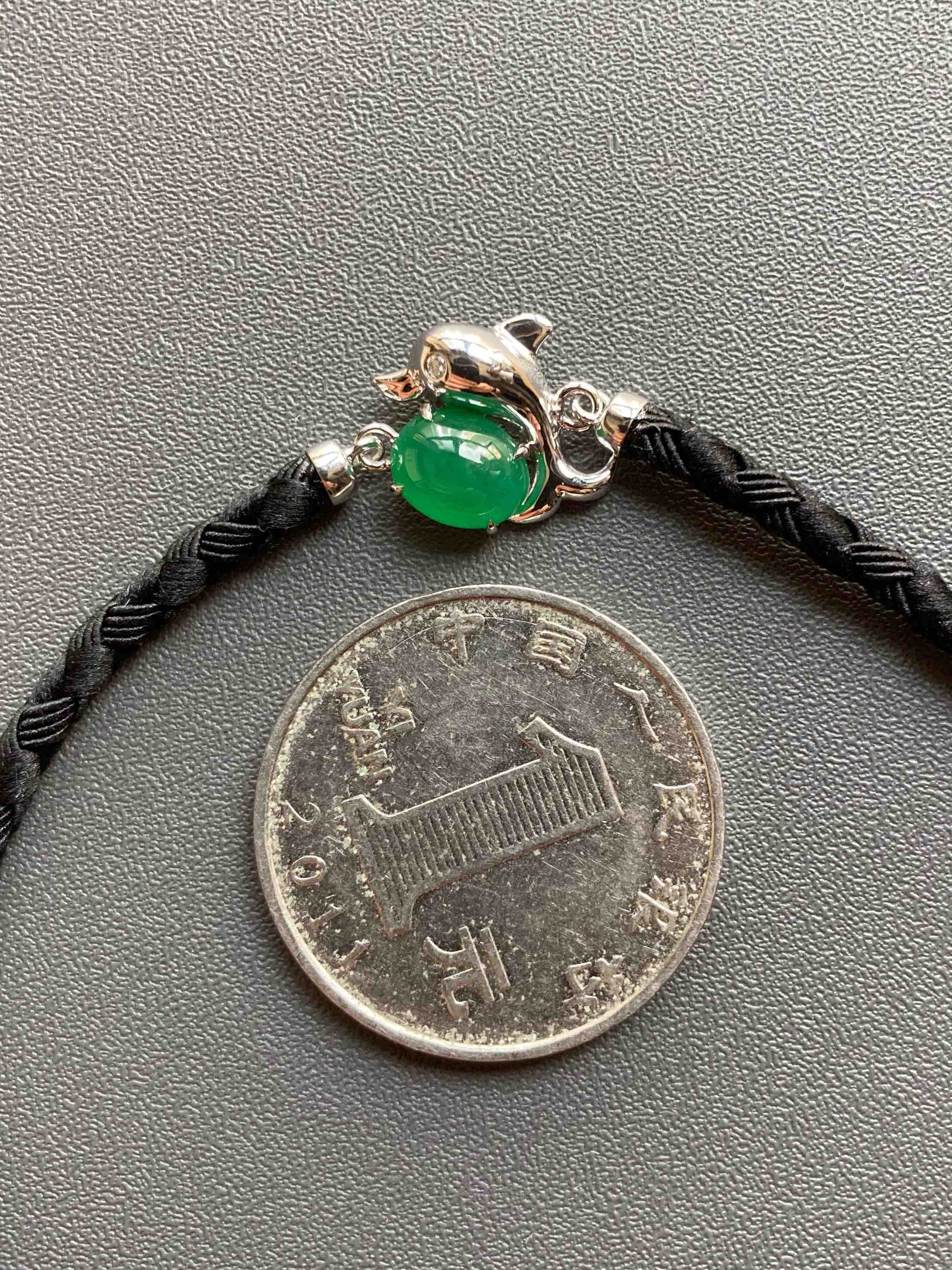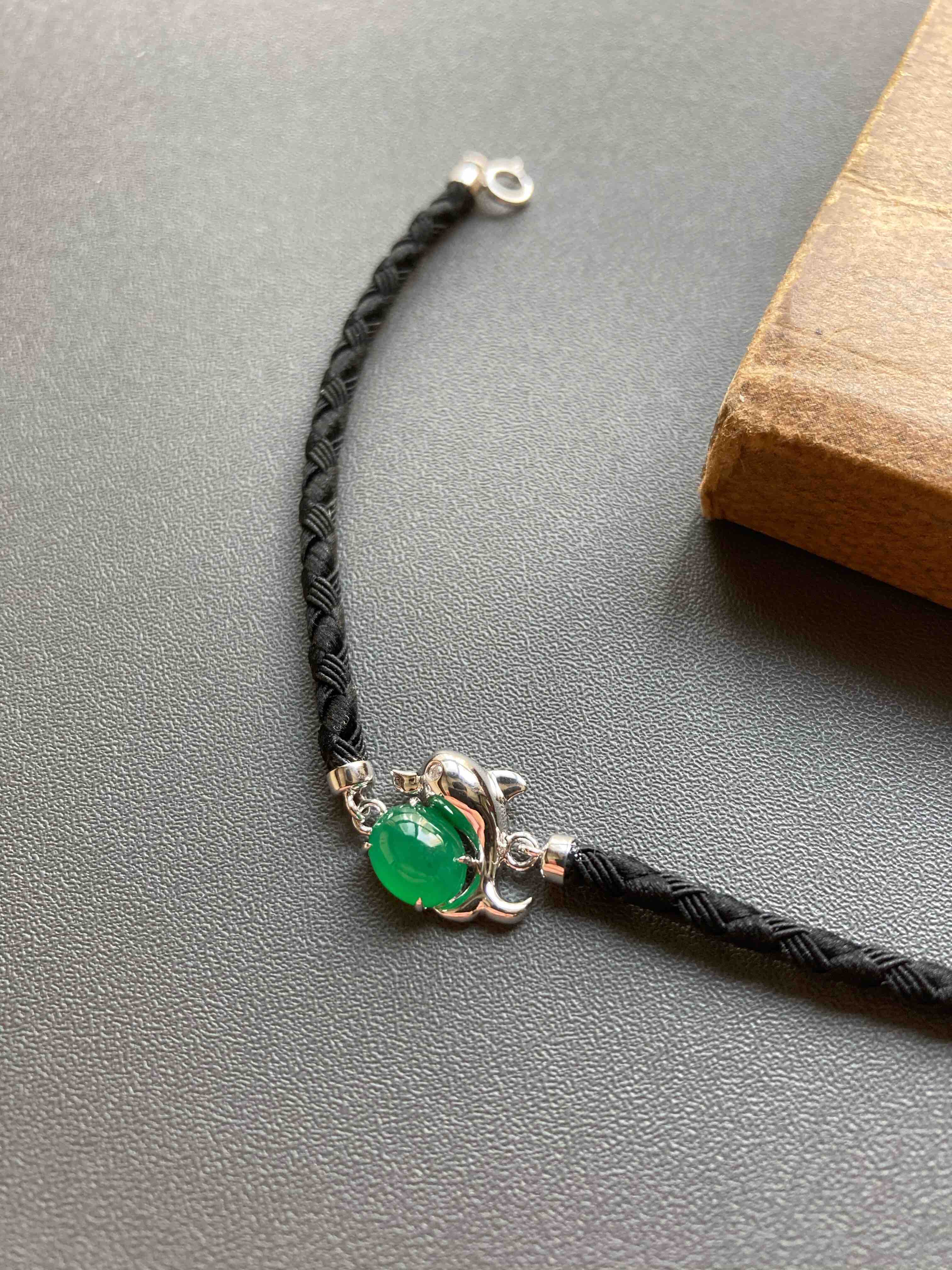 冰种阳绿翡翠蛋面海豚手链18k白金镶嵌,它是如此特别,翡翠禄来原创设计系列,标本级的冰种阳绿翡翠蛋面打造,7.6×6×4mm,种水晶莹剔透,起荧光,正阳绿艳丽无比,18k白金镶嵌小海豚,寓意乘风破浪,属于你独一无二的手链,绳子每个配件都是18k金,手绳长15.5cm加3cm延长链