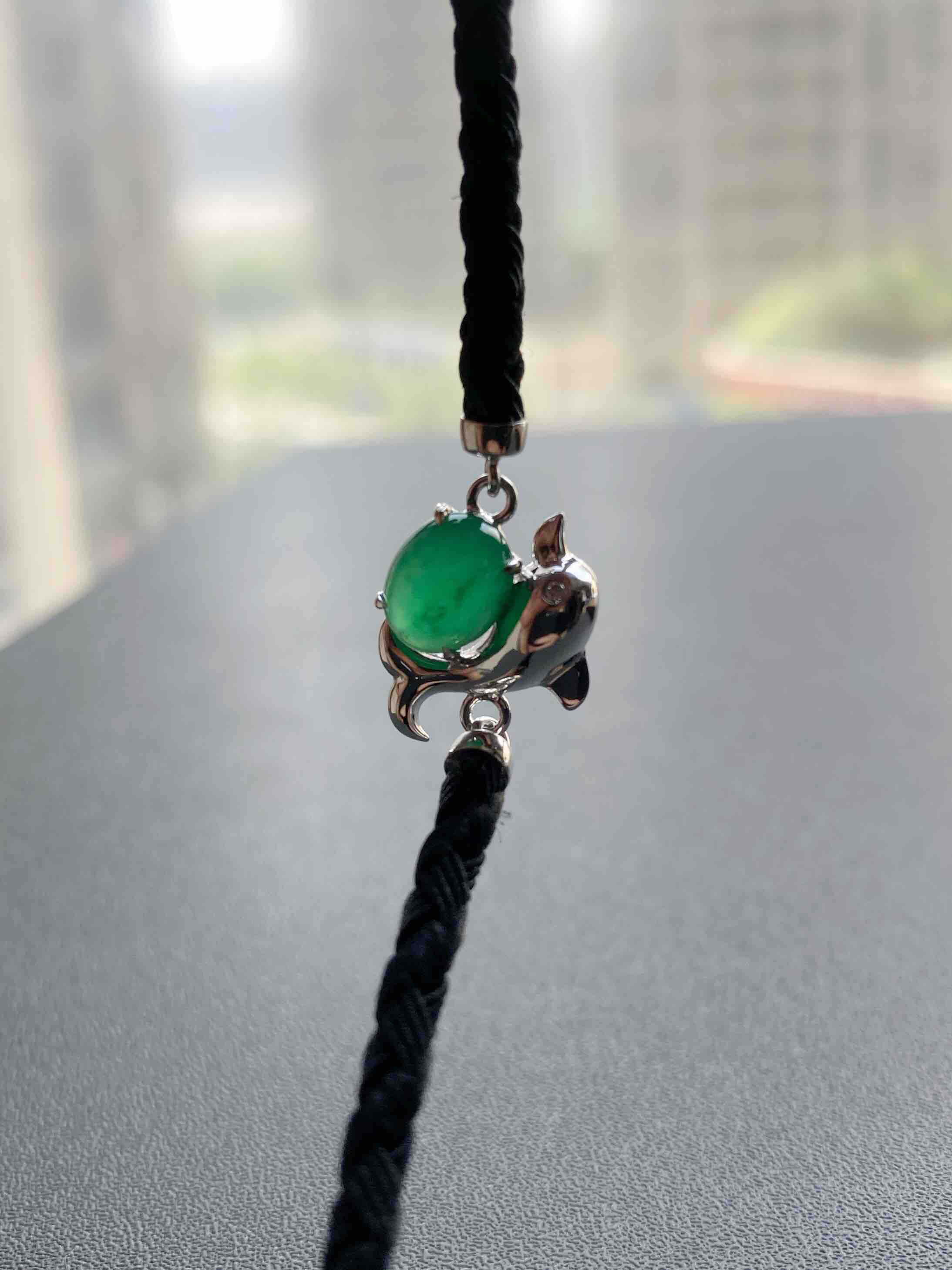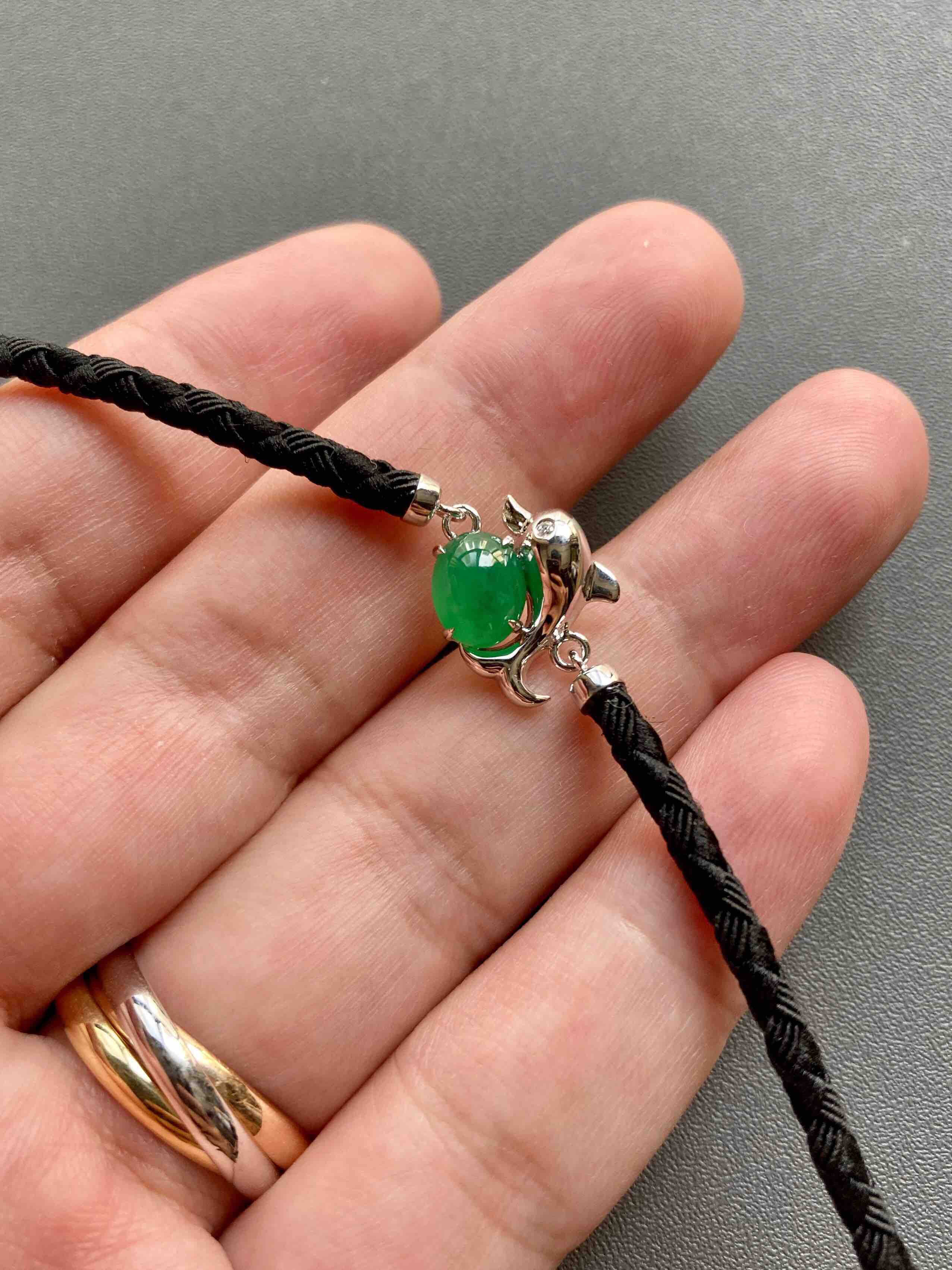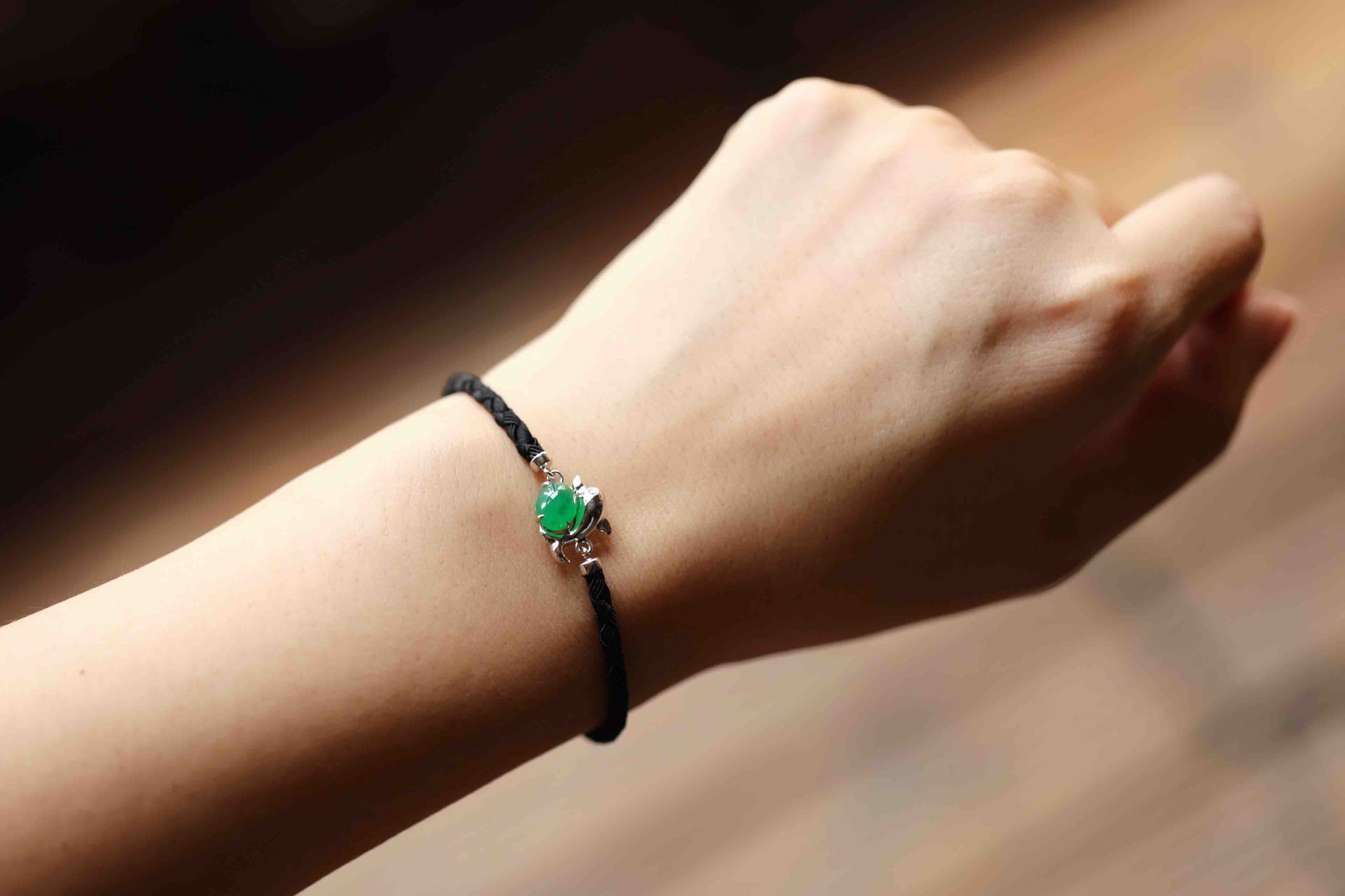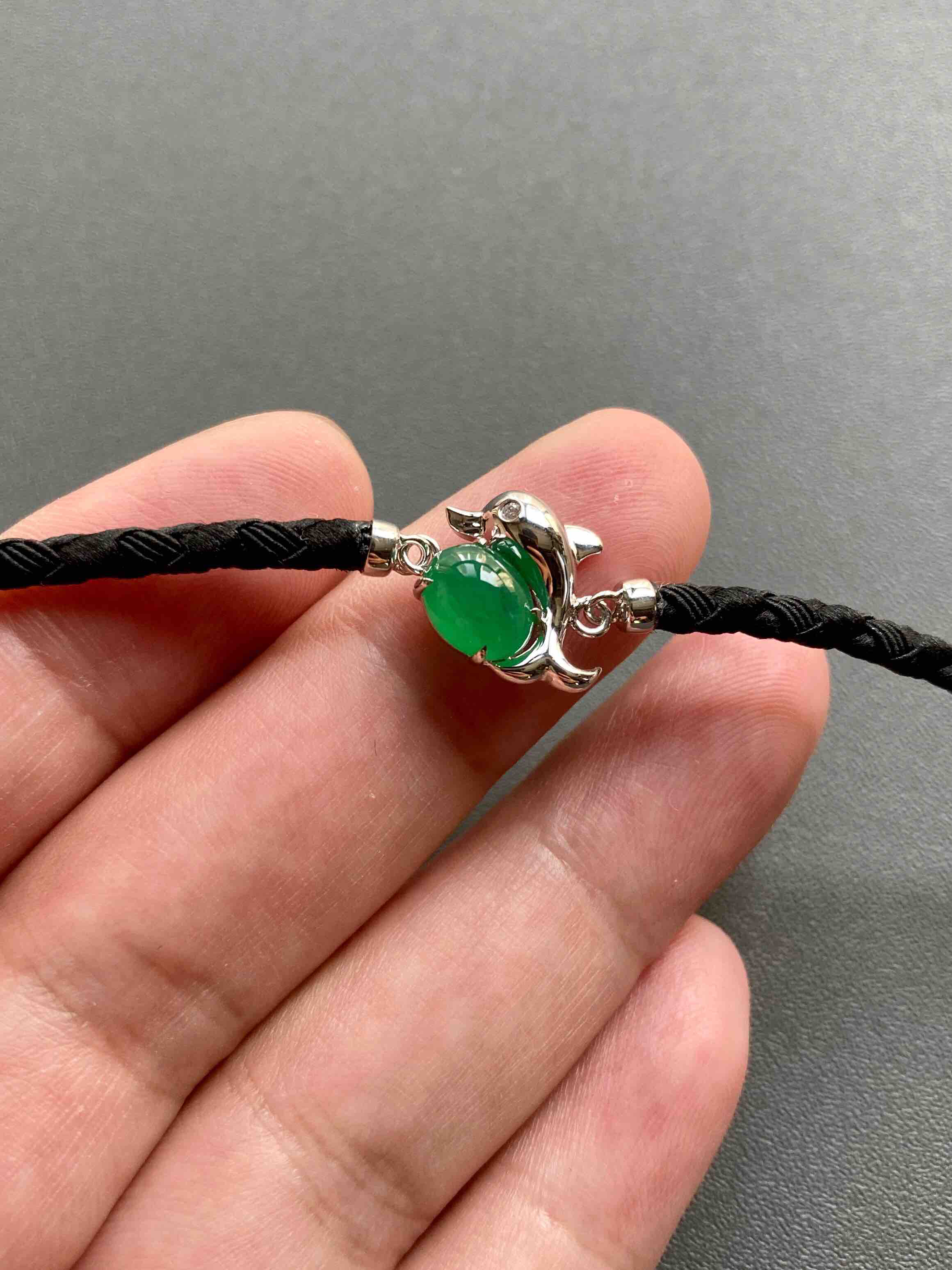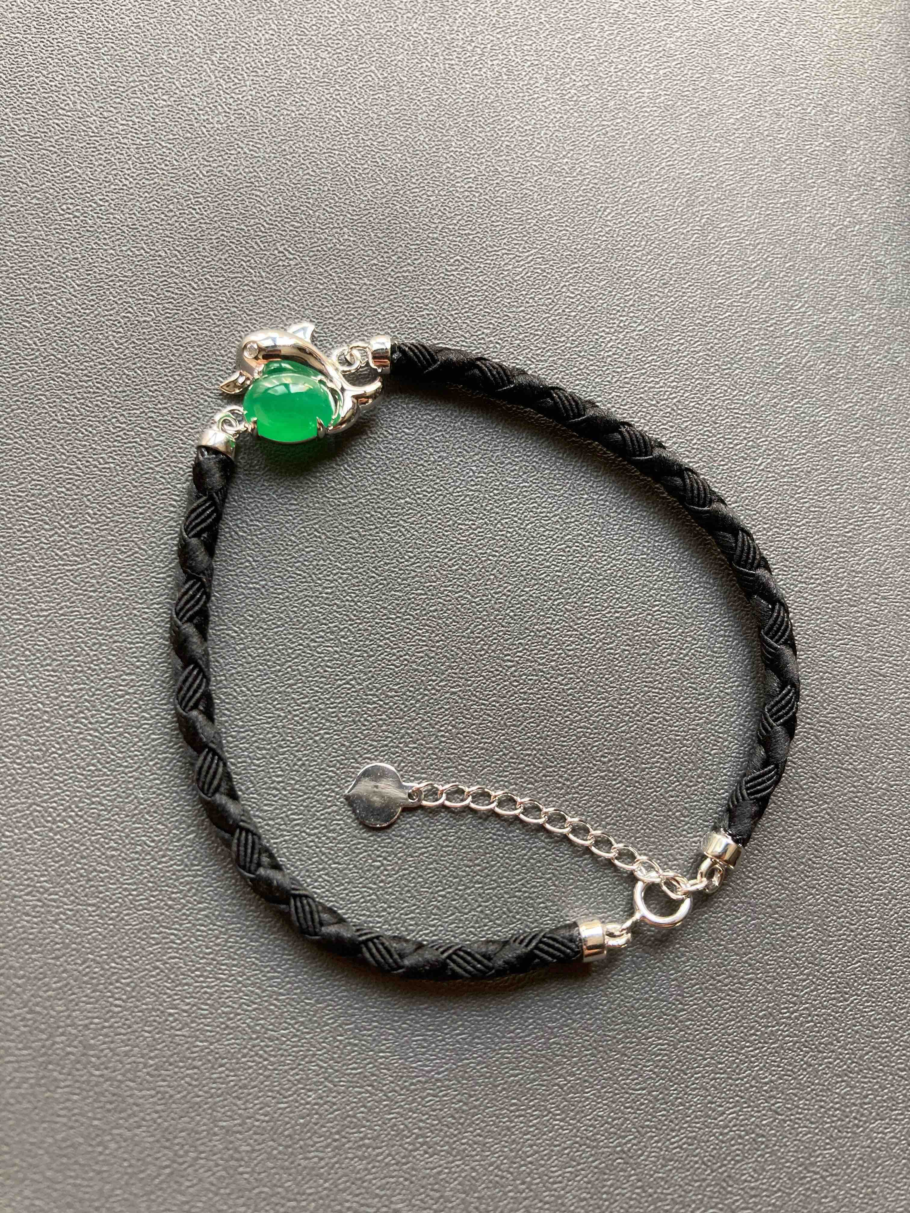 冰种阳绿翡翠蛋面海豚手链18k白金镶嵌,它是如此特别,翡翠禄来原创设计系列,标本级的冰种阳绿翡翠蛋面打造,7.6×6×4mm,种水晶莹剔透,起荧光,正阳绿艳丽无比,18k白金镶嵌小海豚,寓意乘风破浪,属于你独一无二的手链,绳子每个配件都是18k金,手绳长15.5cm加3cm延长链