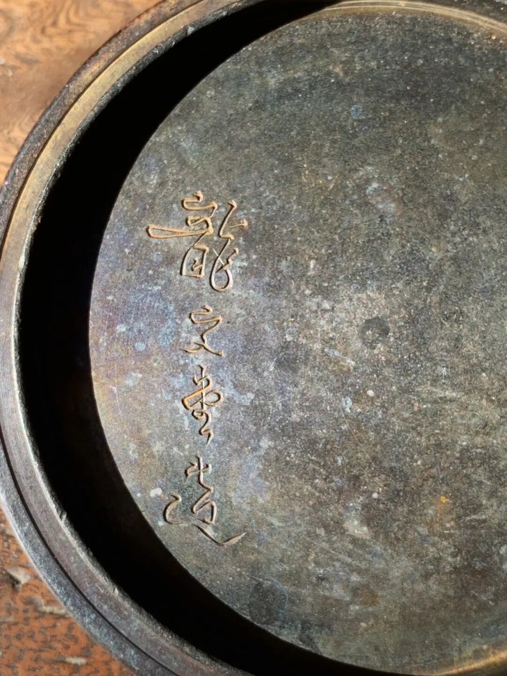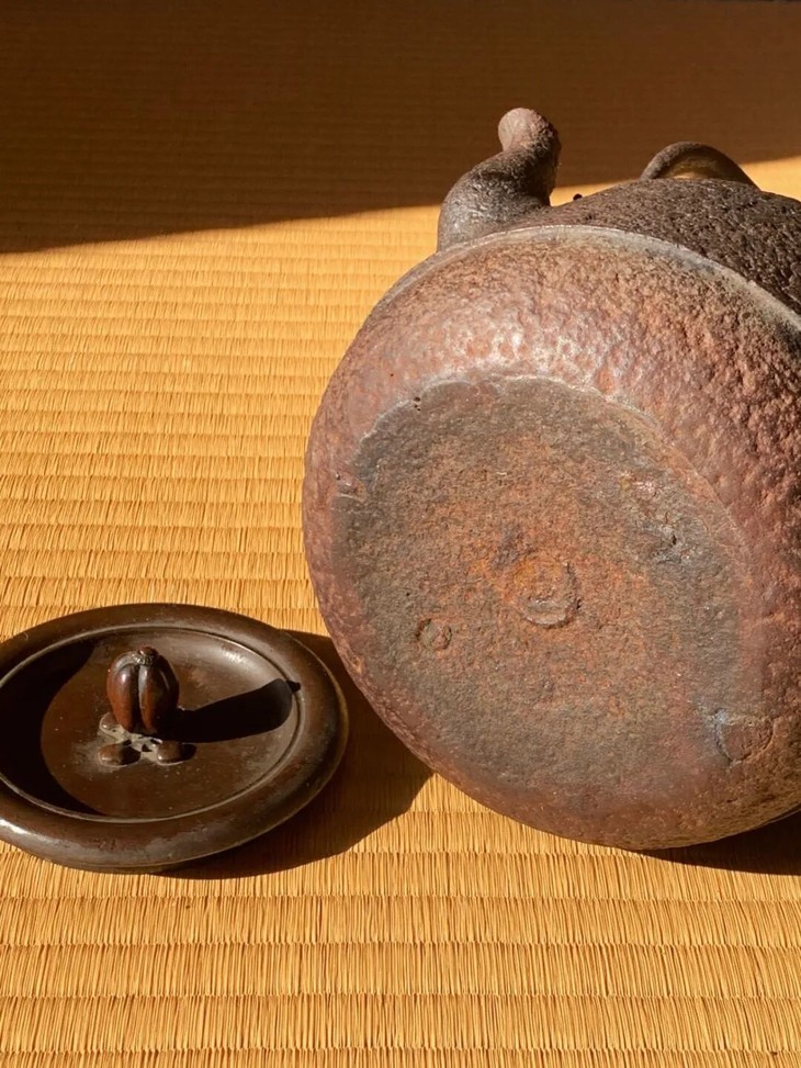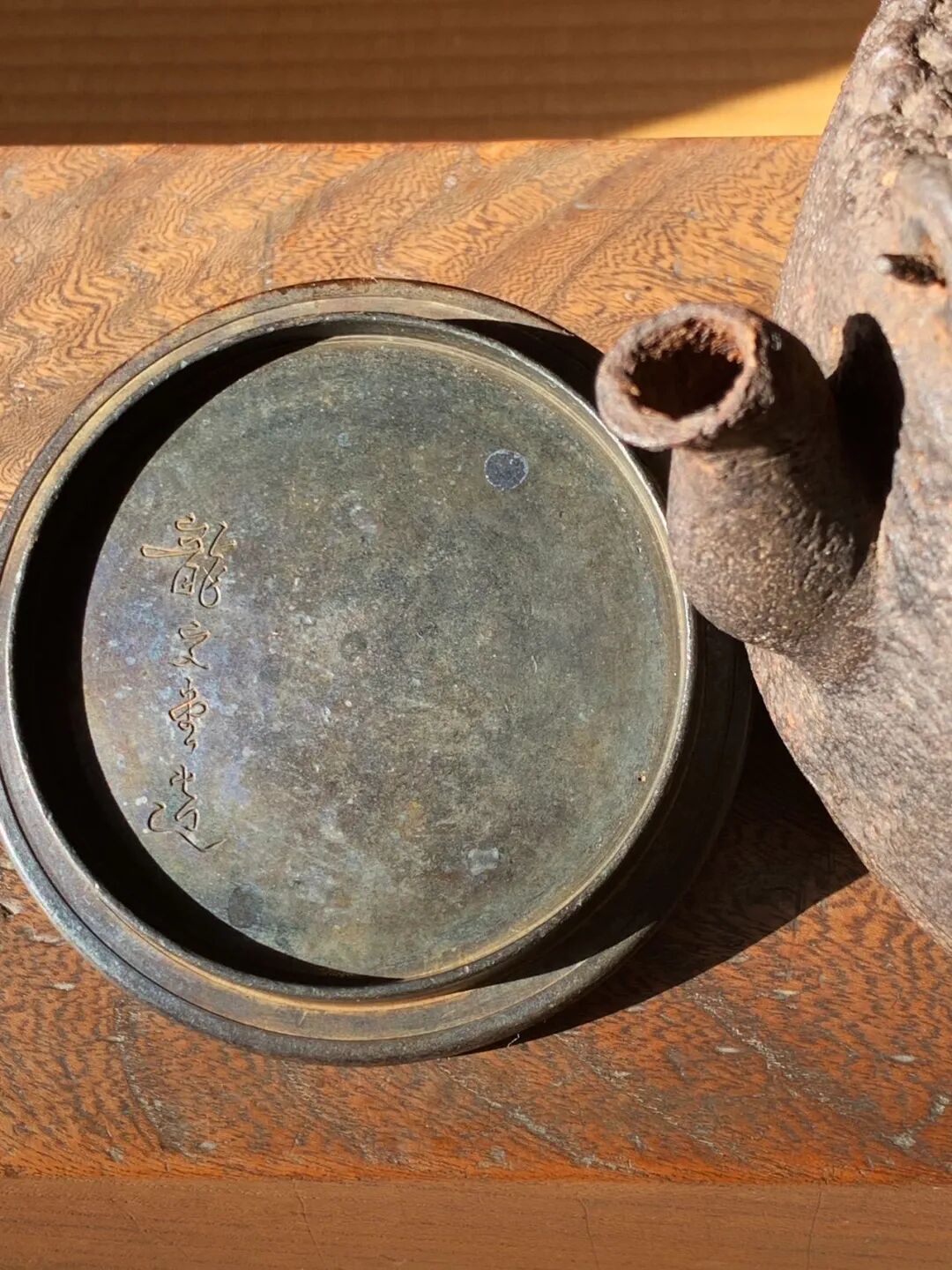 这是一件比较少见的树皮纹茶道老铁提梁壶,这只茶席烧水用的铁壶造型饱满圆型壶身,环绕壶深树皮肌理纹,壶身下方与底部光素无纹,口沿下凹造型设计独特,铜质壶盖上方瓜棱珠钮,盖底阴刻行书体“龍文堂造”作坊款,尺寸适中,容量约一千三百豪升,壶身上葵花形提梁,一侧壶流,树皮纹饰精緻铸造细腻,铁表皮肌理温润且覆以长年累积之深黑包浆皮壳,,器身内部与底部表面锈色斑驳粗糙,如此造型简约大气,纹饰精彩雅緻的提梁铁壶是年代老的茶道煮水器,“龍文堂”是京都的老字号铁壶品牌。