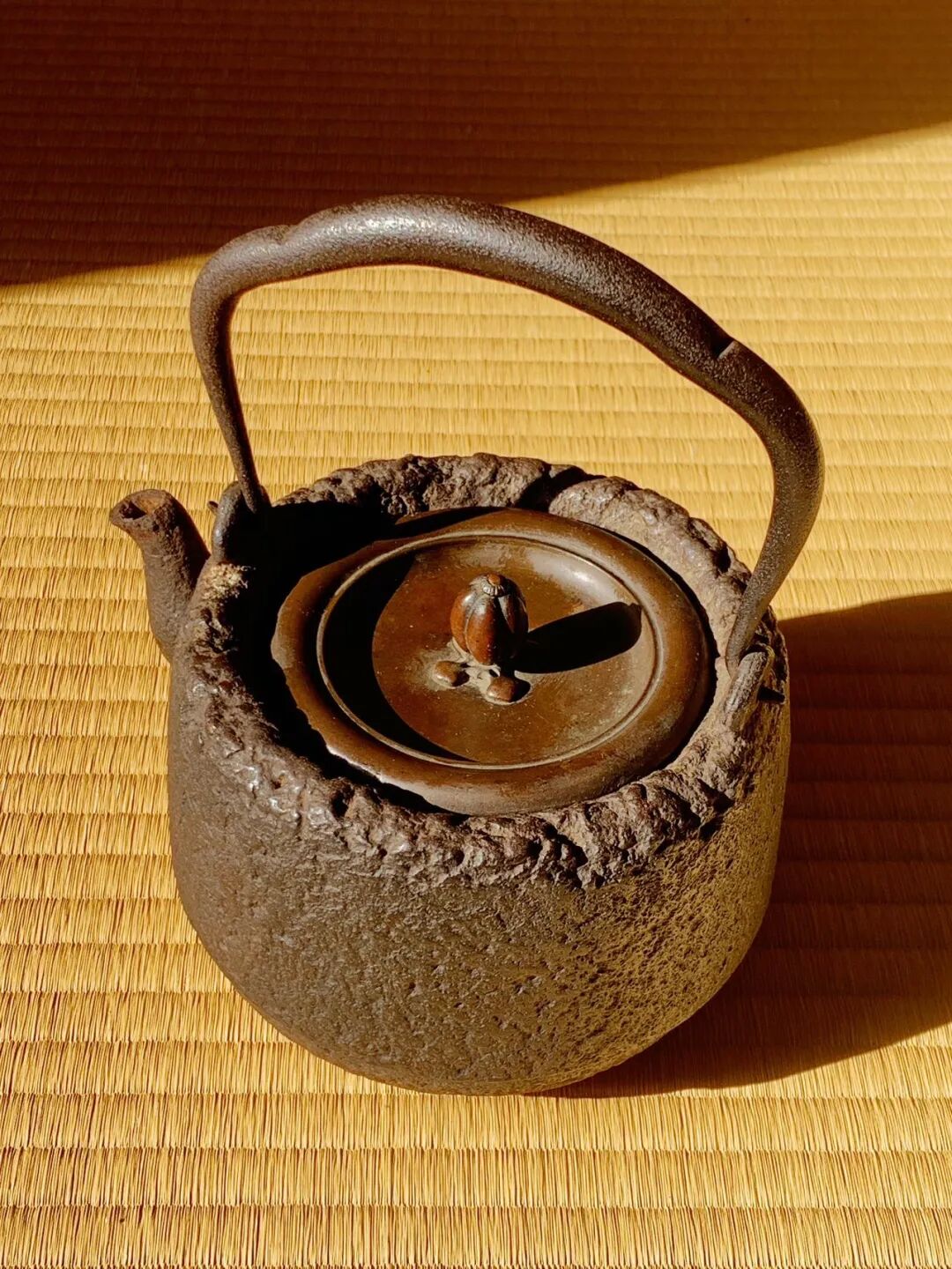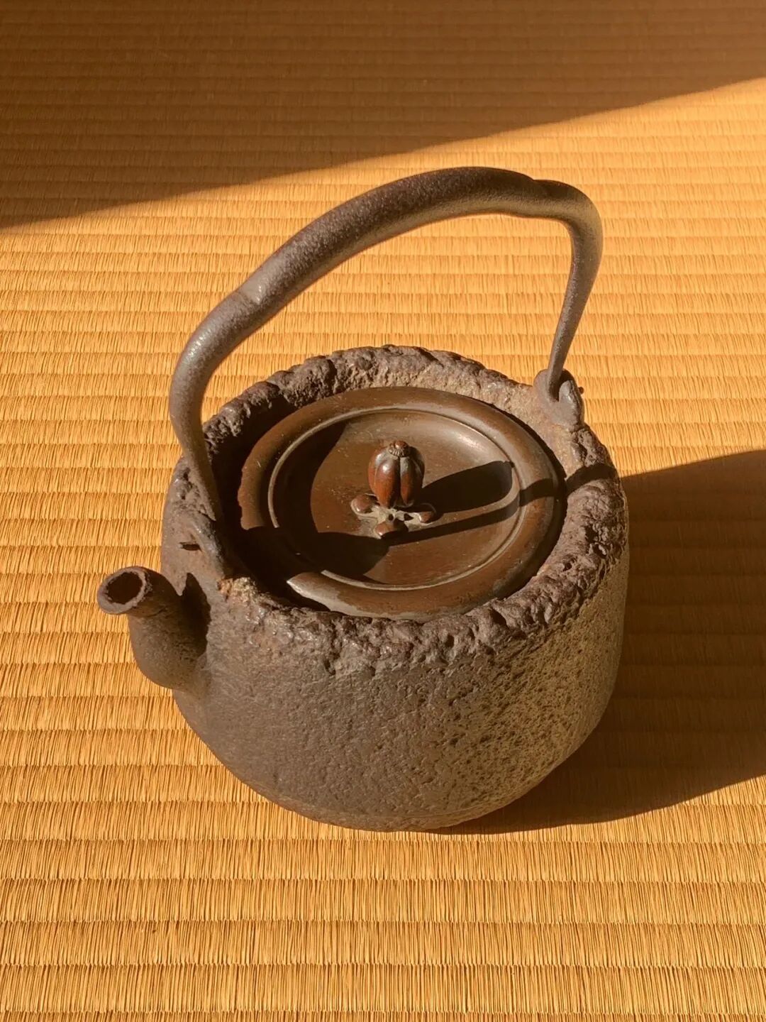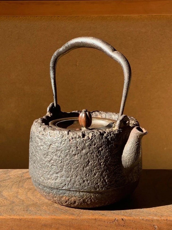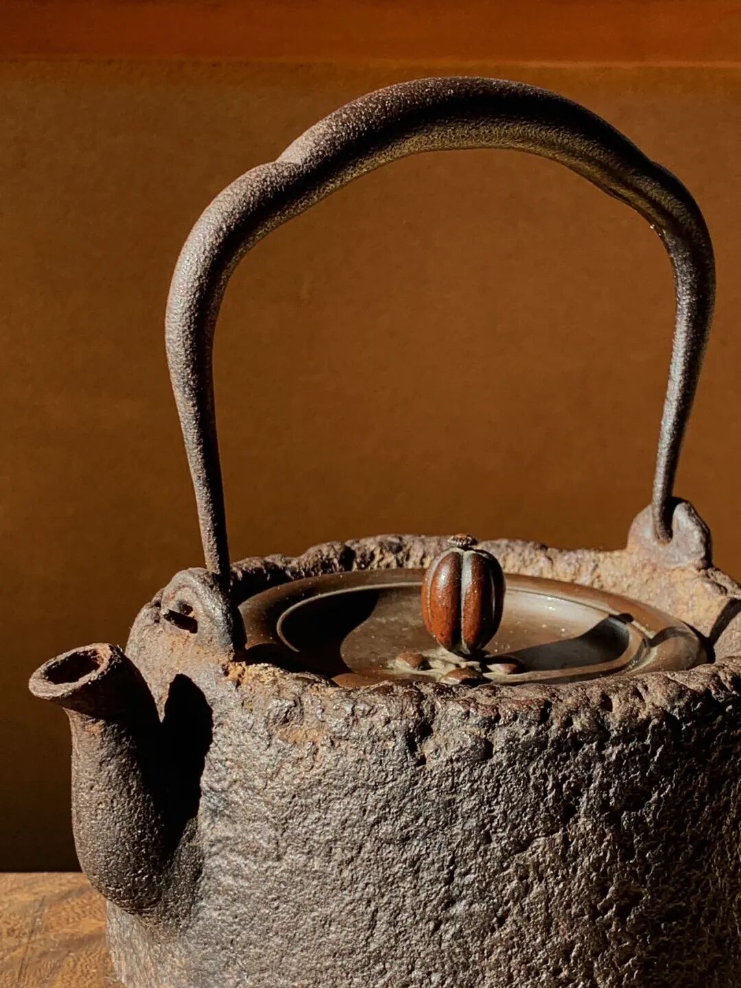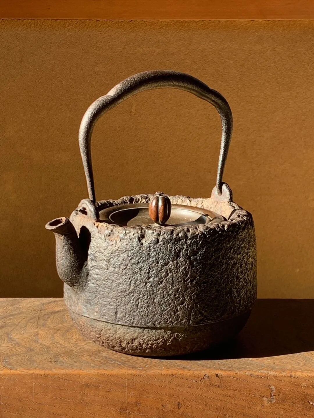 此树皮纹茶道老提梁铁壶,其器型优美,纹饰精美,因年代久远斑驳铁锈与深黑皮壳相间自然,是可以当空间陈设的高雅器物,也是茶席烧水的实用茶道具。