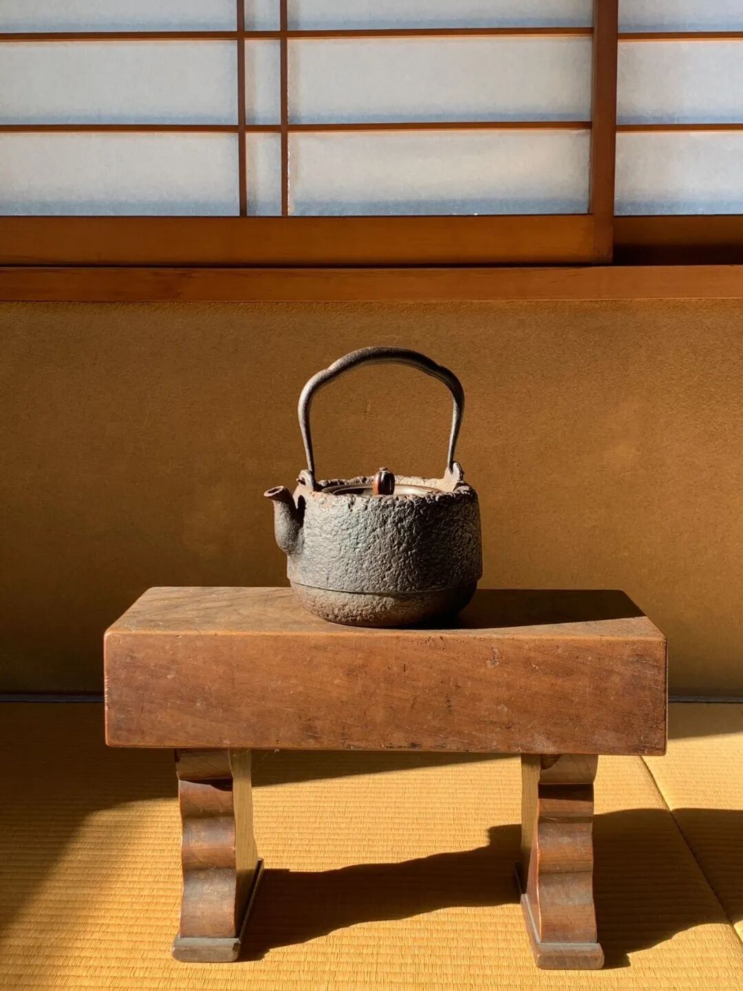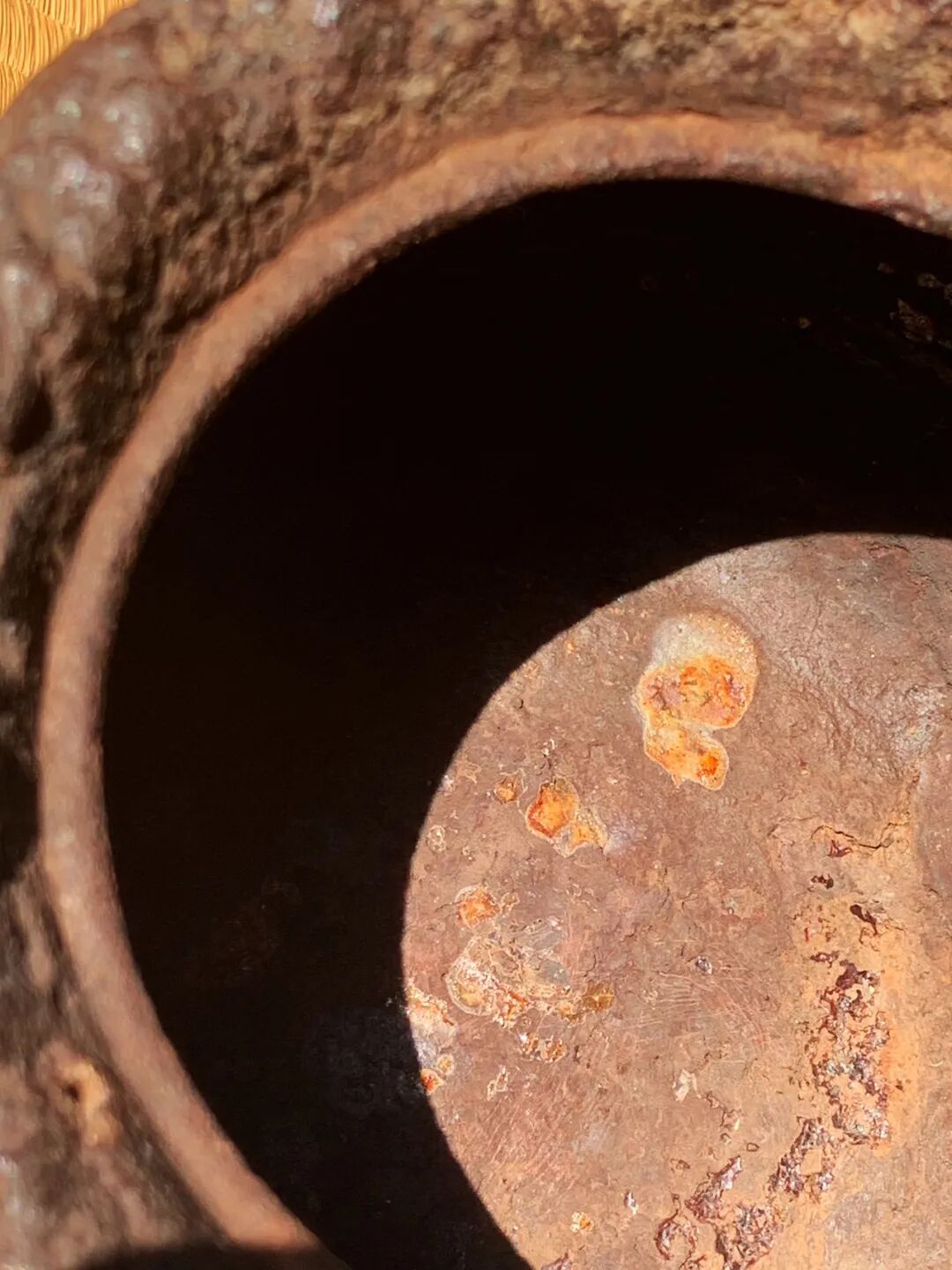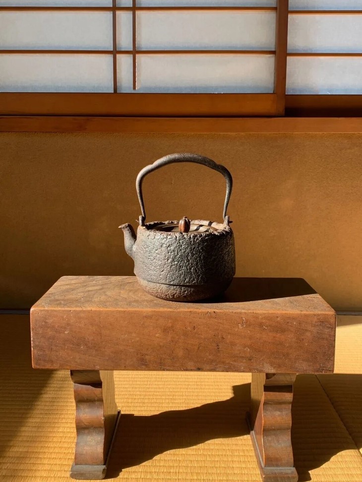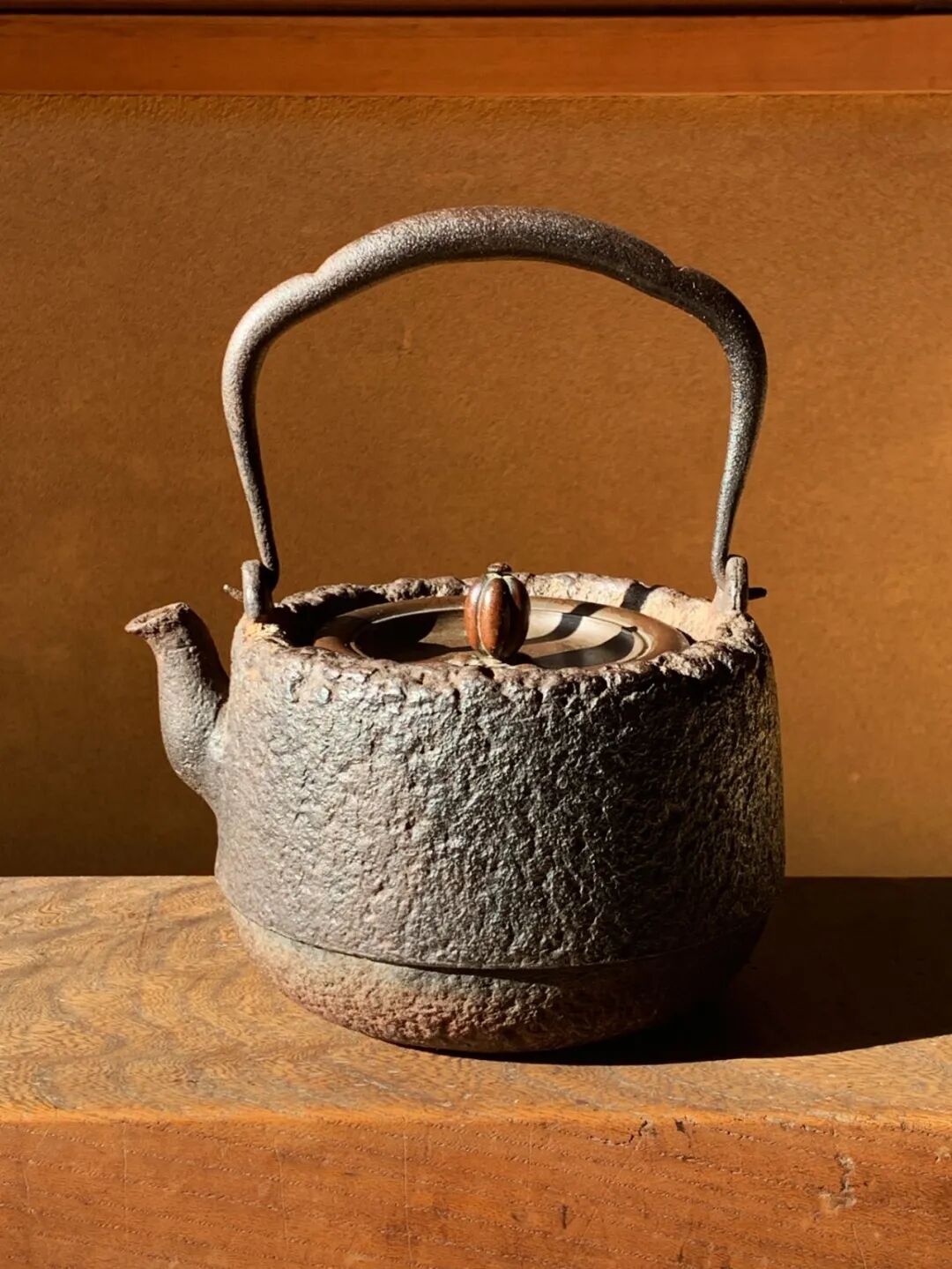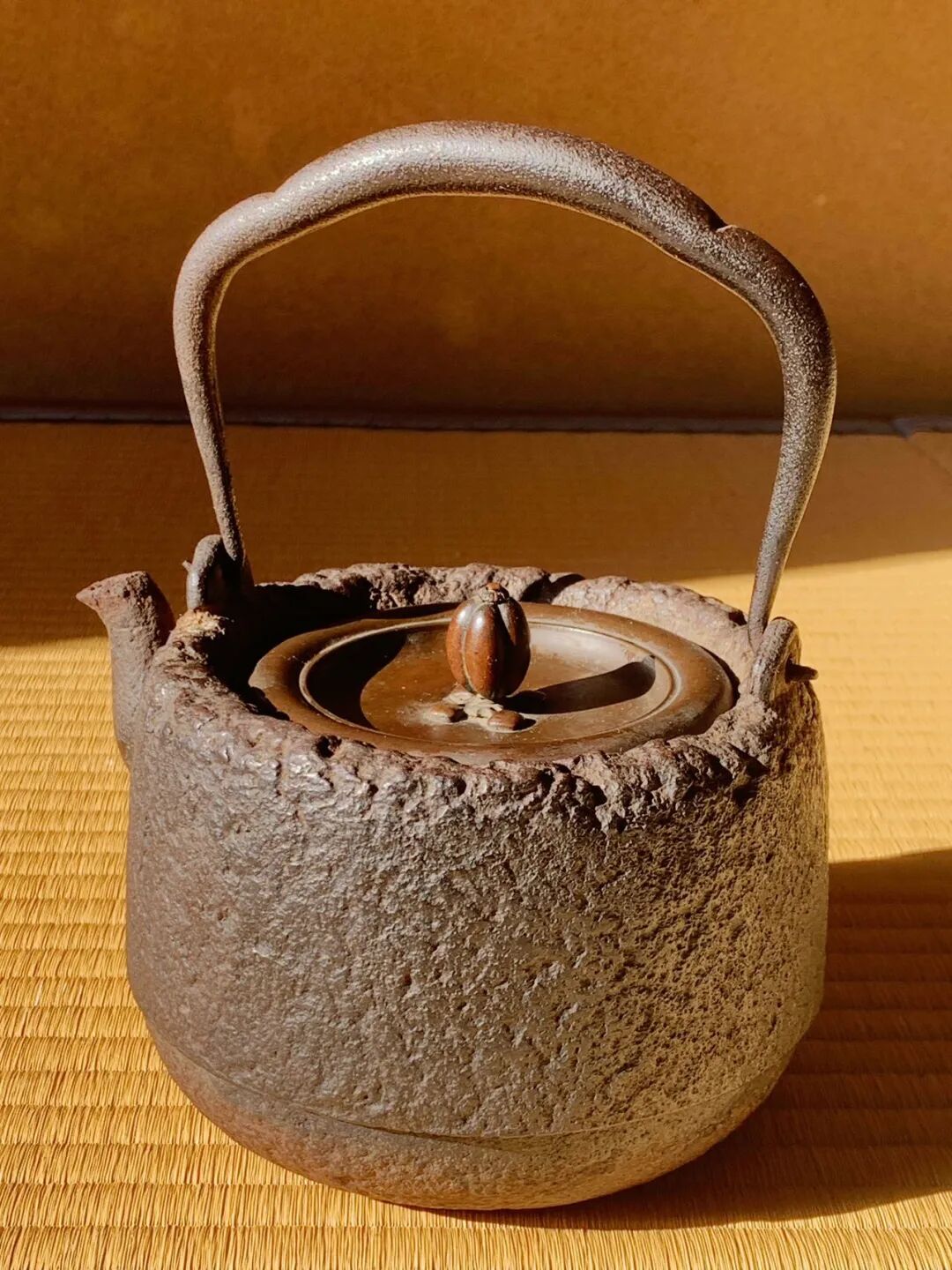 此树皮纹茶道老提梁铁壶,其器型优美,纹饰精美,因年代久远斑驳铁锈与深黑皮壳相间自然,是可以当空间陈设的高雅器物,也是茶席烧水的实用茶道具。
