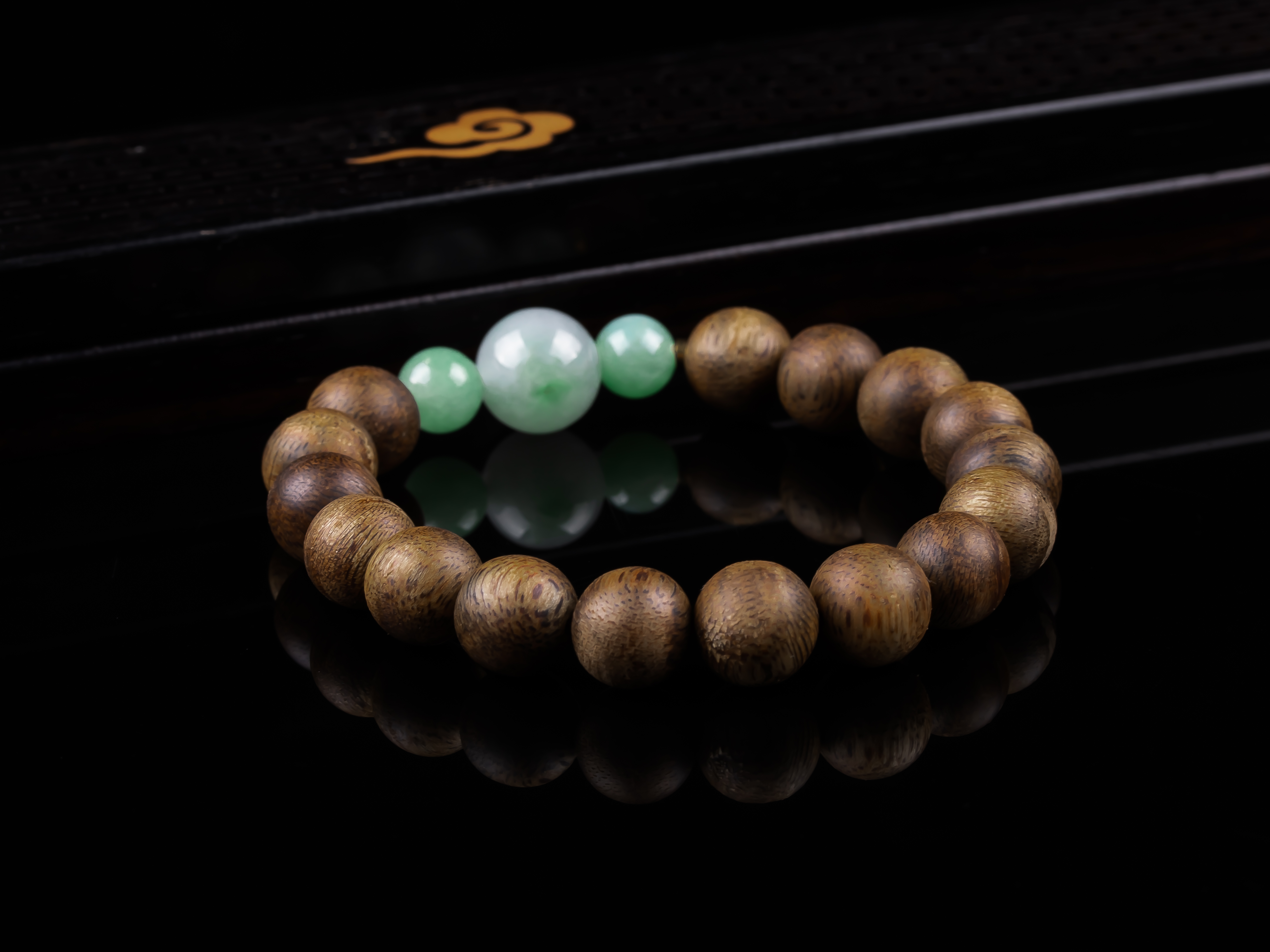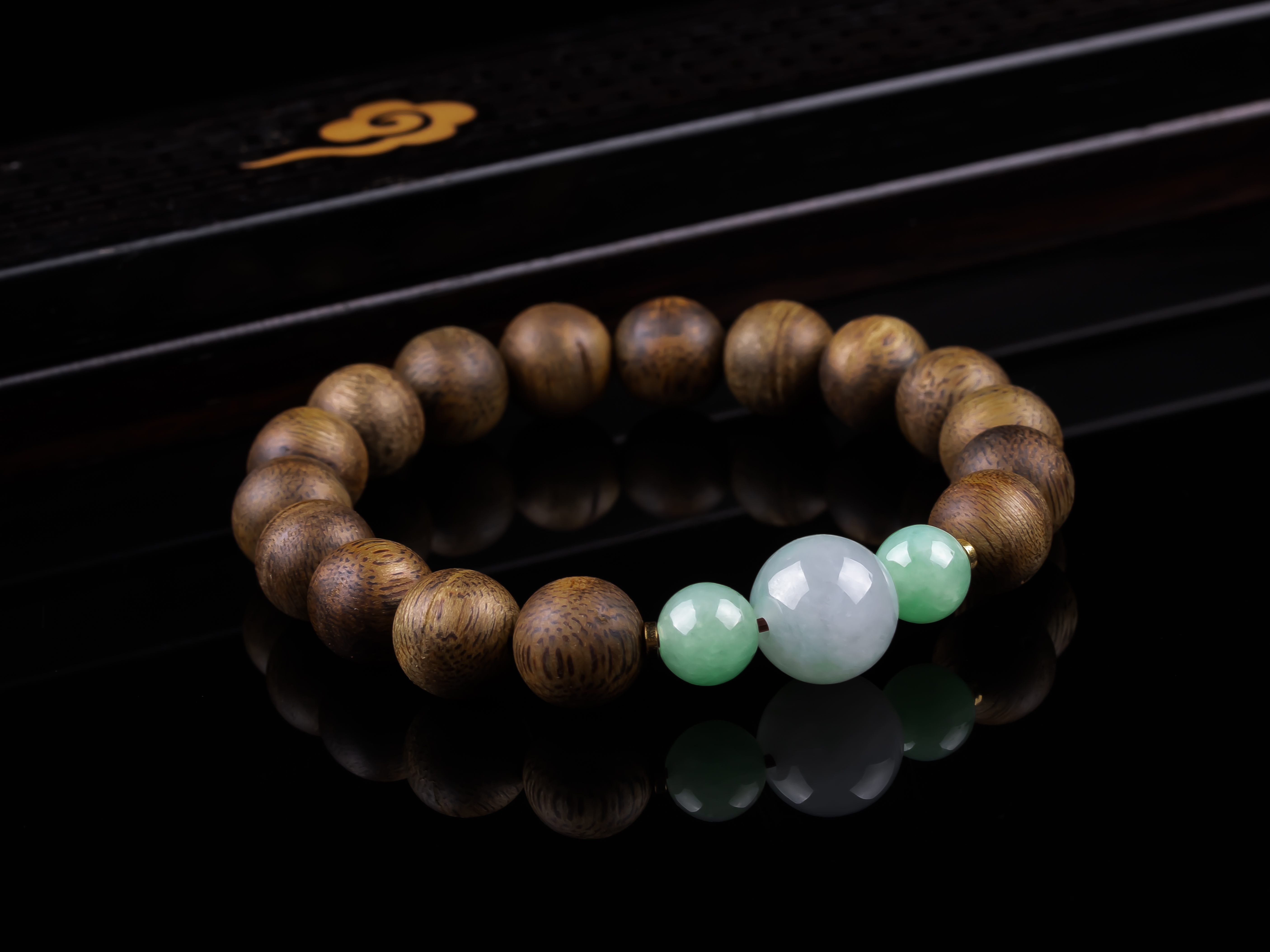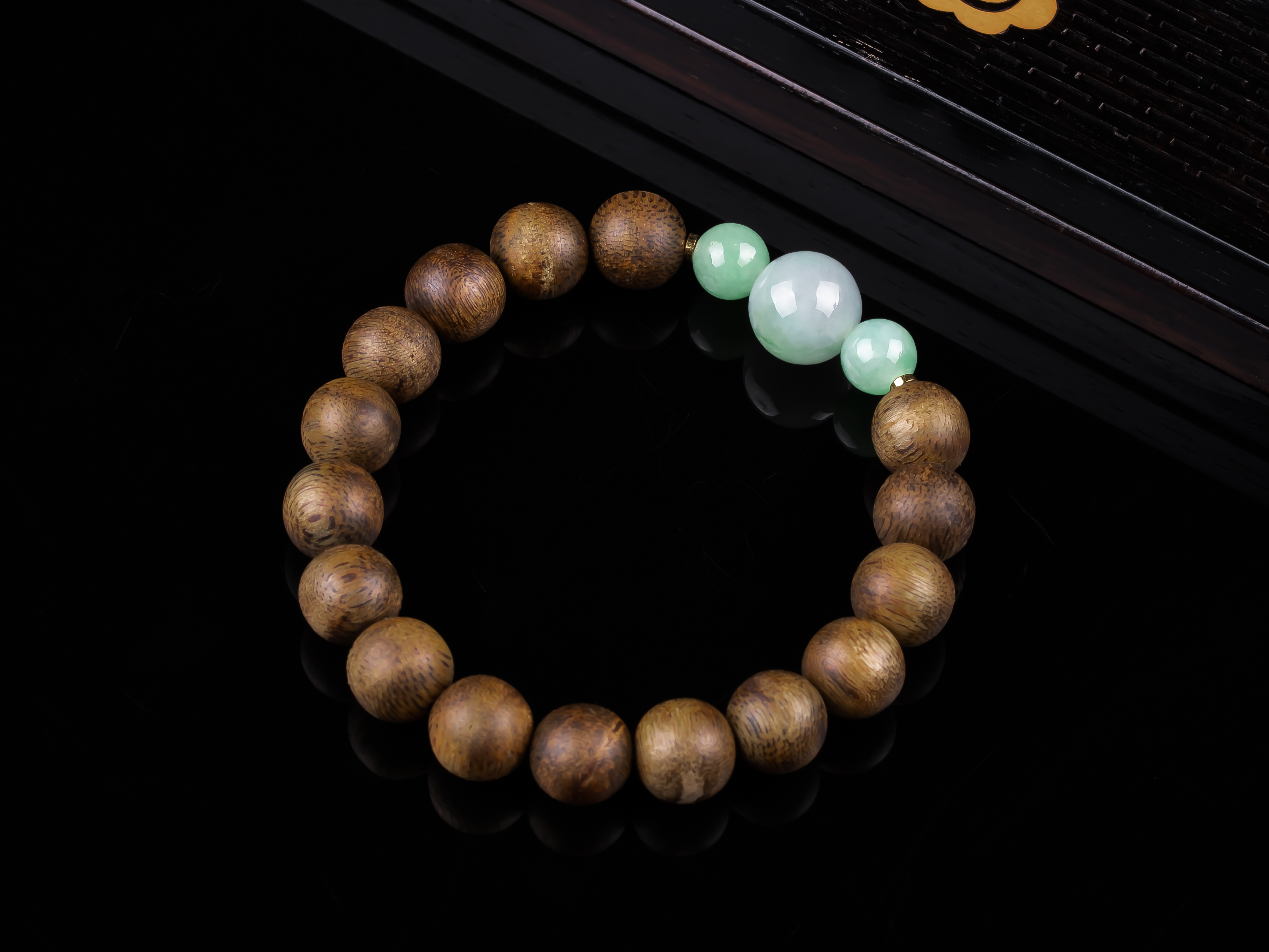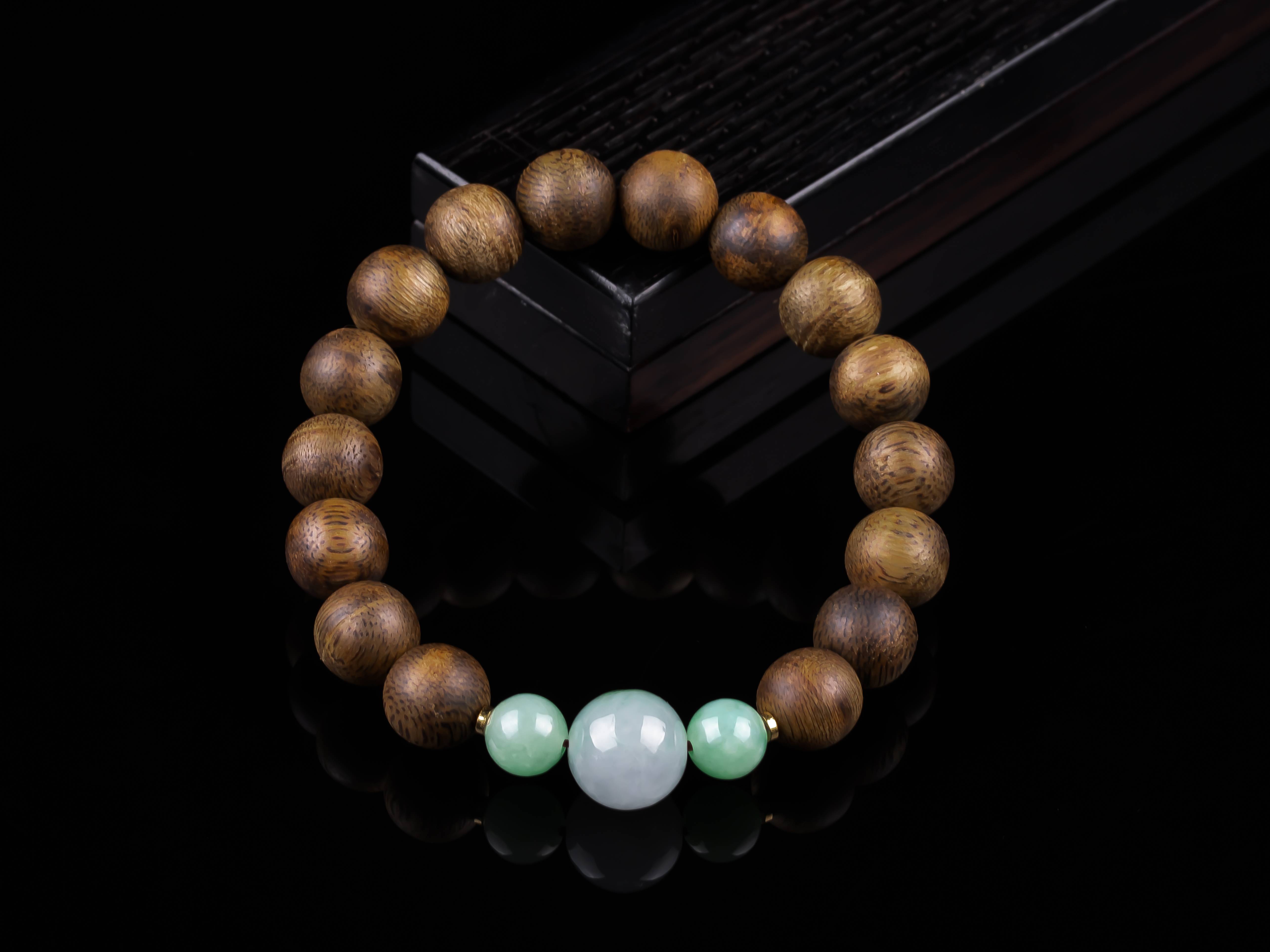 XY0330沉香+翡翠三和手串,天然沉香约10.3mm,原色原味,香味自然清甜,三颗冰底翡翠一大两小,是乃天和地和人和,三和,也是和谐和美和顺,上手大方有气质。