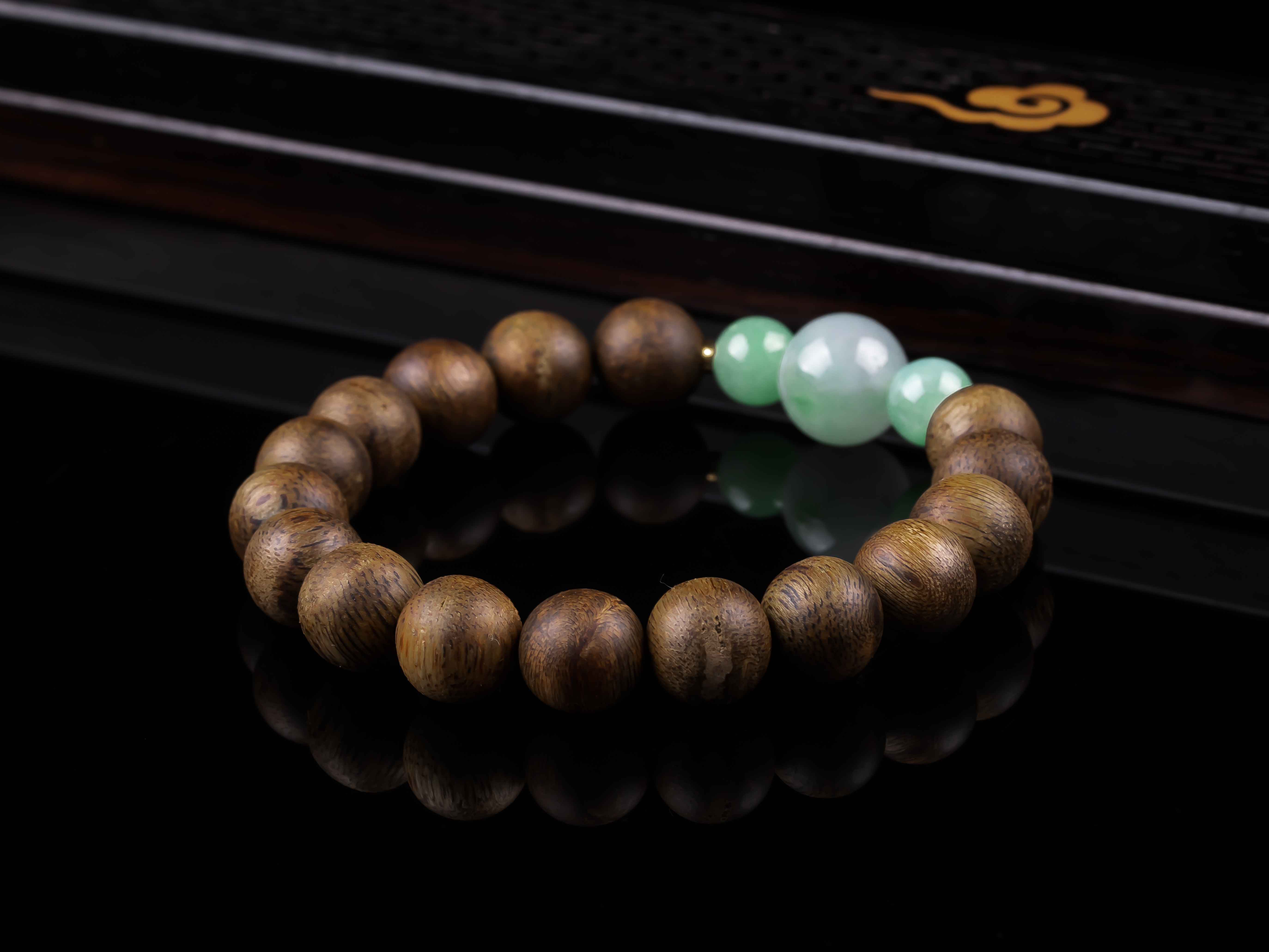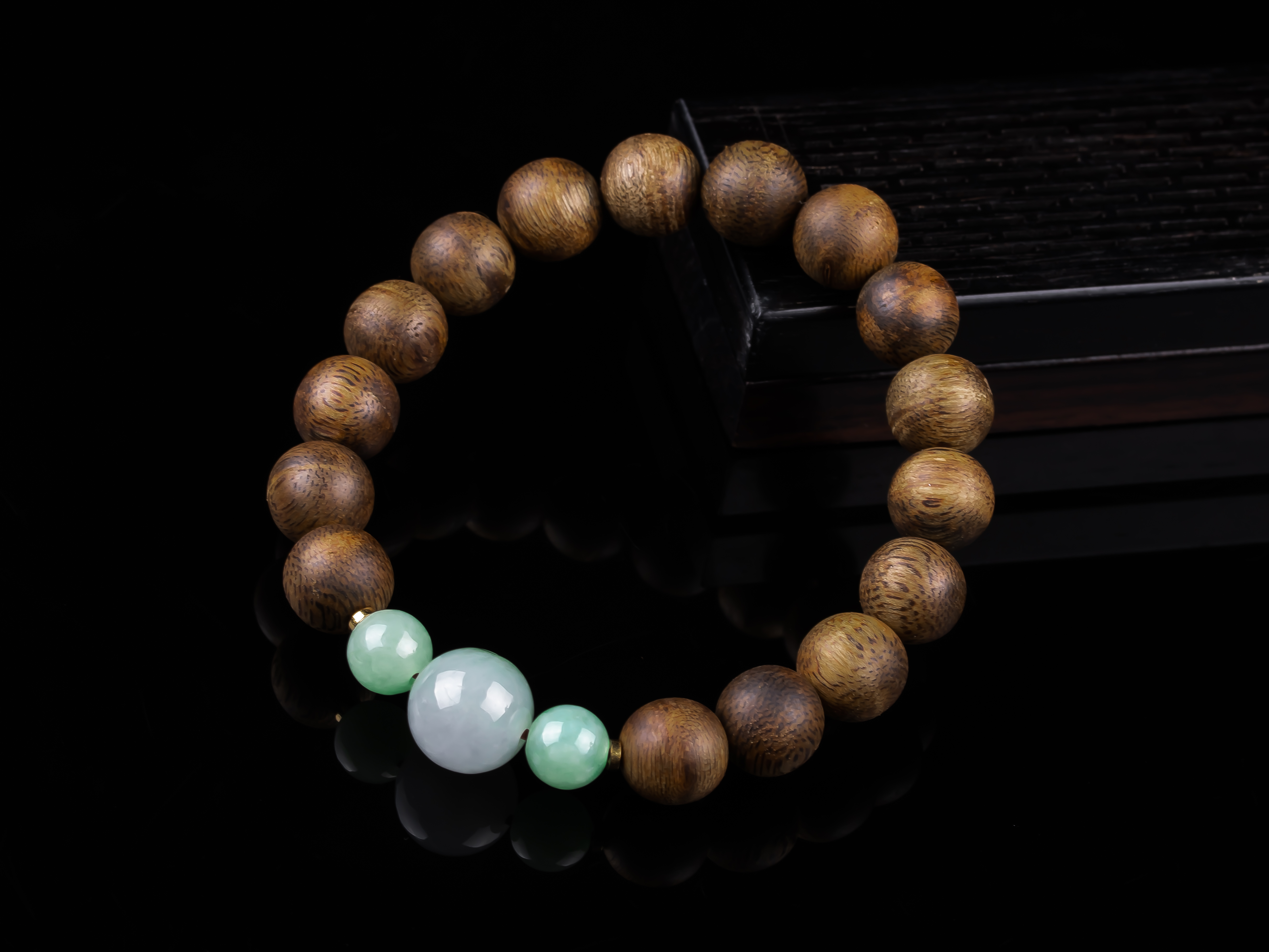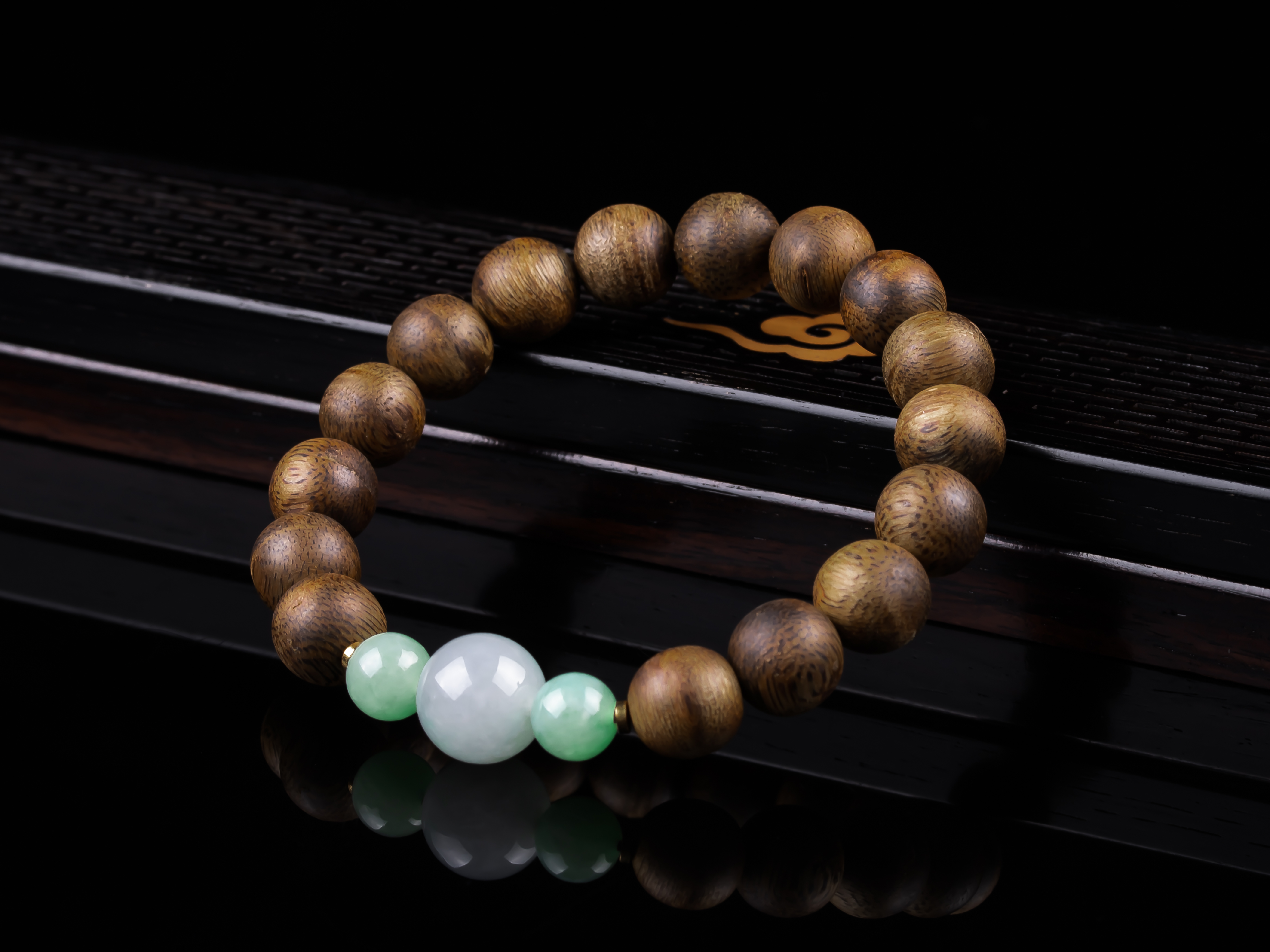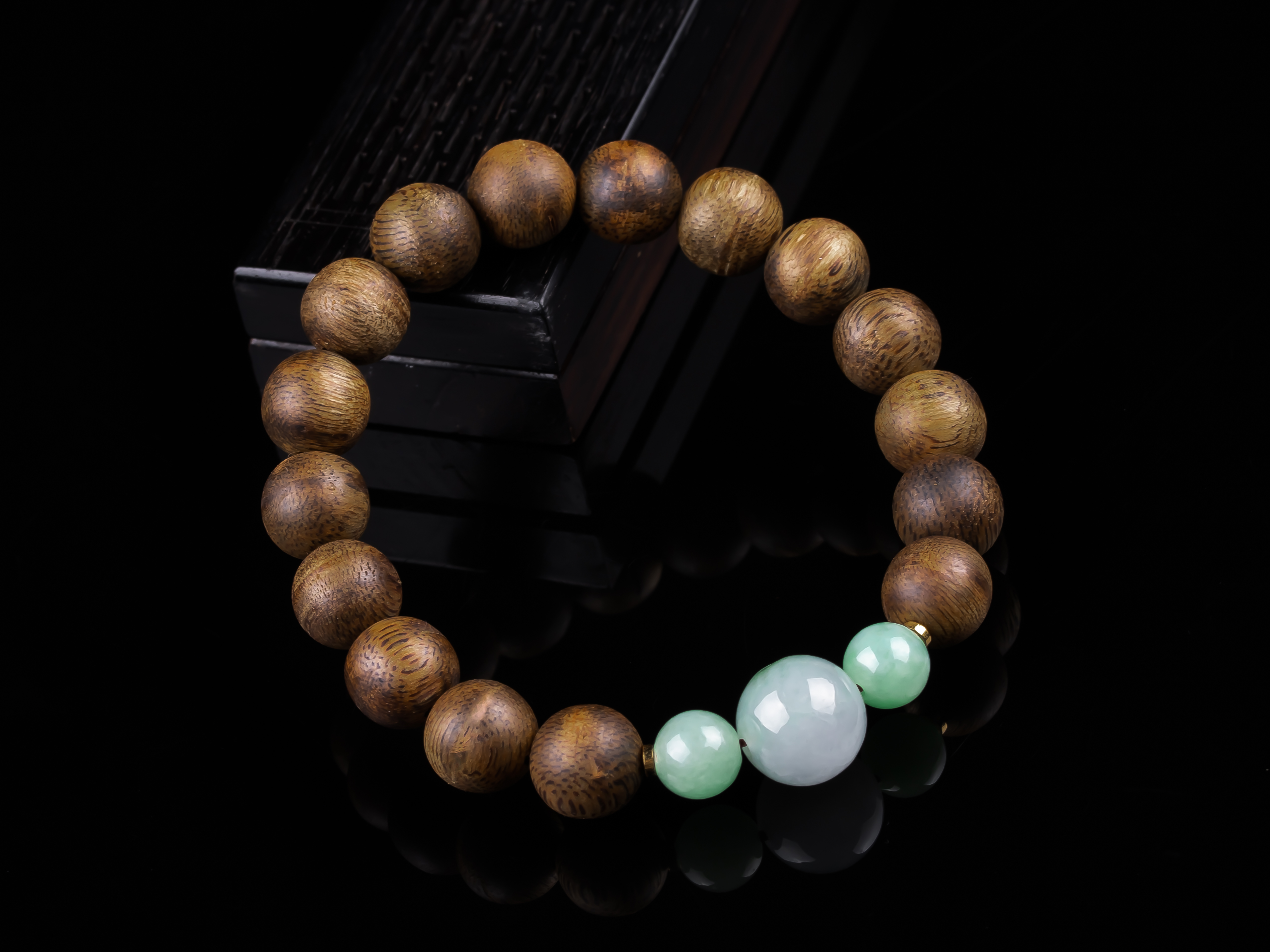 XY0330沉香+翡翠三和手串,天然沉香约10.3mm,原色原味,香味自然清甜,三颗冰底翡翠一大两小,是乃天和地和人和,三和,也是和谐和美和顺,上手大方有气质。
