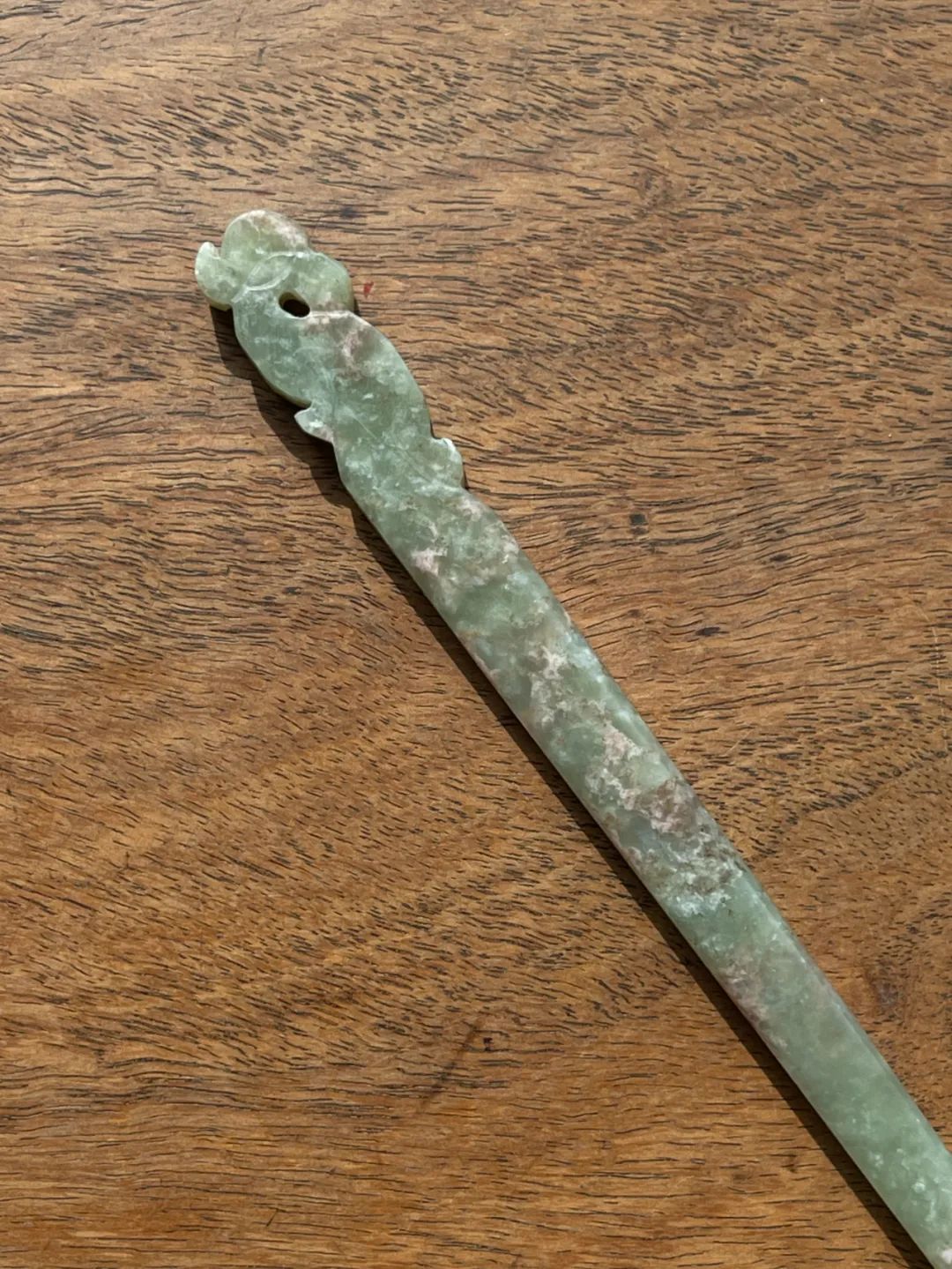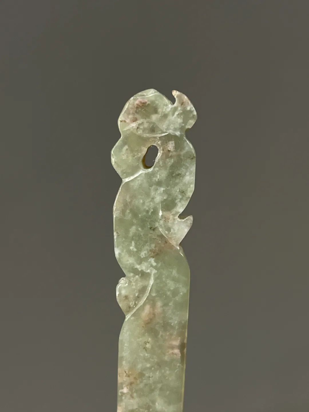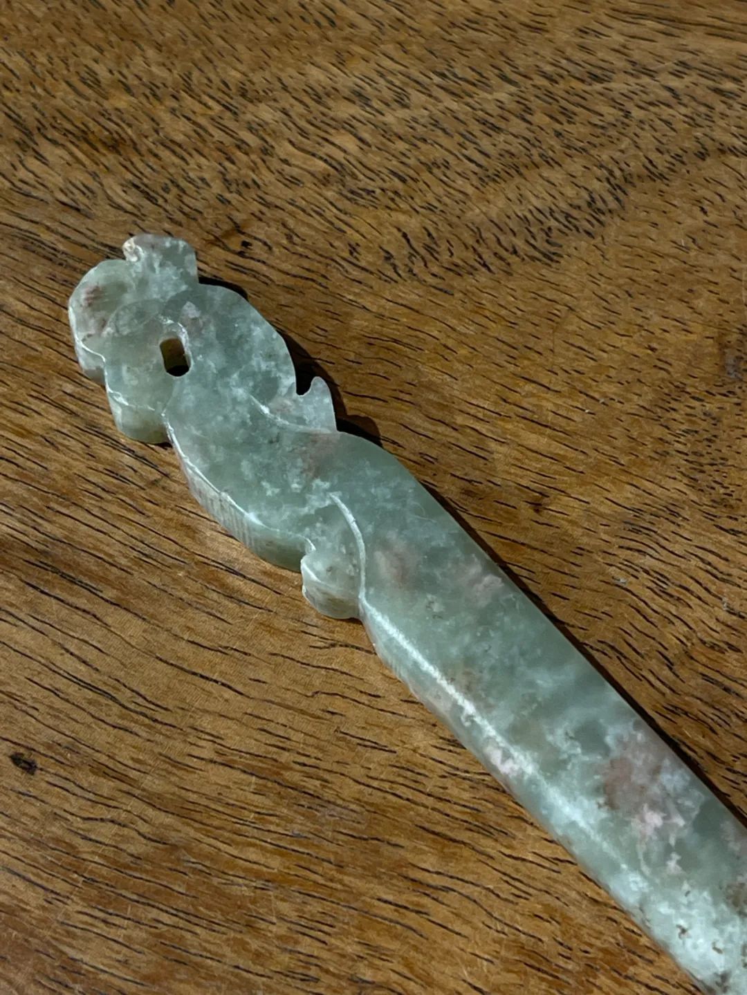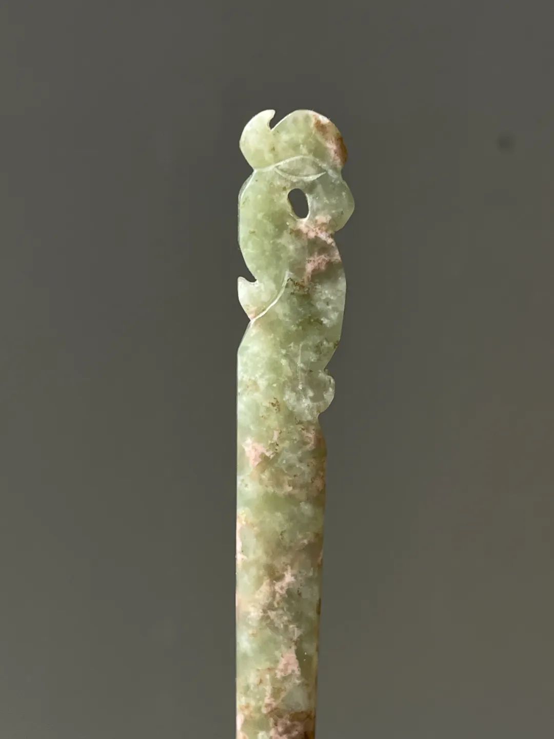 此件选材上乘、造型貴气典雅且工艺精湛的和田碧玉花卉钮发簪,入手即可当发簪,风格极简贵气,绝对不落俗套,可突显当代女性之高尚品味。 此和田青白玉凤鸟钮发簪,保存完好无损。
