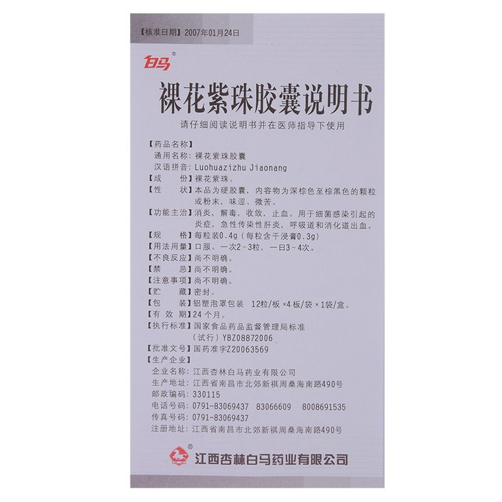 白马 裸花紫珠胶囊 0.4g*48粒/盒 一盒