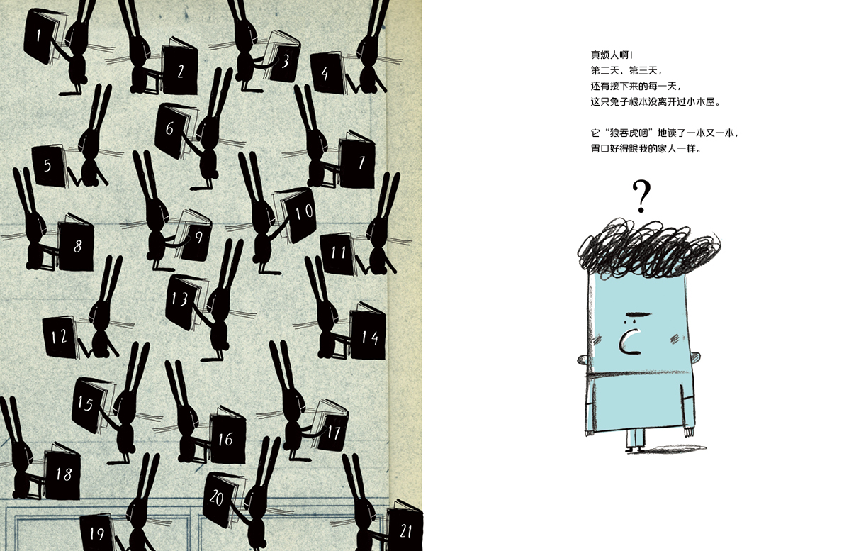 小男孩和全家人不一样,就是不爱读书。他没有办法直视有书本图案的画作,没有办法闻到书本的味道,没有办法忍受它们的存在。比起浪费时间在阅读上,他比较喜欢玩游戏机里的追捕龙的游戏,或者占据整张沙发看电视。所以,他把书扔到远远的地方。但是,一只兔子出现了。他着迷地阅读小男孩扔掉的书,一本接着一本,有时候大笑,有时候大哭,不管小男孩怎么做,就是一动不动。这突然改变了小男孩的想法,他开始想去了解,书到底有什么特别之处呢?