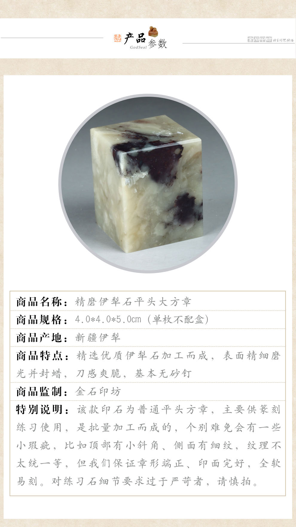【金石印坊】精磨伊犁石平头大方章 4*4*5CM 单枚不配盒 刀感爽脆