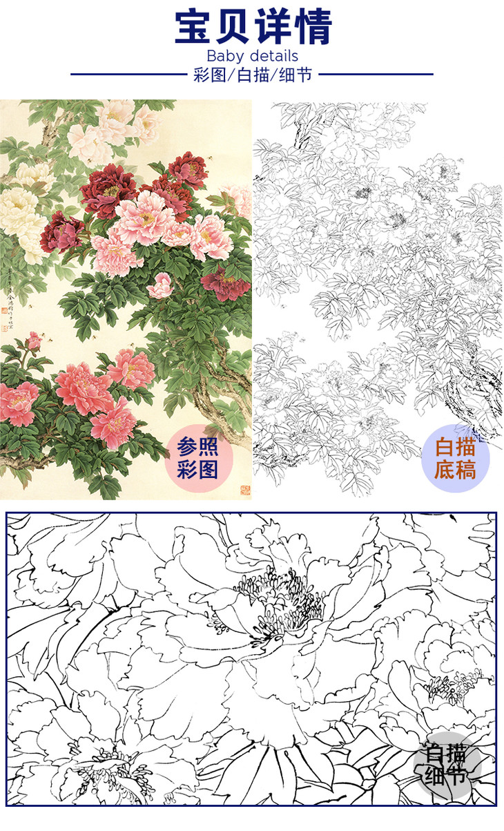 竖幅工笔花鸟白描底稿-牡丹-金鸿钧《繁荣茂盛》-多种白描尺寸可选-JR02