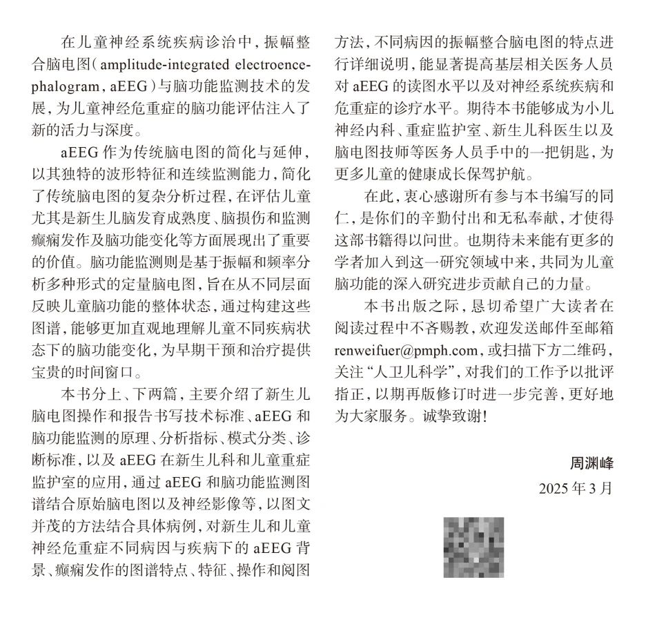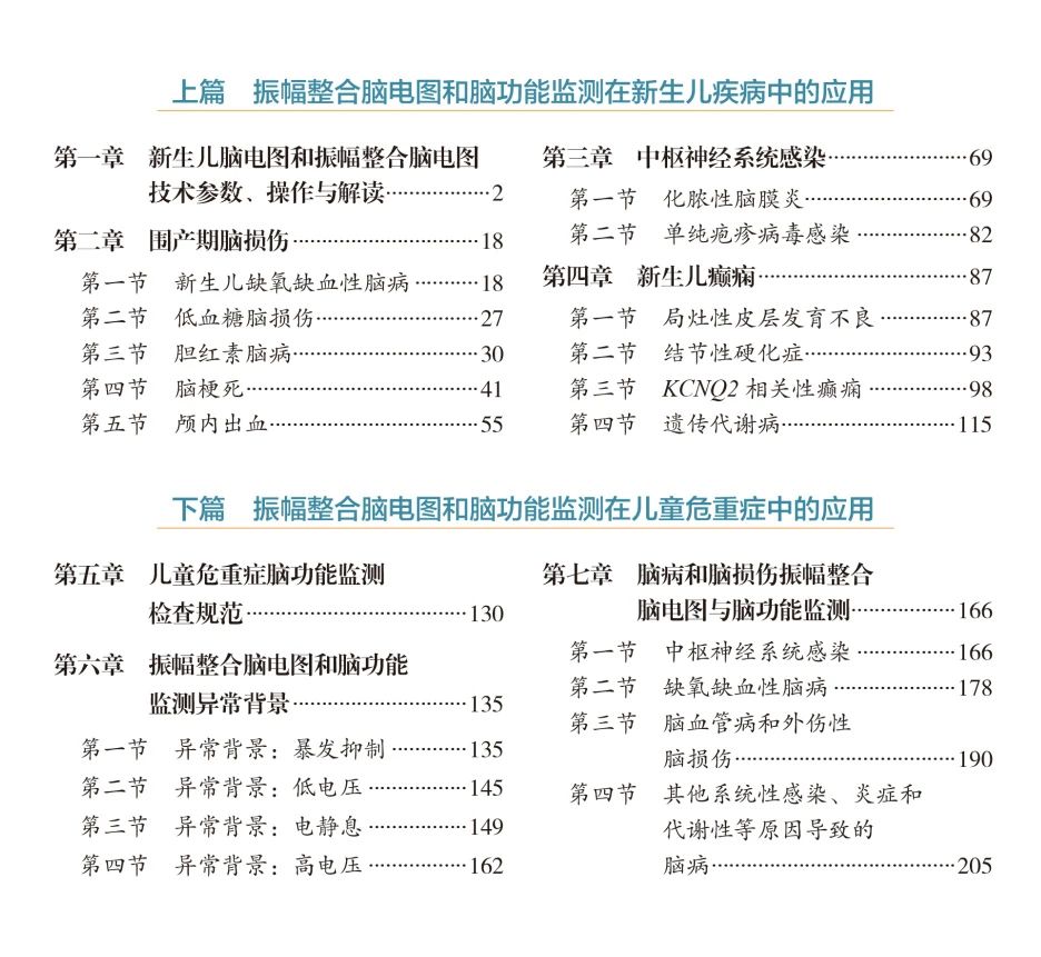 2.本书分上、下两篇,主要介绍新生儿脑电图操作和报告书写技术标准、aEEG和脑功能监测的原理、分析指标、模式分类、诊断标准,以及aEEG在新生儿科和儿童重症监护室的应用,创新性的通过脑电图谱-影像以图文并茂的方法结合具体病例,对新生儿和儿童神经危重症不同病因与疾病下的aEEG背景、癫痫发作的图谱特点、特征、操作和阅图方法,不同病因的振幅整合脑电图的特点进行详细说明。