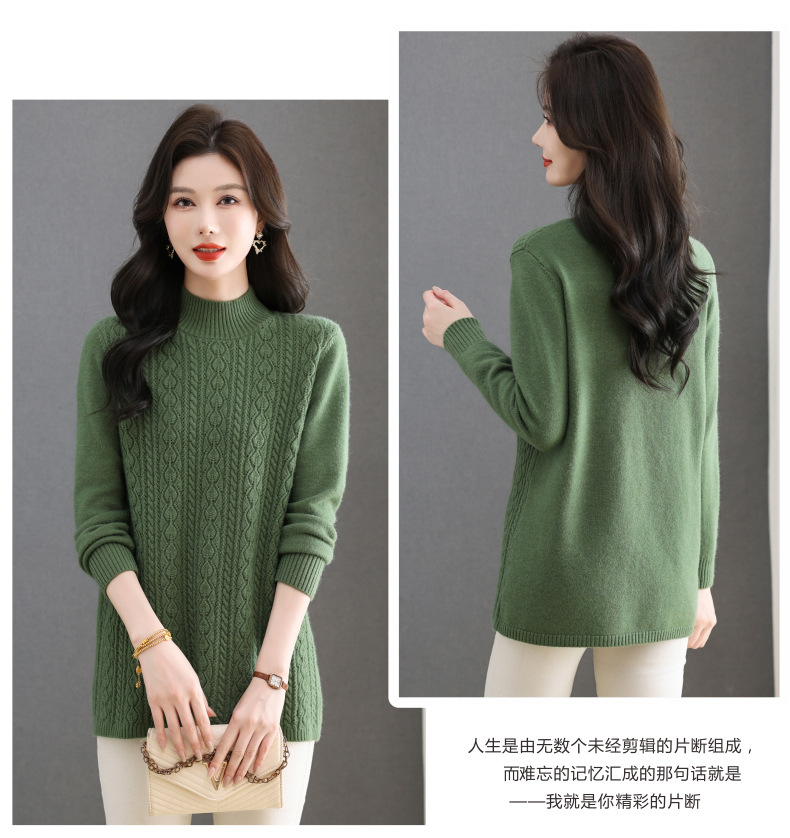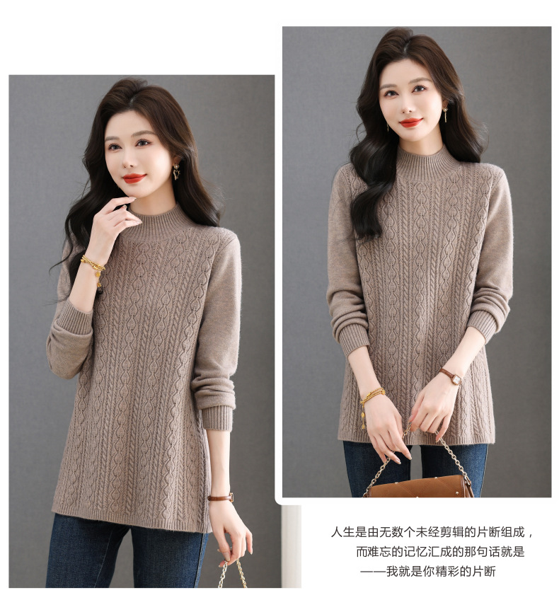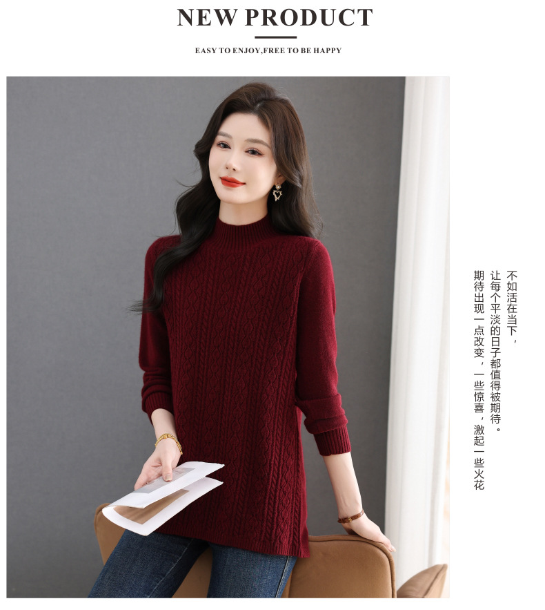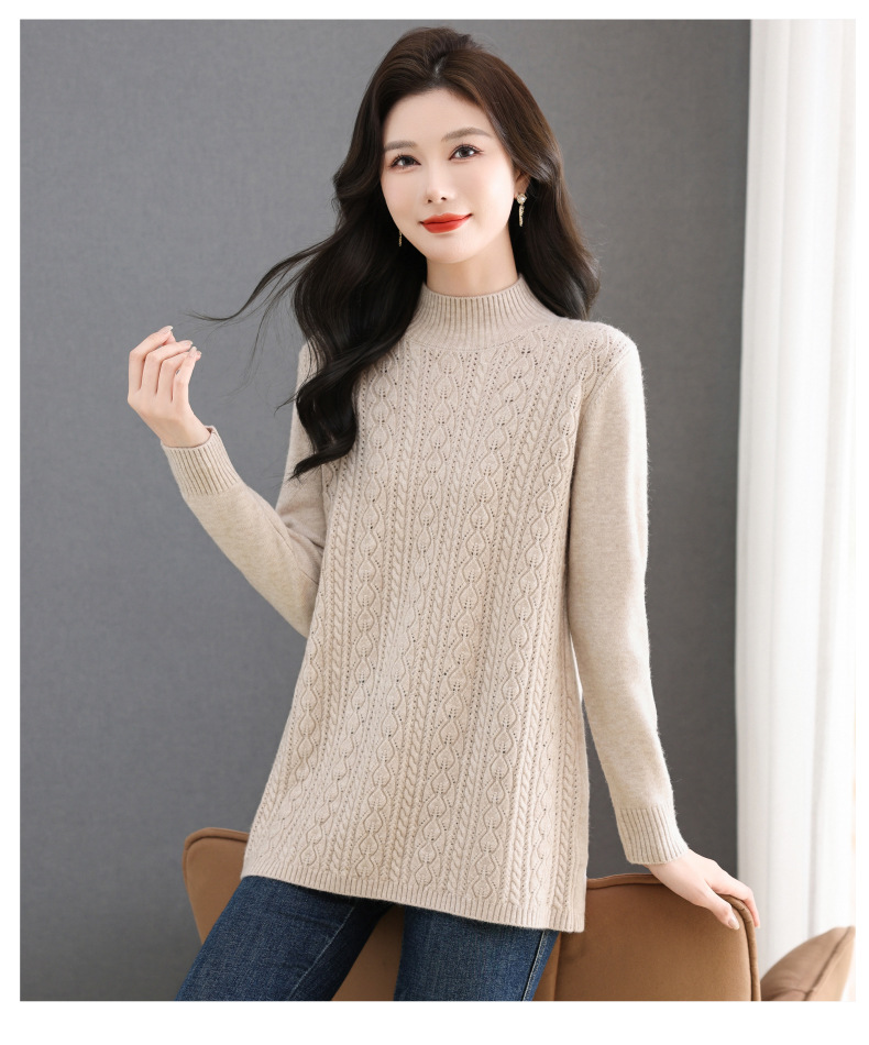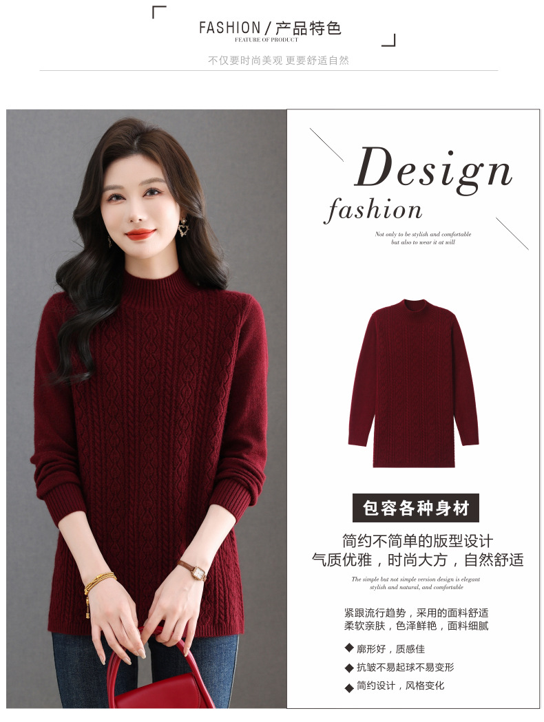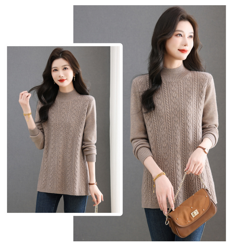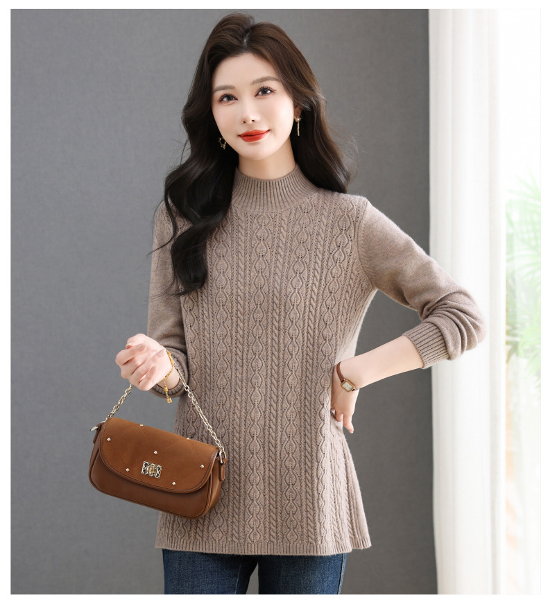CC半高领毛衣女秋冬2025年米白色提花中长款针织衫优雅显瘦打底毛衣