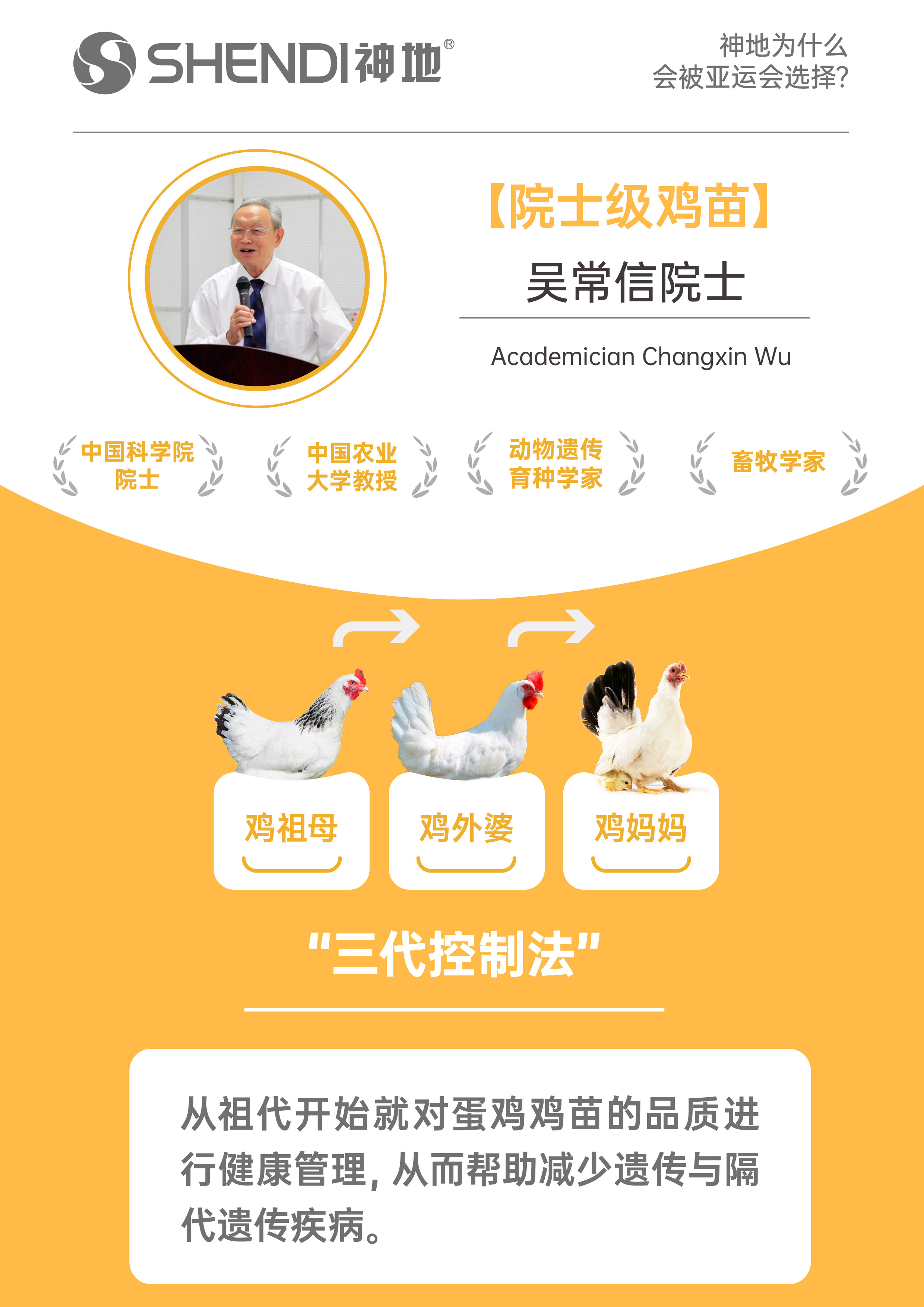神地奇蛋由吴常信院士亲自指导培育鸡苗开始加码疾病交货工程,生产出每一颗更好的更健康的鸡蛋都由一个健康的鸡妈妈开始!