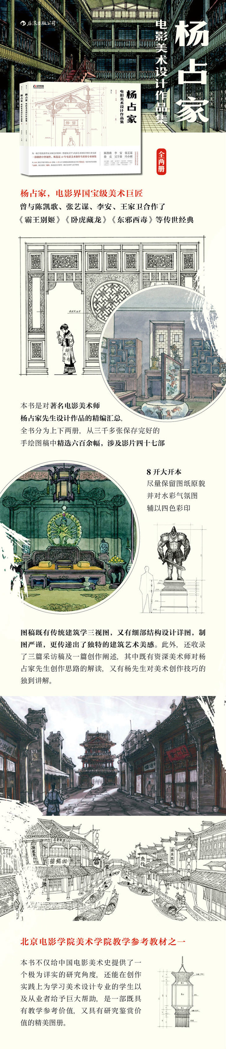◎ 名作精选 书中收录的作品,是由与杨占家常年合作的电影美术家霍廷霄先生从3000多张手绘稿中精选600余幅汇编而成,横跨中外大制作电影,纵览其四十年来创作生涯精华,其中不乏影史经典,如《霸王别姬》《诱僧》《夜半歌声》《宋家皇朝》《卧虎藏龙》《十面埋伏》《十月围城》《七剑》《满城尽带黄金甲》《赤壁》《功夫之王》《木乃伊3》《白鹿原》《唐山大地震》……