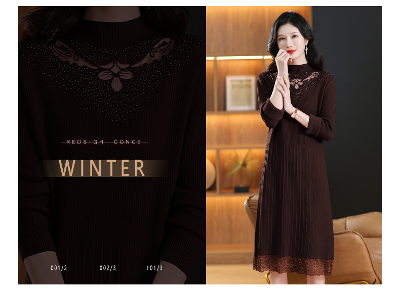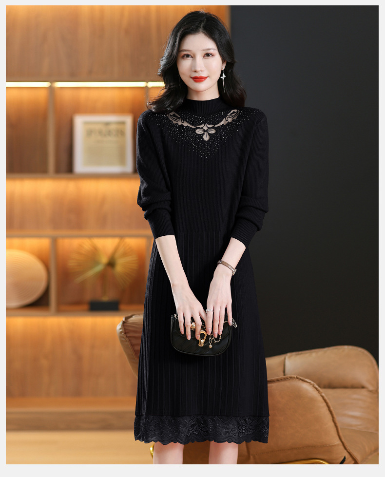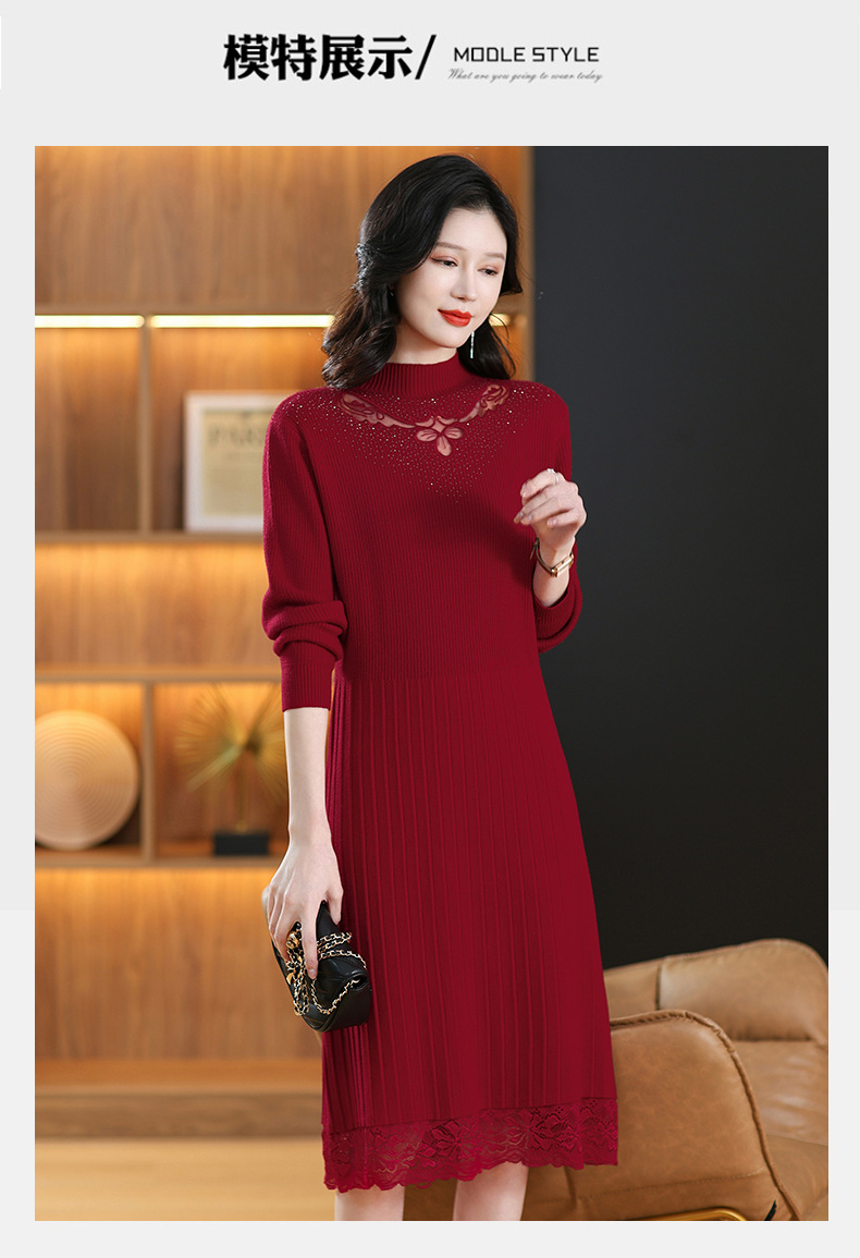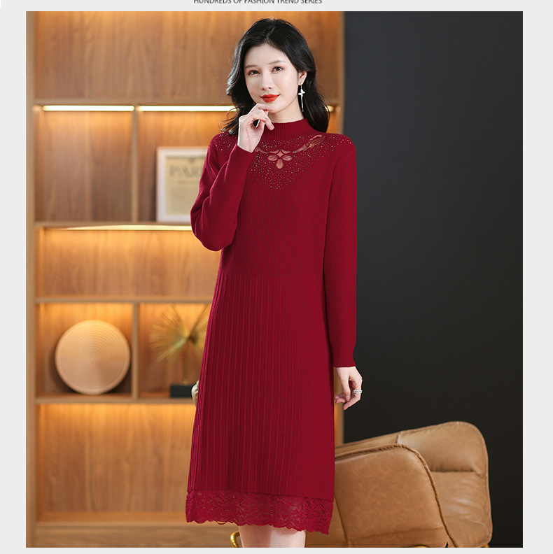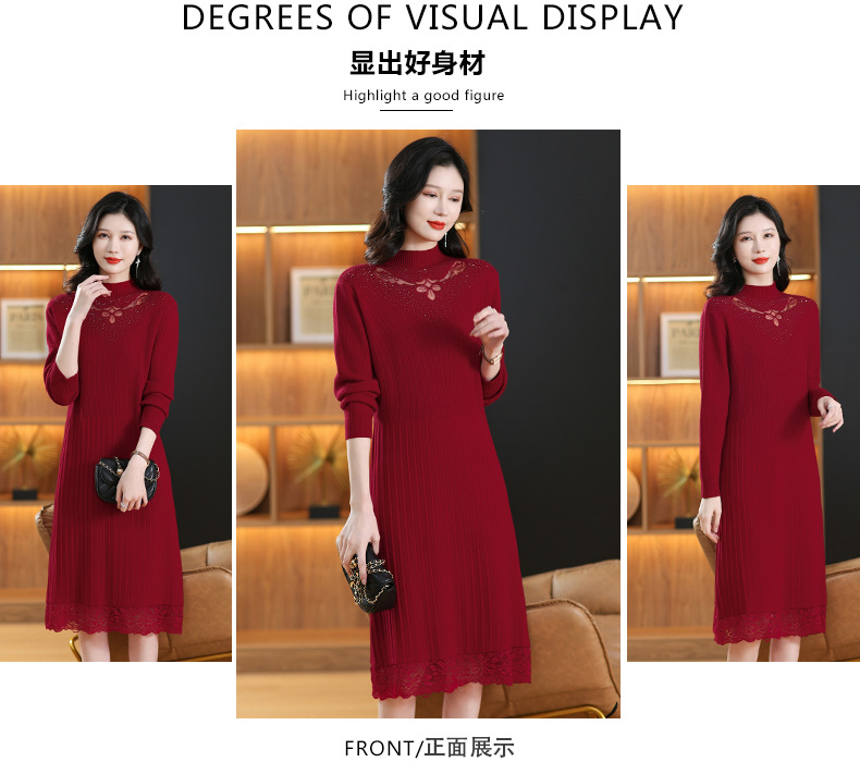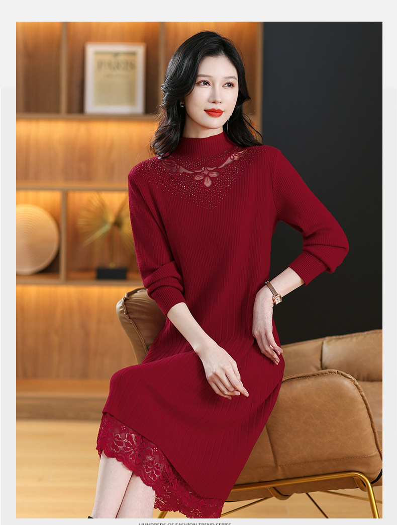 CC-MH-347半高领加绒加厚连衣裙女冬季2024新款配大衣中长款蕾丝打底毛衣裙