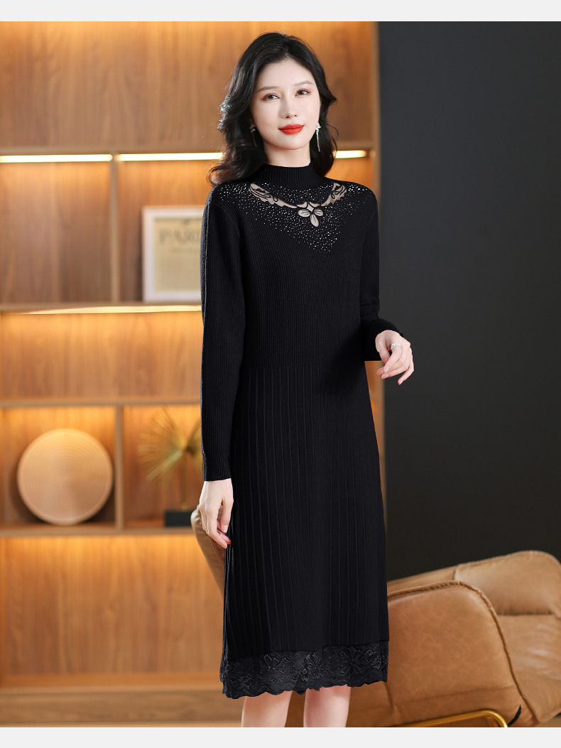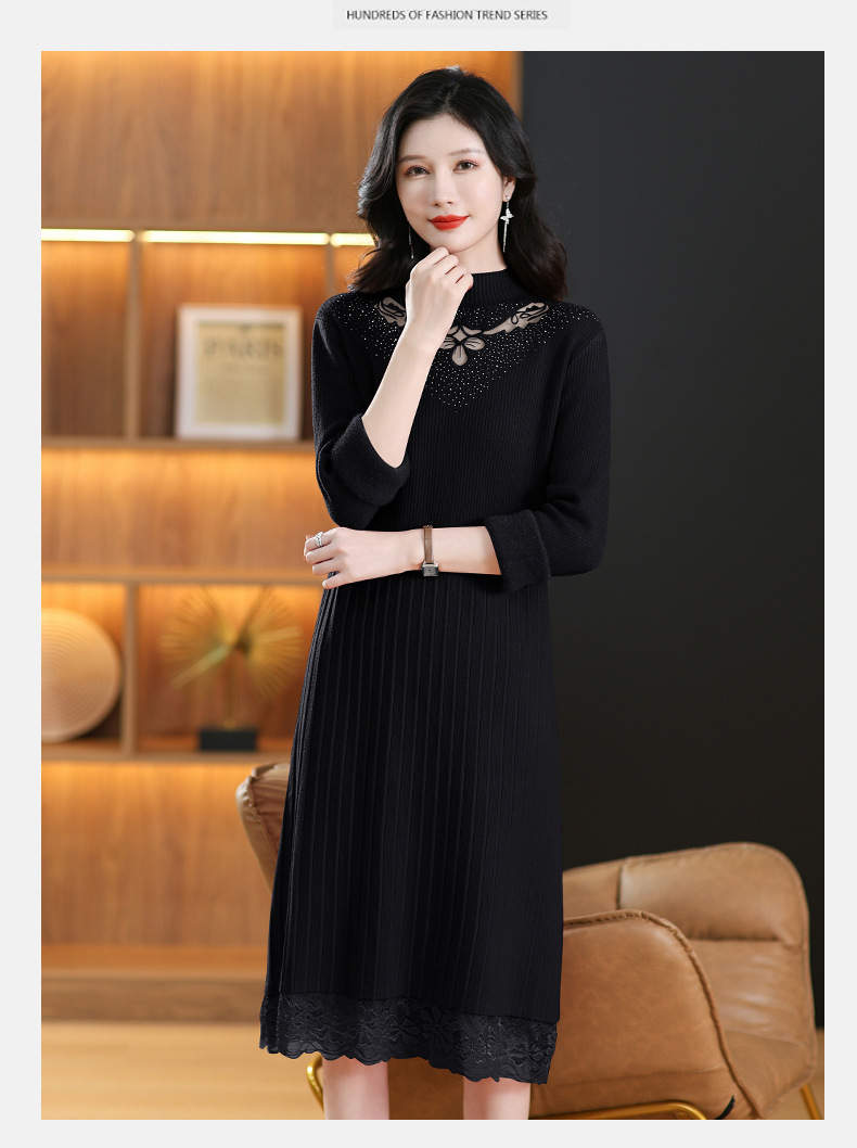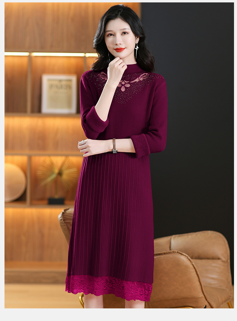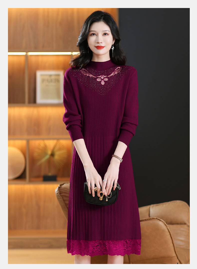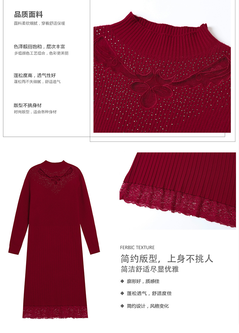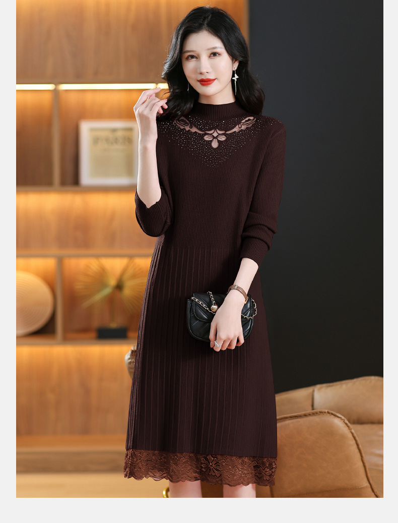 CC-MH-347半高领加绒加厚连衣裙女冬季2024新款配大衣中长款蕾丝打底毛衣裙