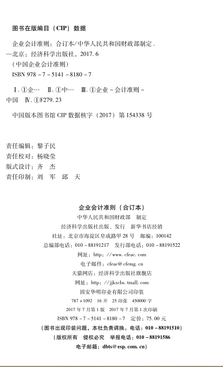 本书是《企业会计准则》的最新合订本。《企业会计准则》由财政部制定,于2006年2月15日发布,自2007年1月1日起施行。为保持我国会计准则与国际财务报告准则的持续趋同,财政部在2012年发布了一系列准则征求意见稿后,于2014年正式修订了五项、新增了三项企业会计准则。2017年,财政部又对14号、16号、22号、23号、24号、37号企业会计准则进行了修订,并印发了42号企业会计准则。本书涵盖上述准则修订内容。