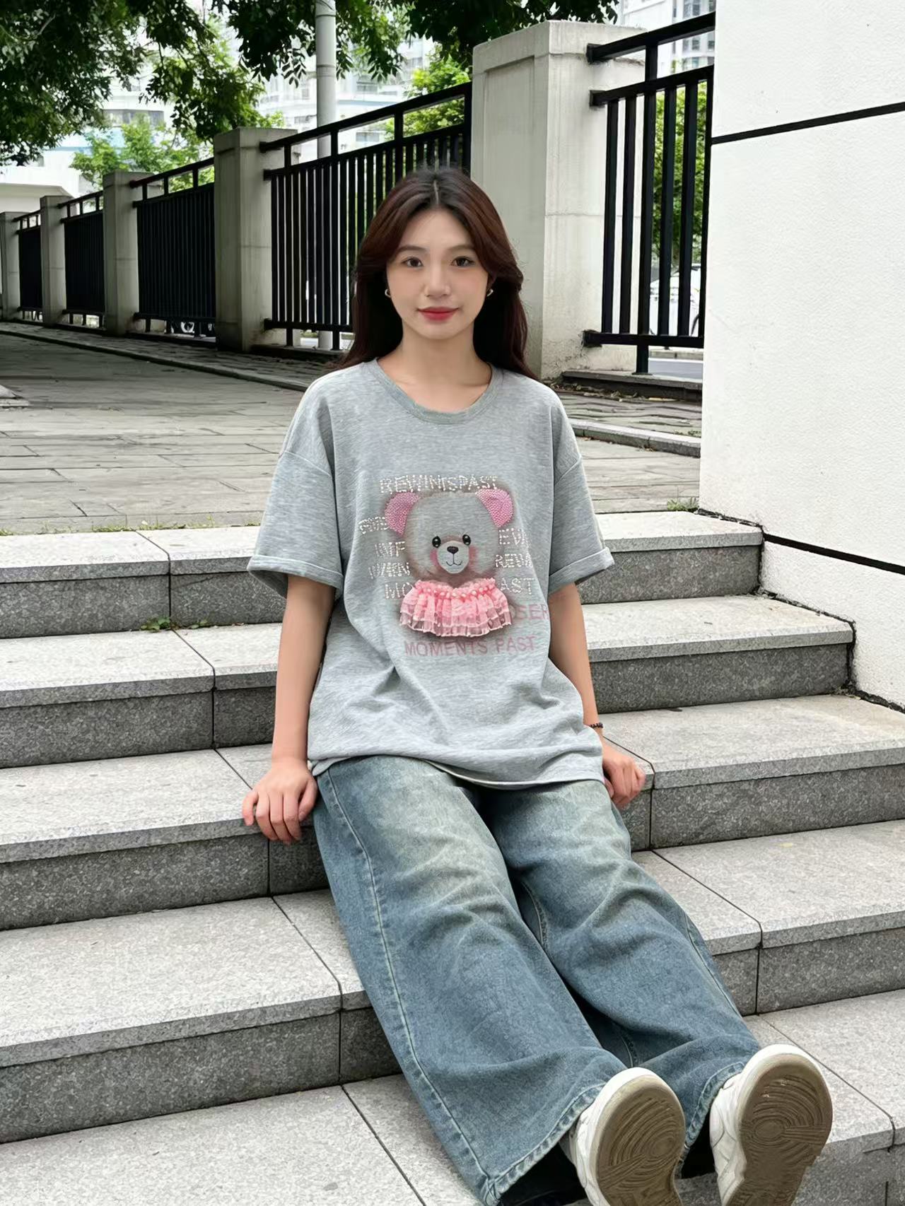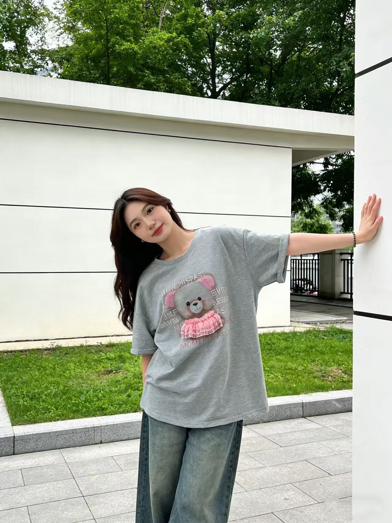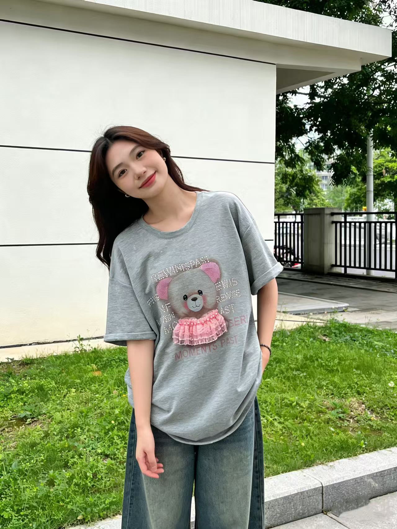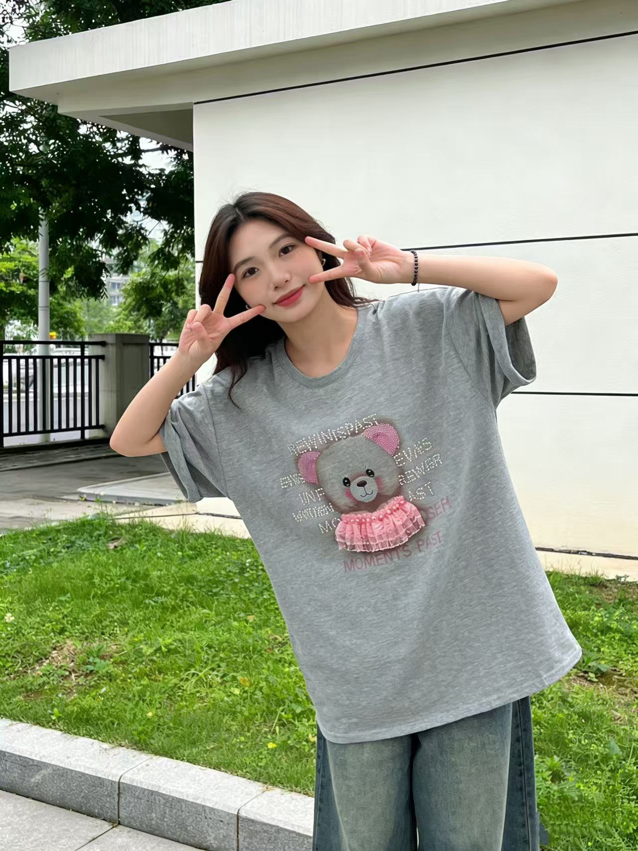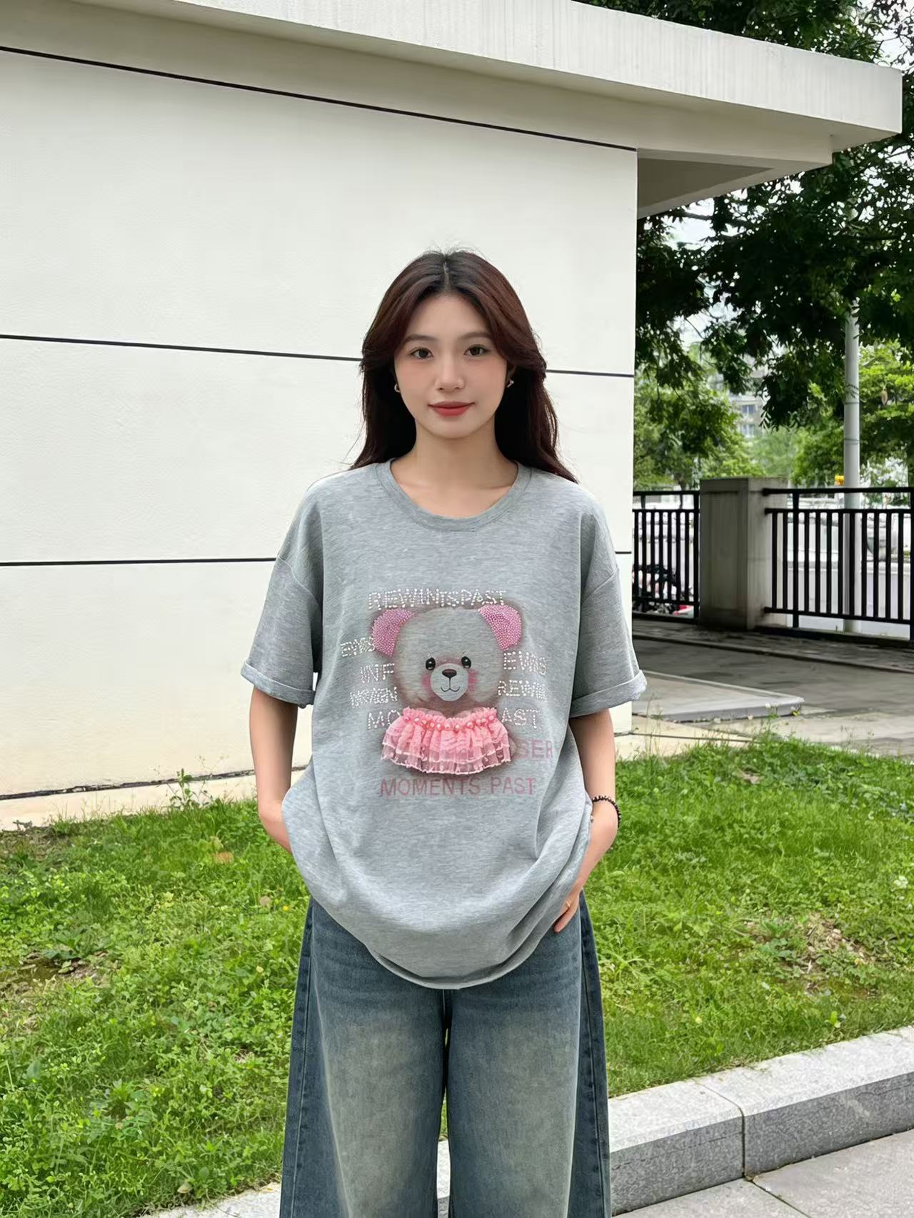 大版【自营】工艺/重工!蕾丝小熊➕烫钻!潮牌复古宽松设计感中长短袖T恤-喜出