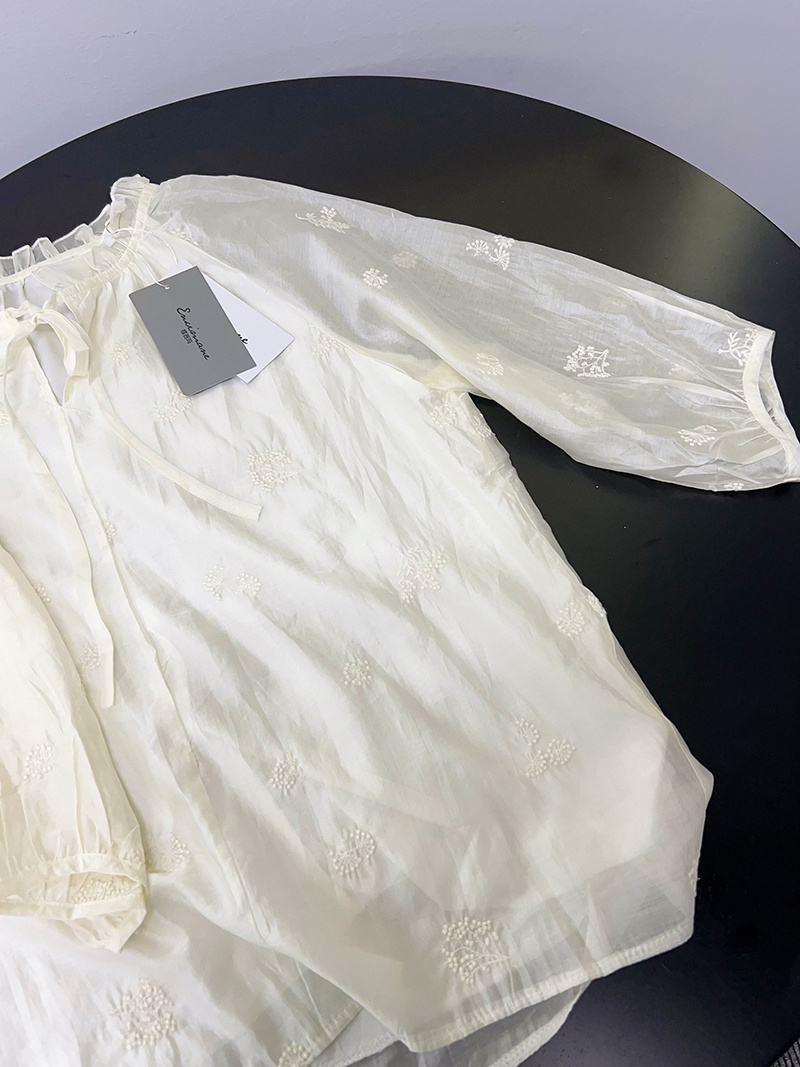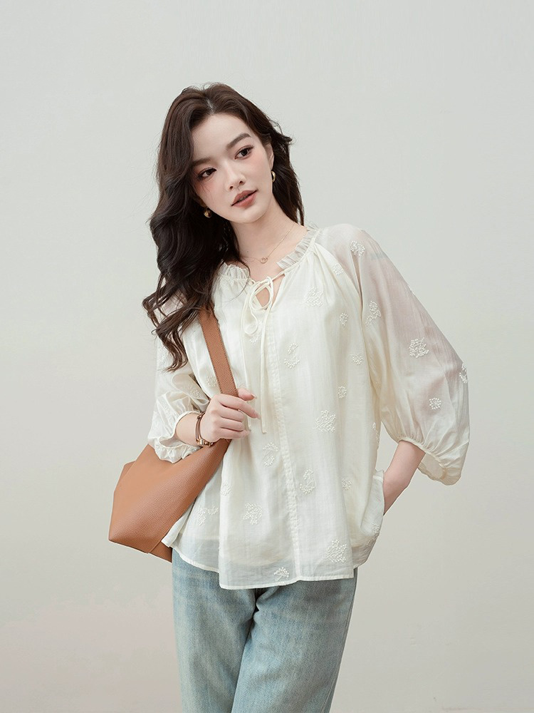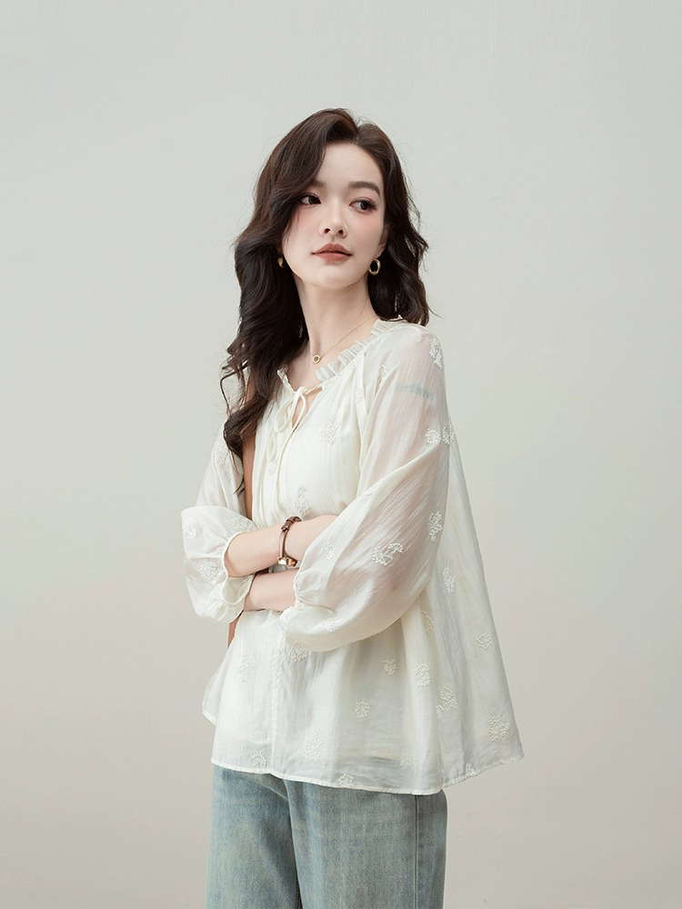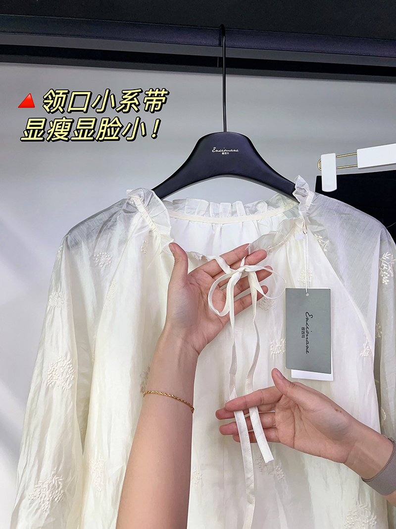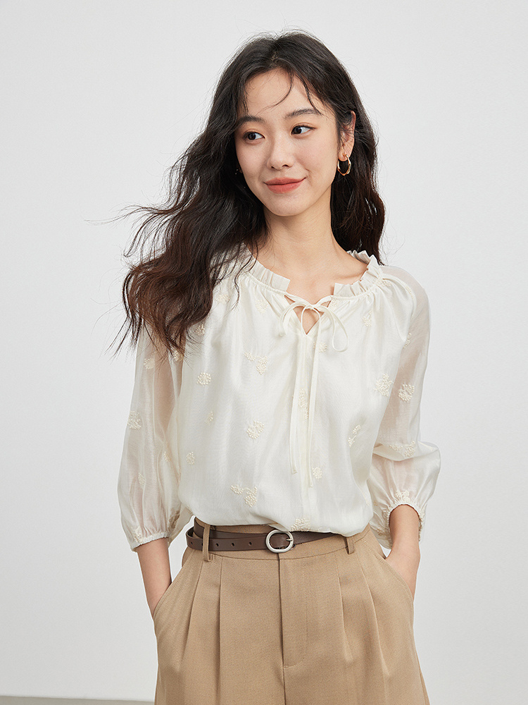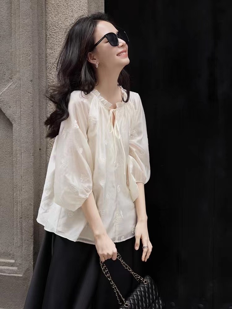【樱西玛ENXIMANE 重工刺绣天丝衬衫】进口天丝莱赛尔面料 透气轻盈不压身 七分灯笼袖+领口小系带 微松H型廓形 立体刺绣点缀