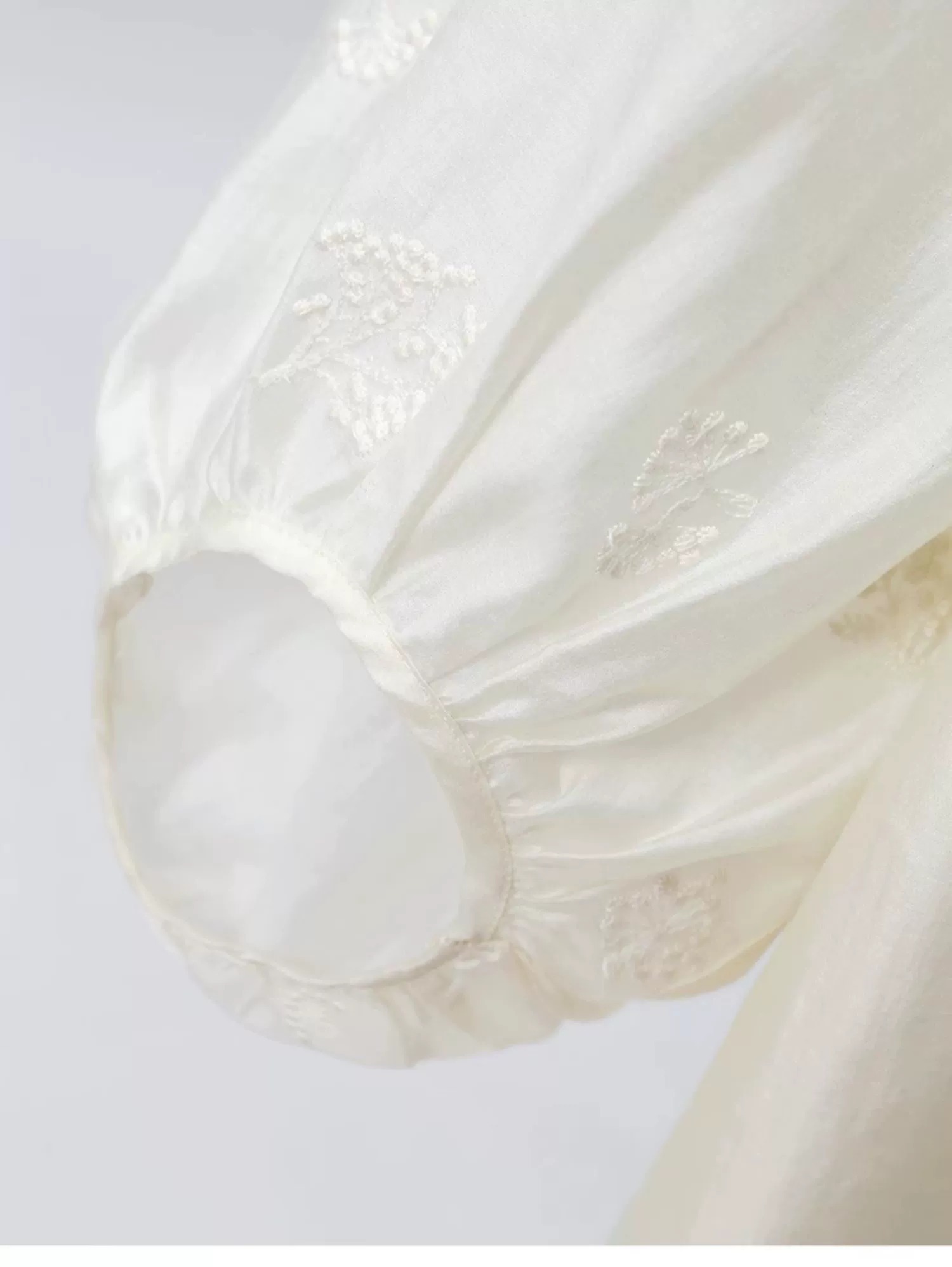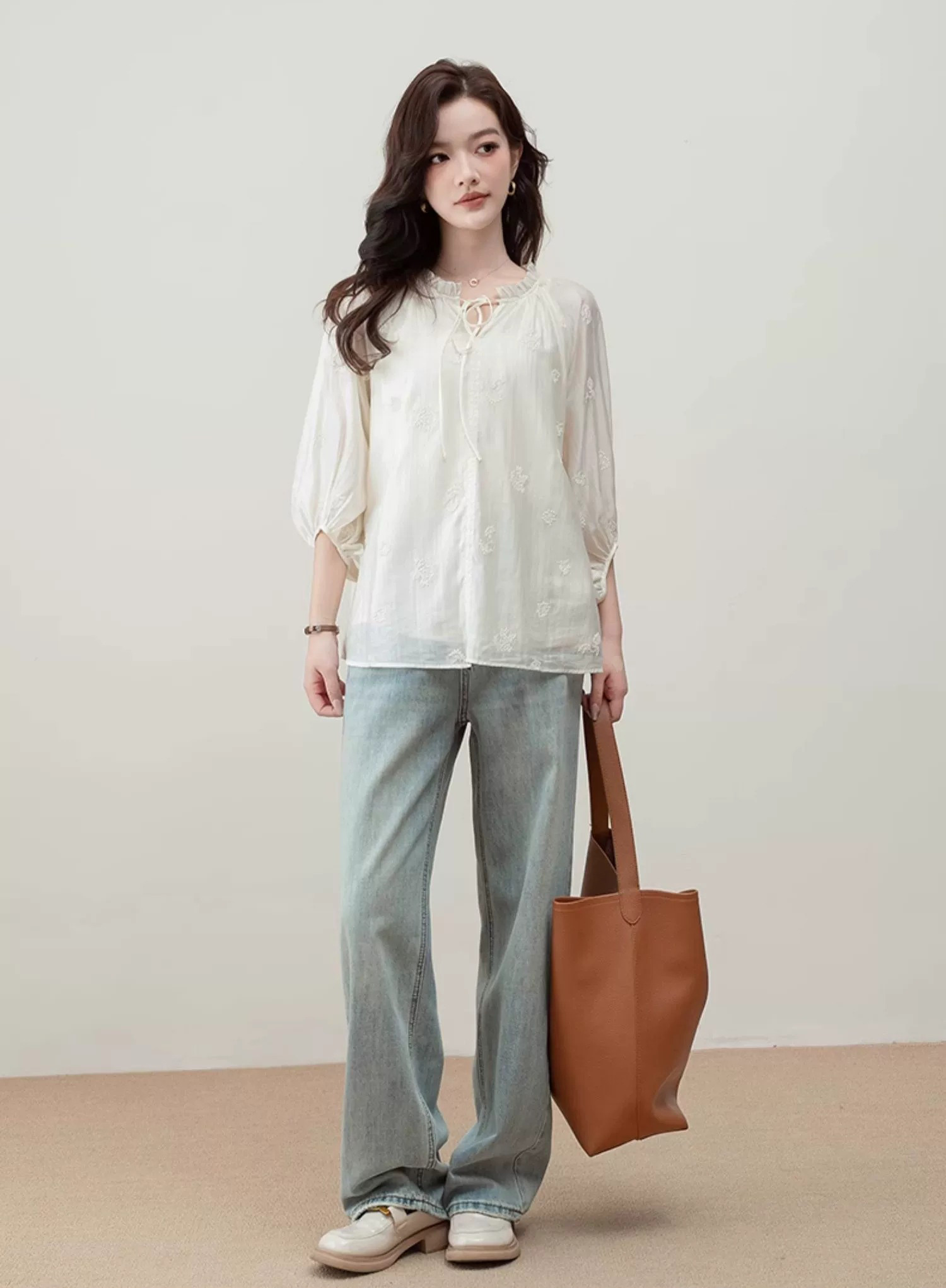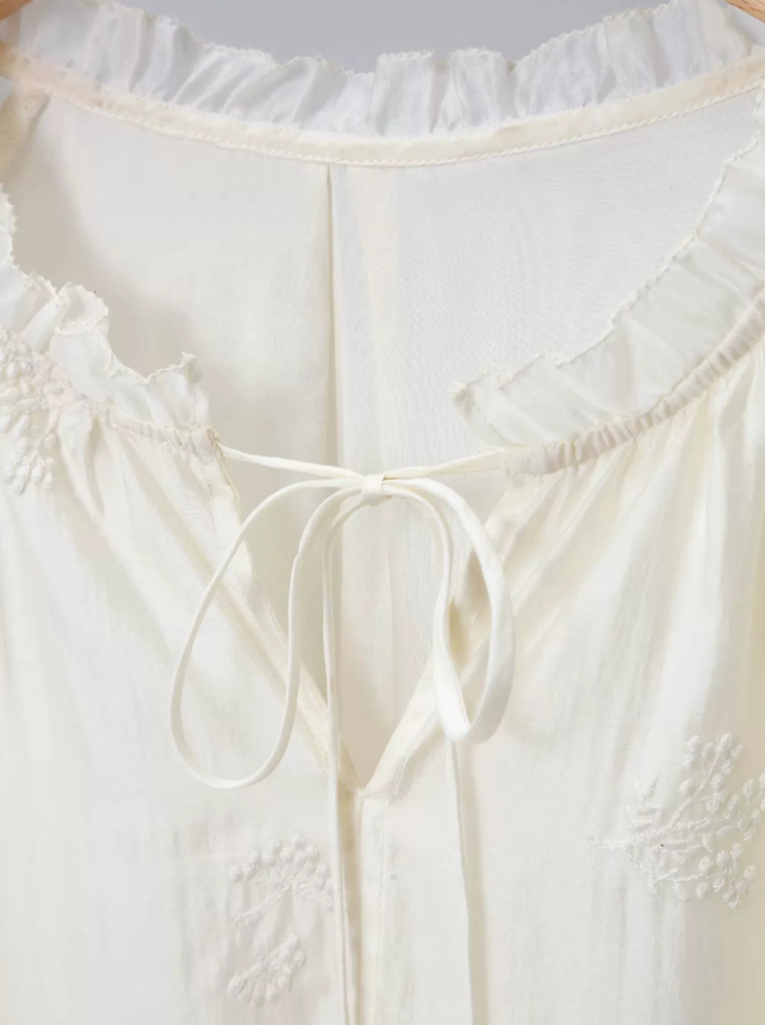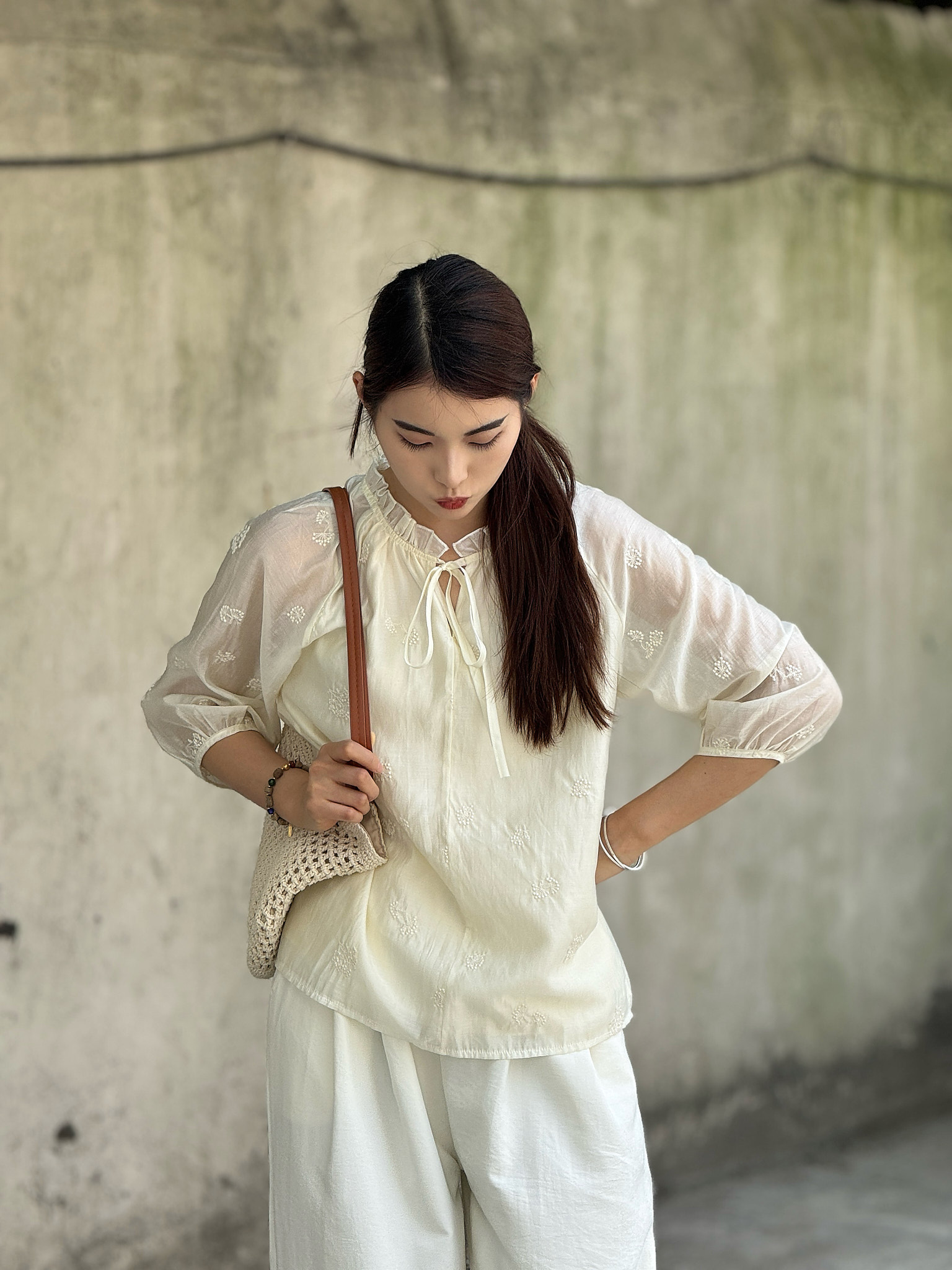 【樱西玛ENXIMANE 重工刺绣天丝衬衫】进口天丝莱赛尔面料 透气轻盈不压身 七分灯笼袖+领口小系带 微松H型廓形 立体刺绣点缀