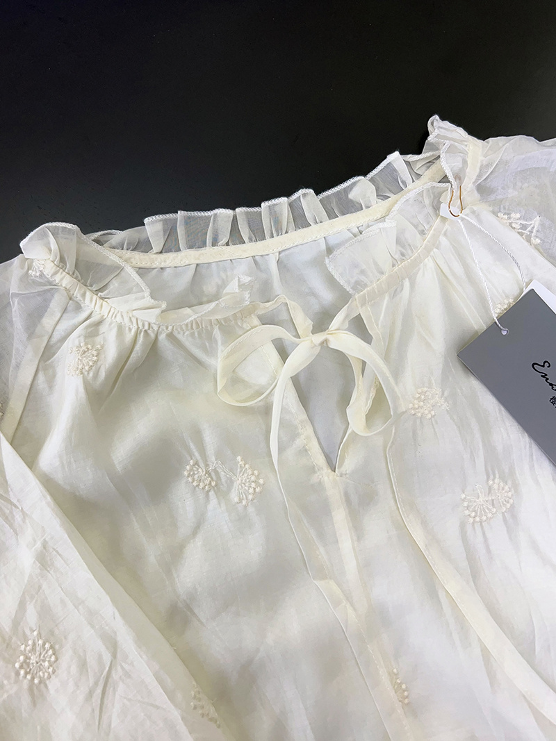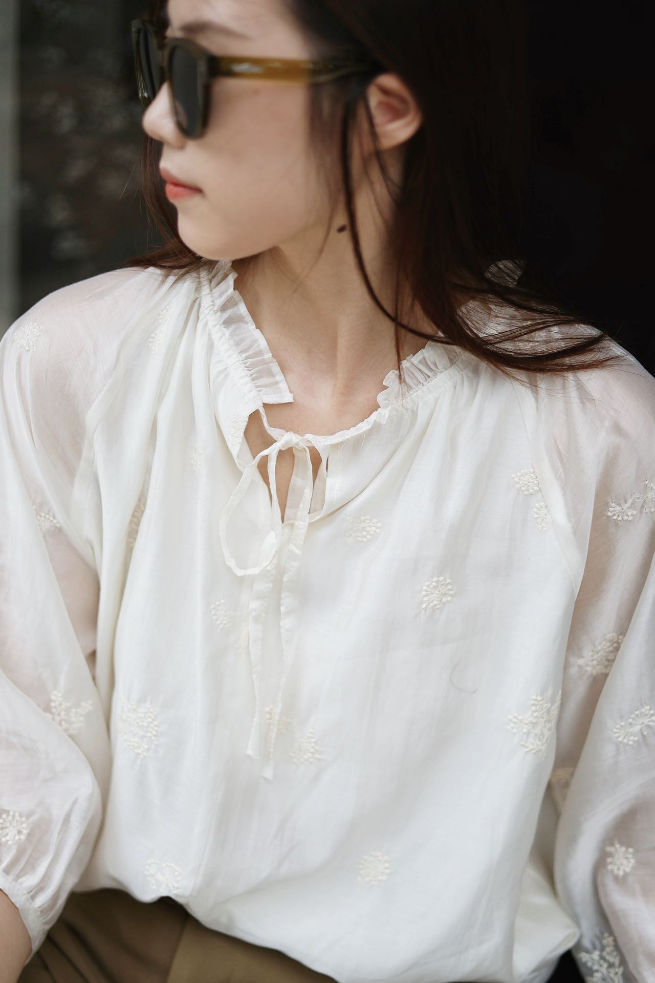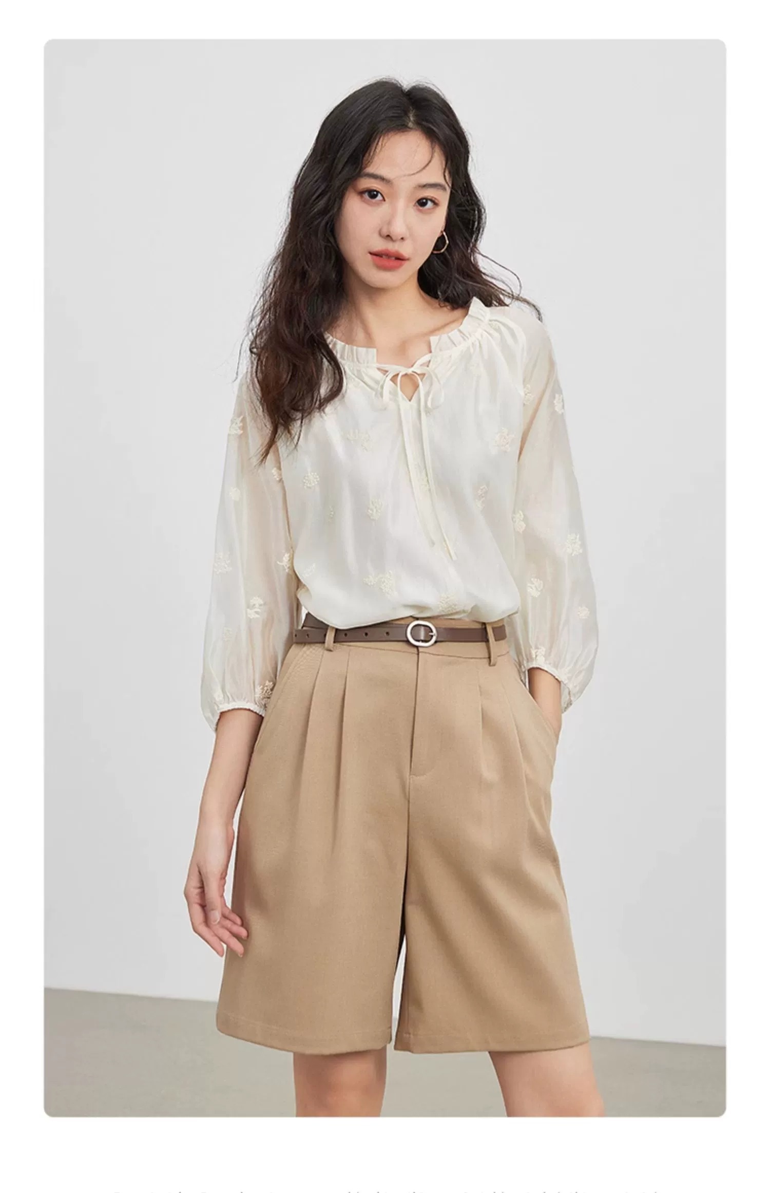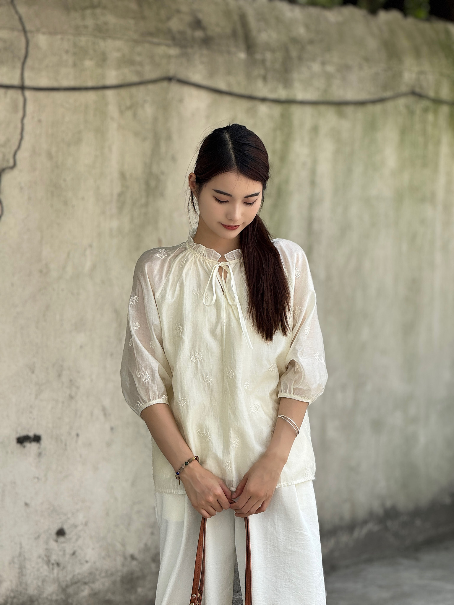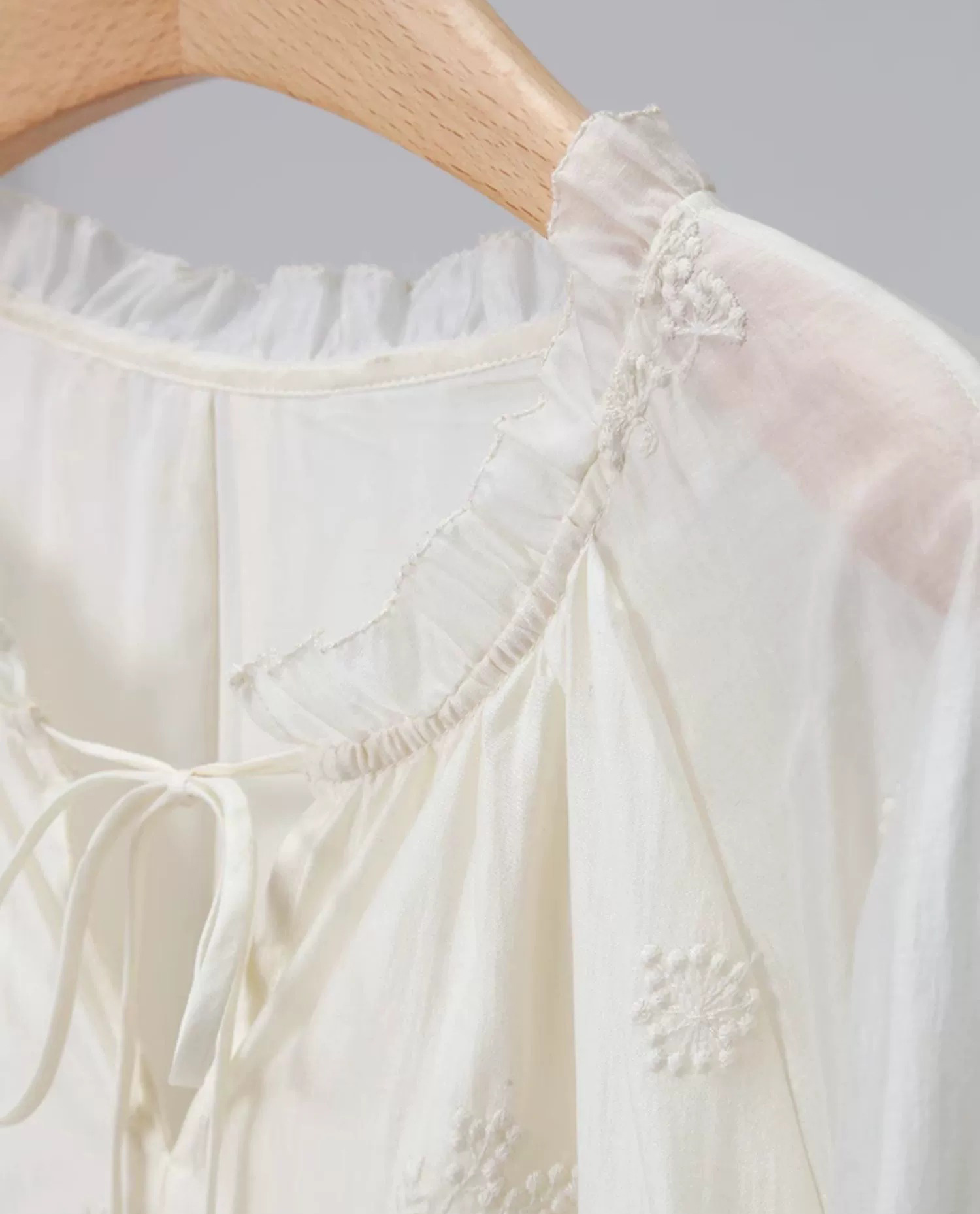 【樱西玛ENXIMANE 重工刺绣天丝衬衫】进口天丝莱赛尔面料 透气轻盈不压身 七分灯笼袖+领口小系带 微松H型廓形 立体刺绣点缀