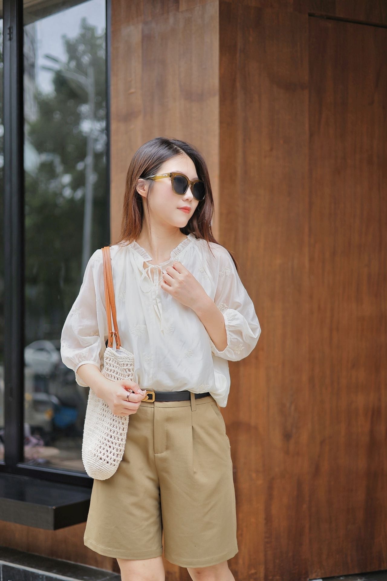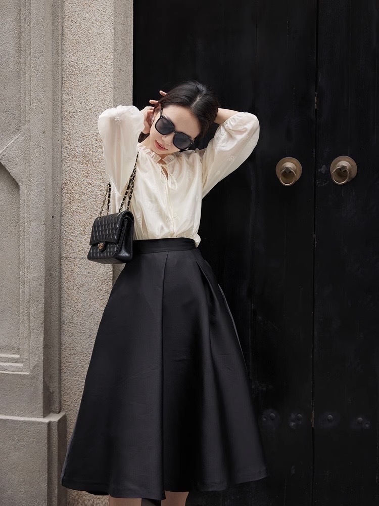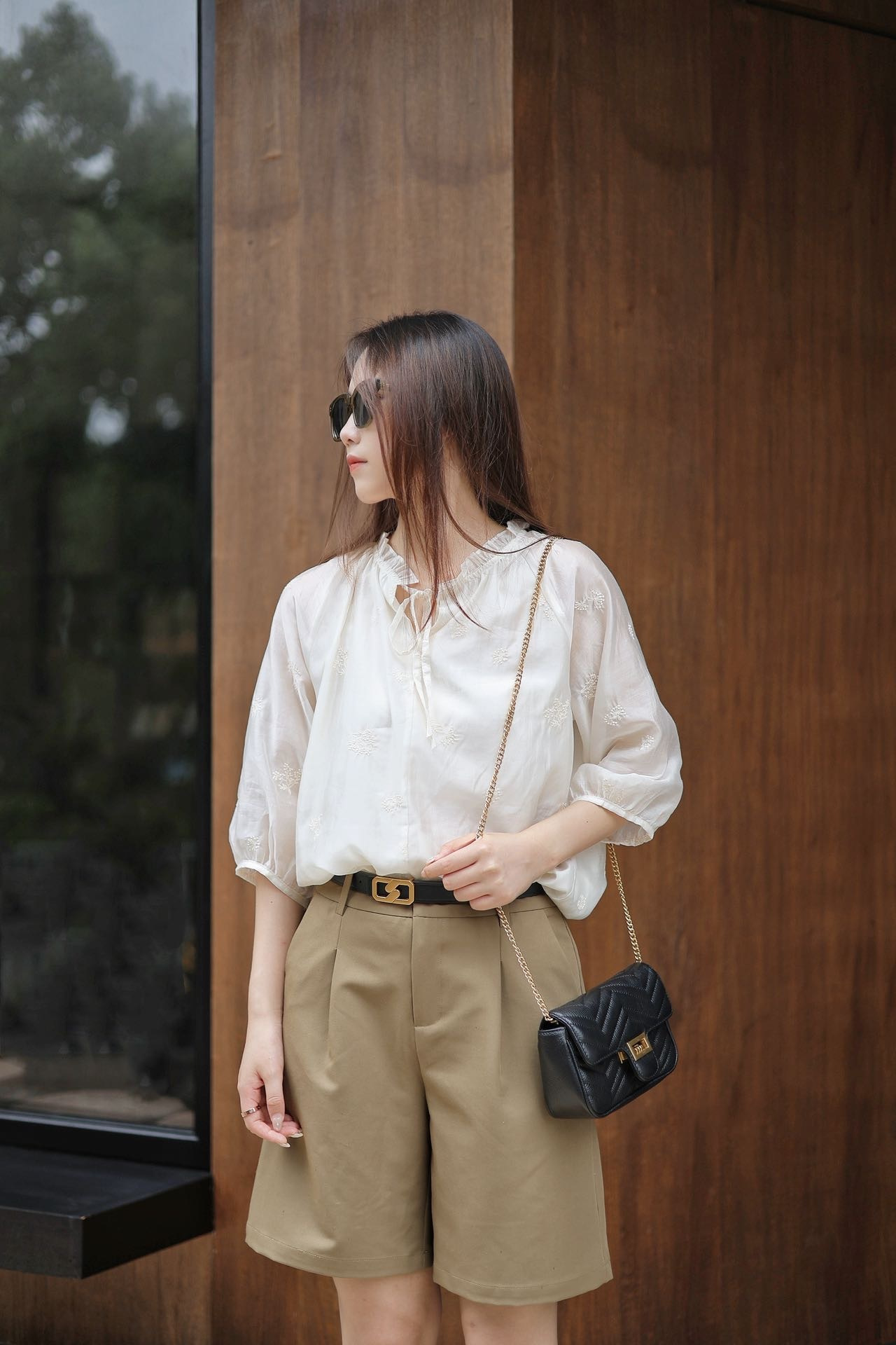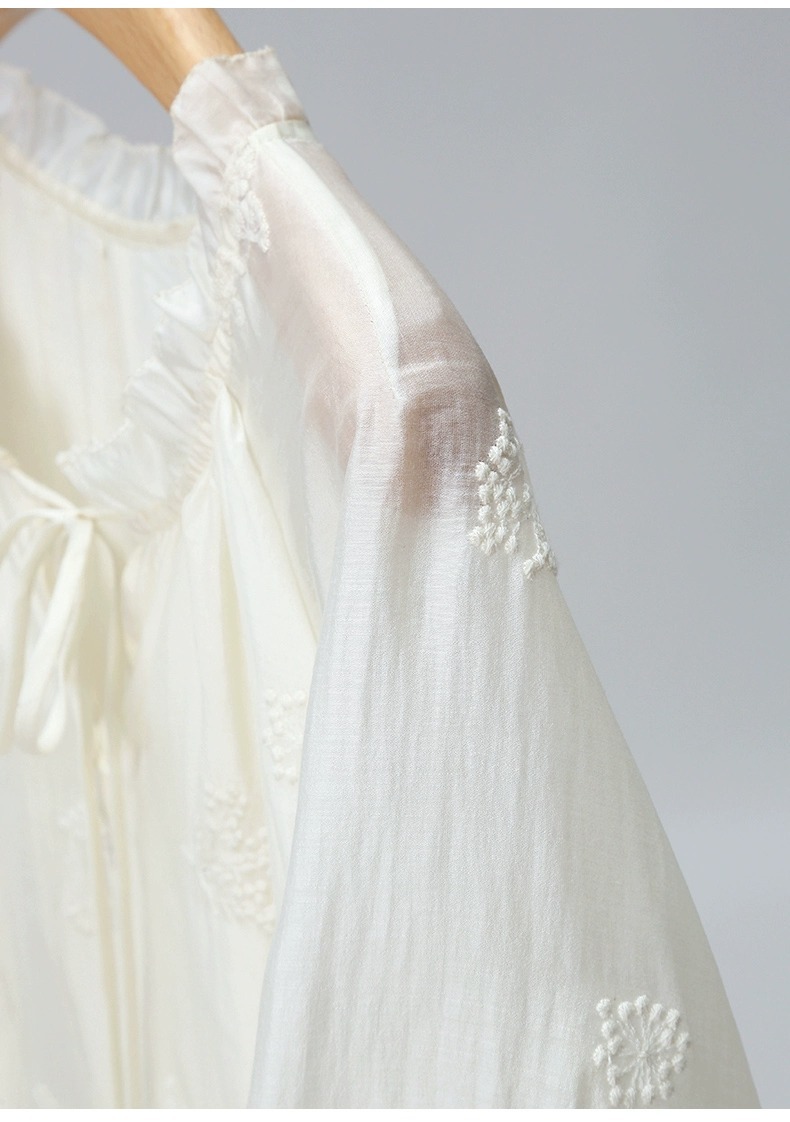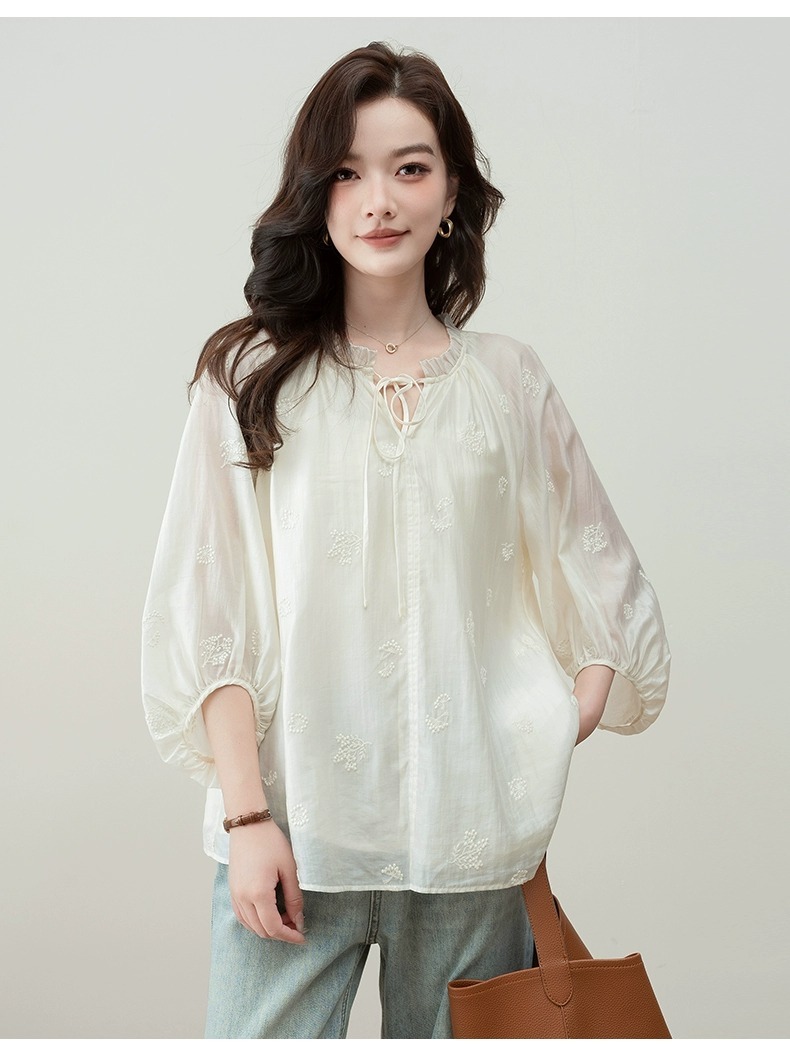 【樱西玛ENXIMANE 重工刺绣天丝衬衫】进口天丝莱赛尔面料 透气轻盈不压身 七分灯笼袖+领口小系带 微松H型廓形 立体刺绣点缀