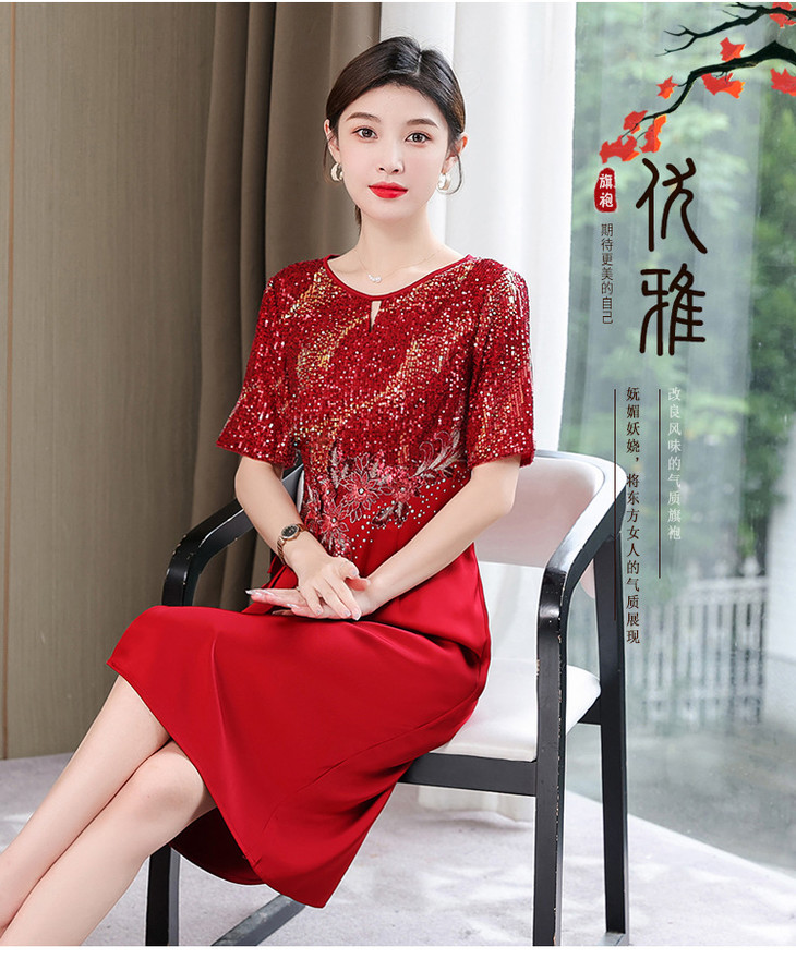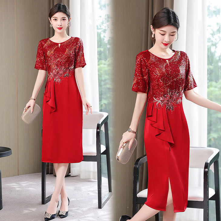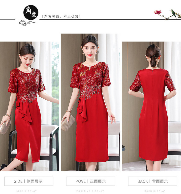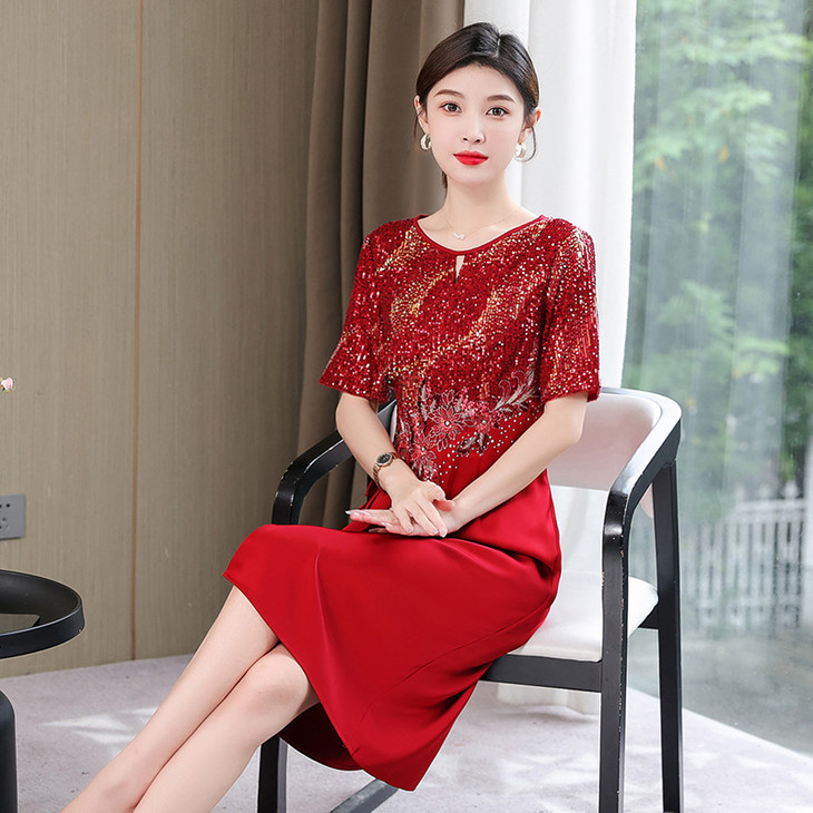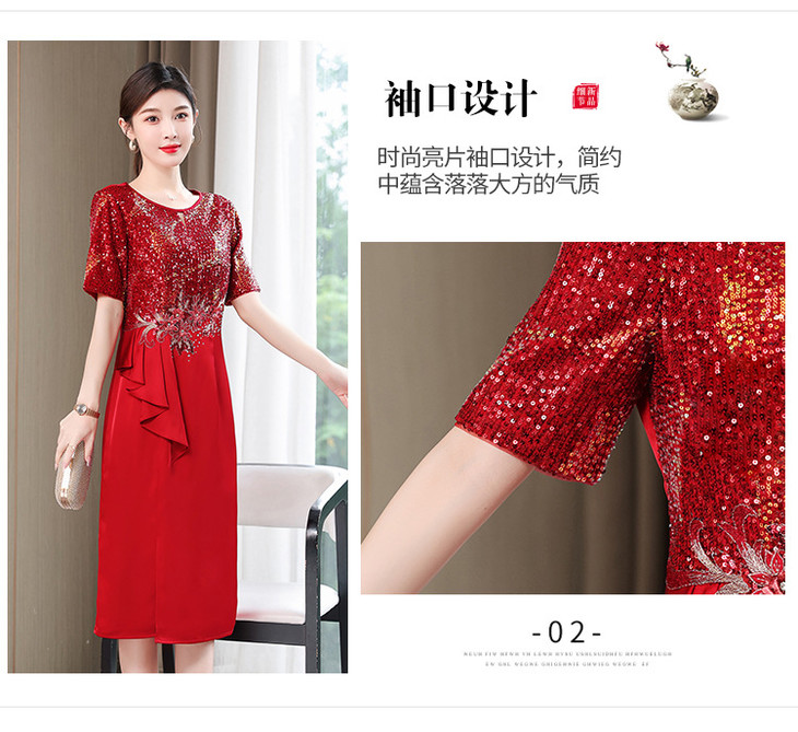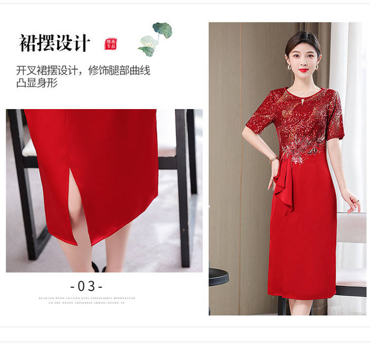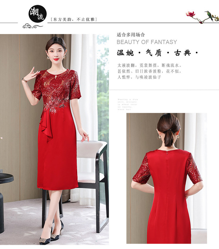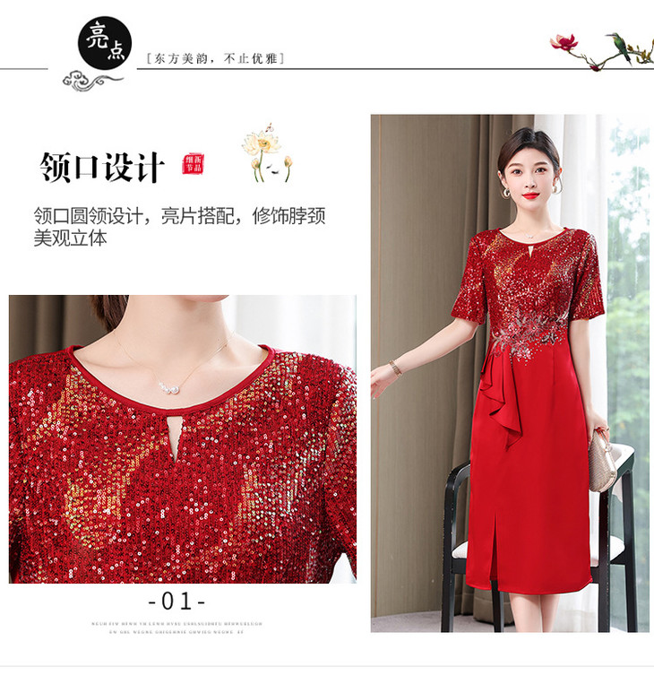 AHM-lf9760新款优雅气质修身中长款圆领短袖亮片中长款连衣裙