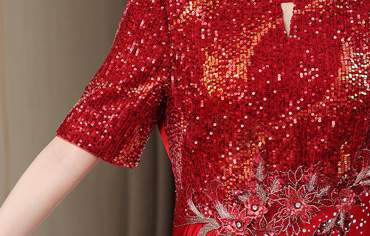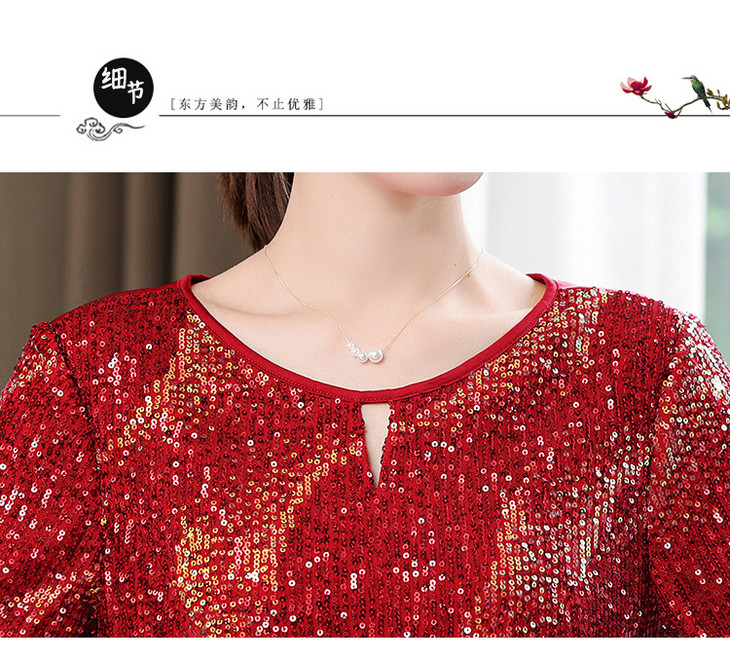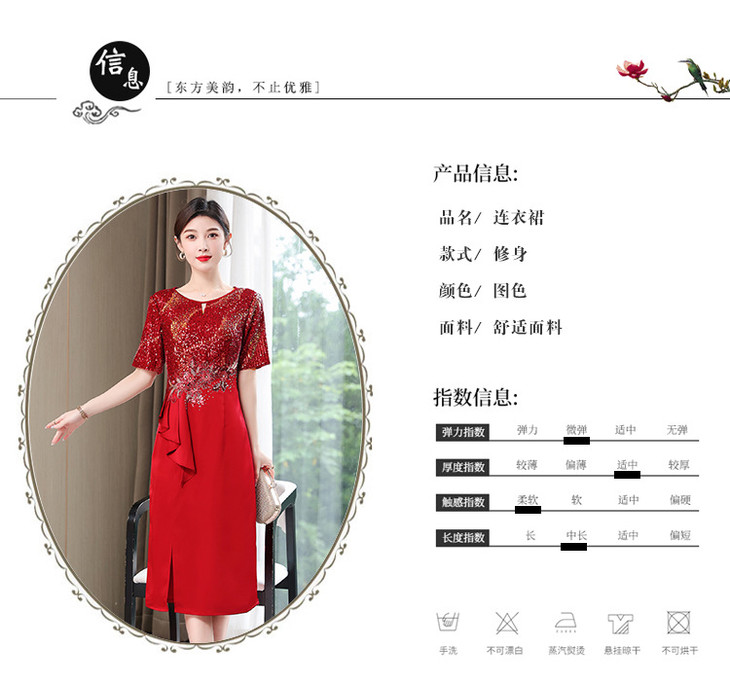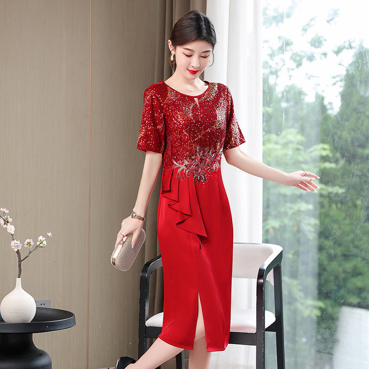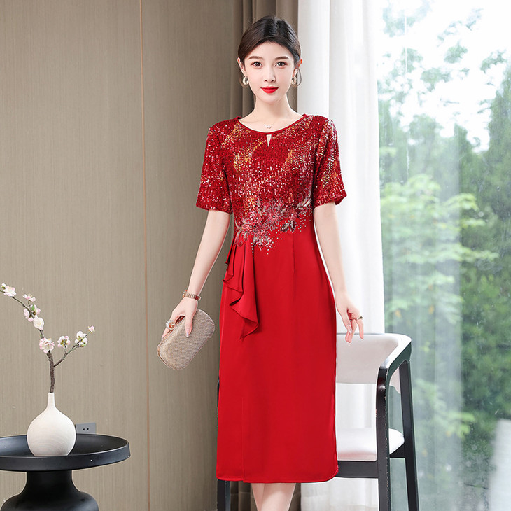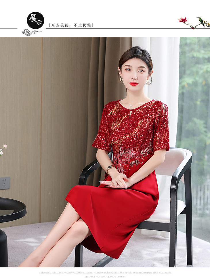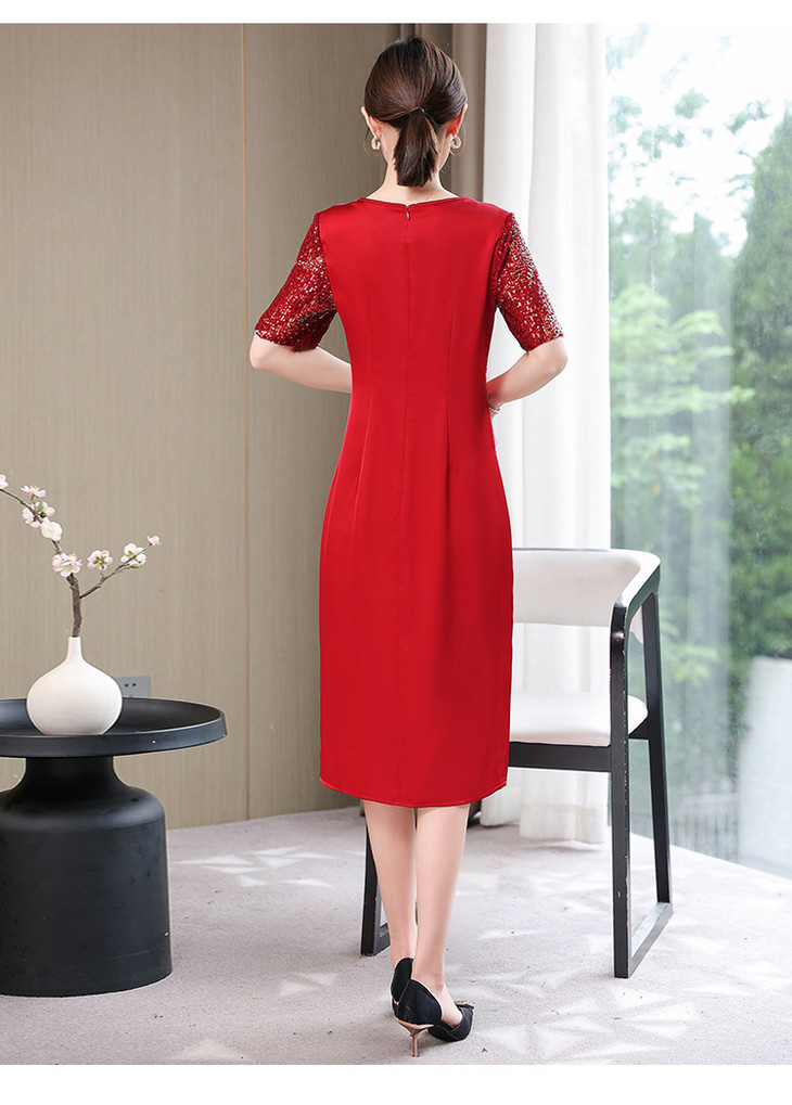 AHM-lf9760新款优雅气质修身中长款圆领短袖亮片中长款连衣裙