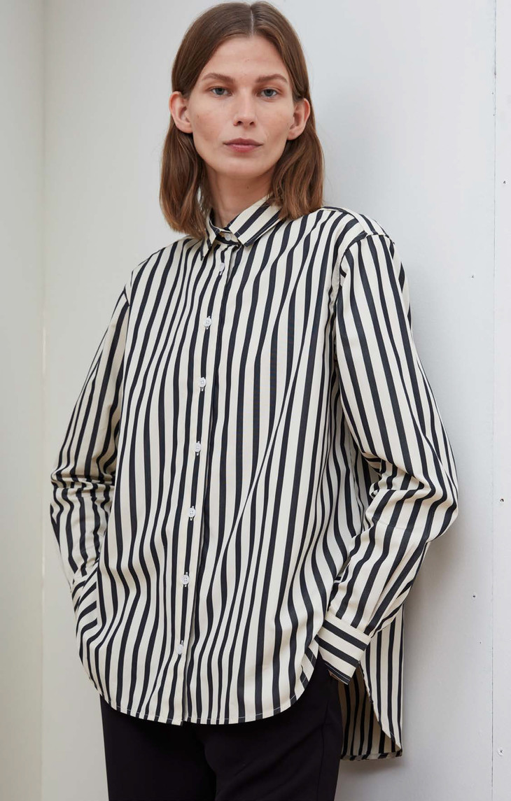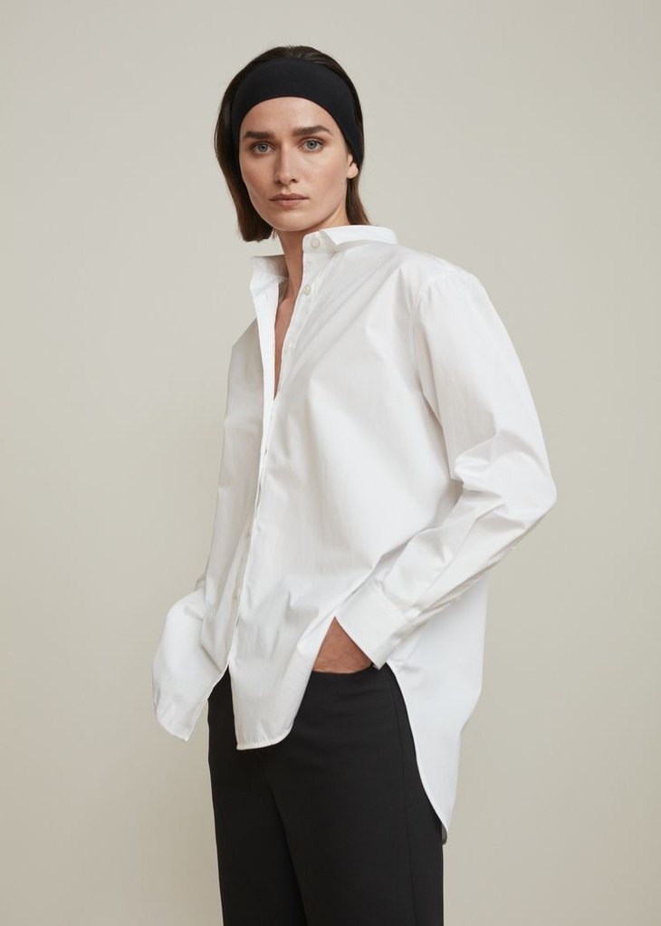 宽松精良的版型,前短后长的微弧形下摆上身简洁而干练,左腰处点缀品牌logo刺绣,细节处更添精致。采用棉质府绸制成,手感细腻而富光泽感。