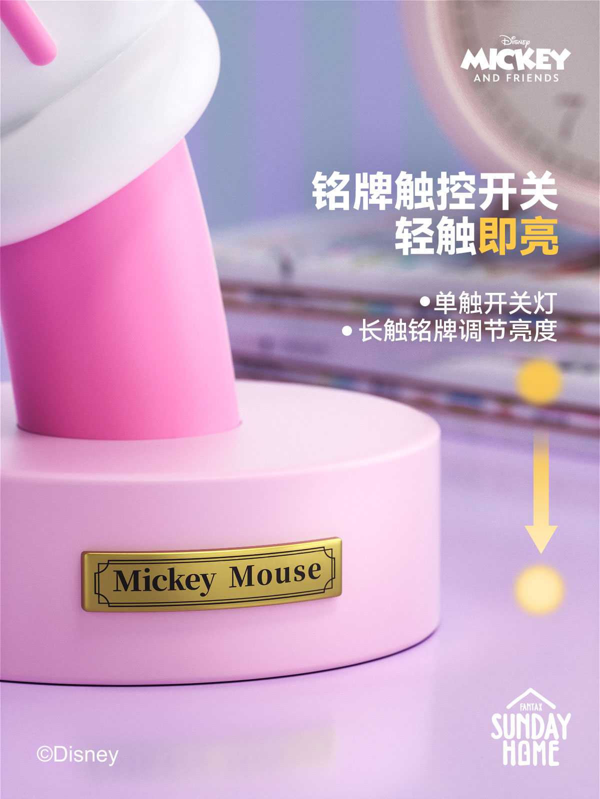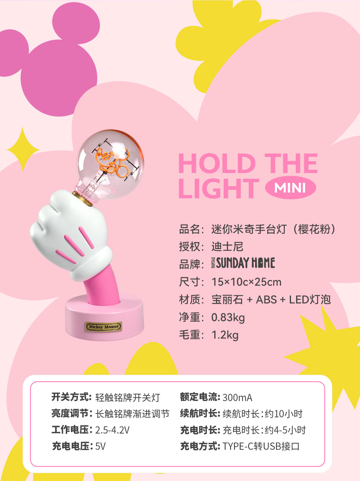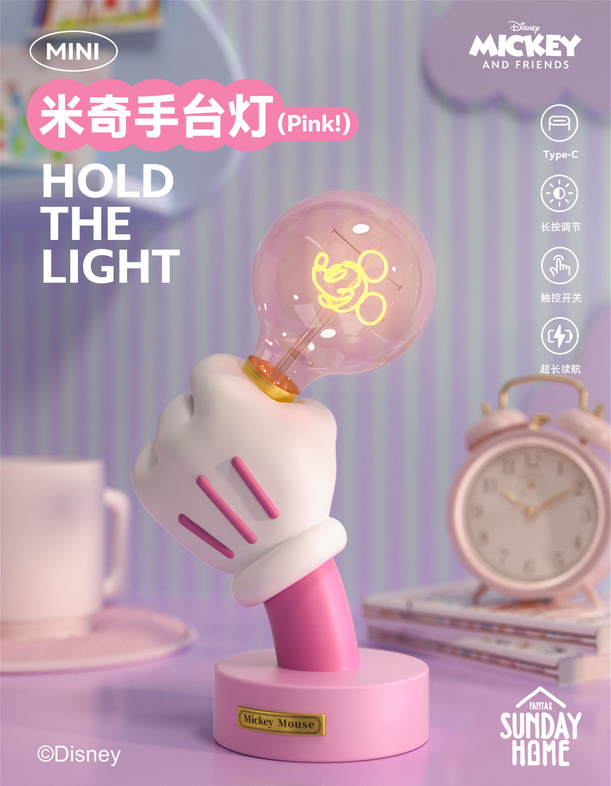 SUNDAY HOME 迷你米奇手台灯-樱花粉