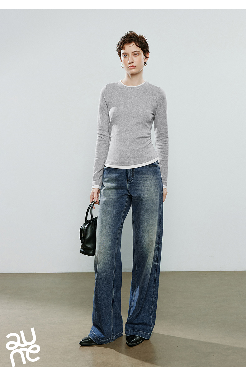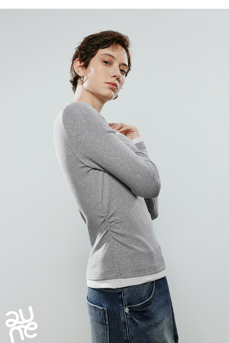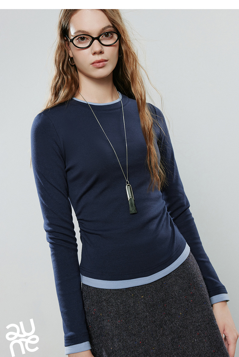 初语拼接假两件修身软弹收褶T恤8541003