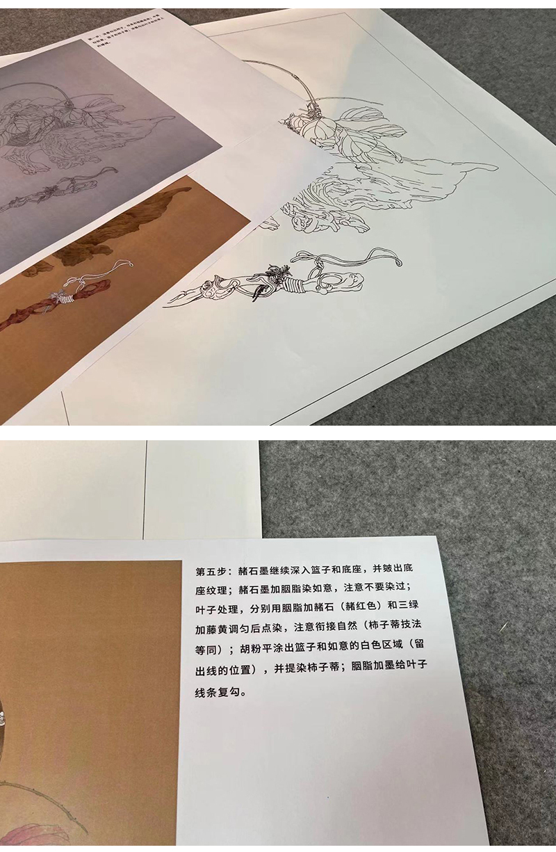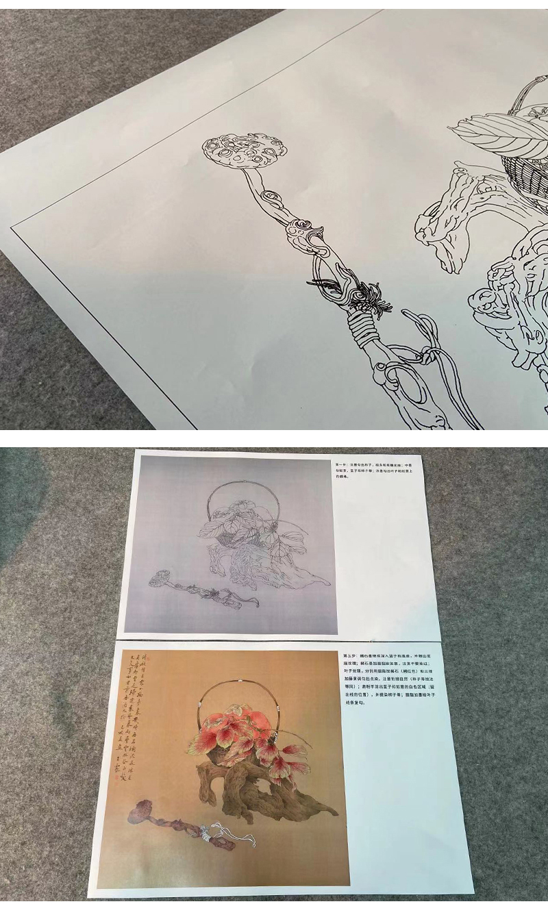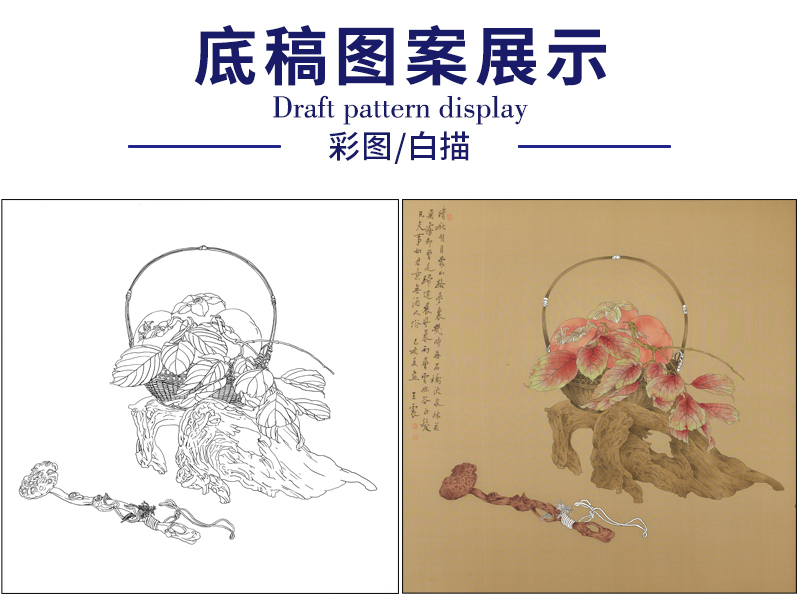 【有步骤、大彩图】王震工笔画白描底稿斗方小品《清供(秋)》花篮初学者临摹花鸟线稿WZ32