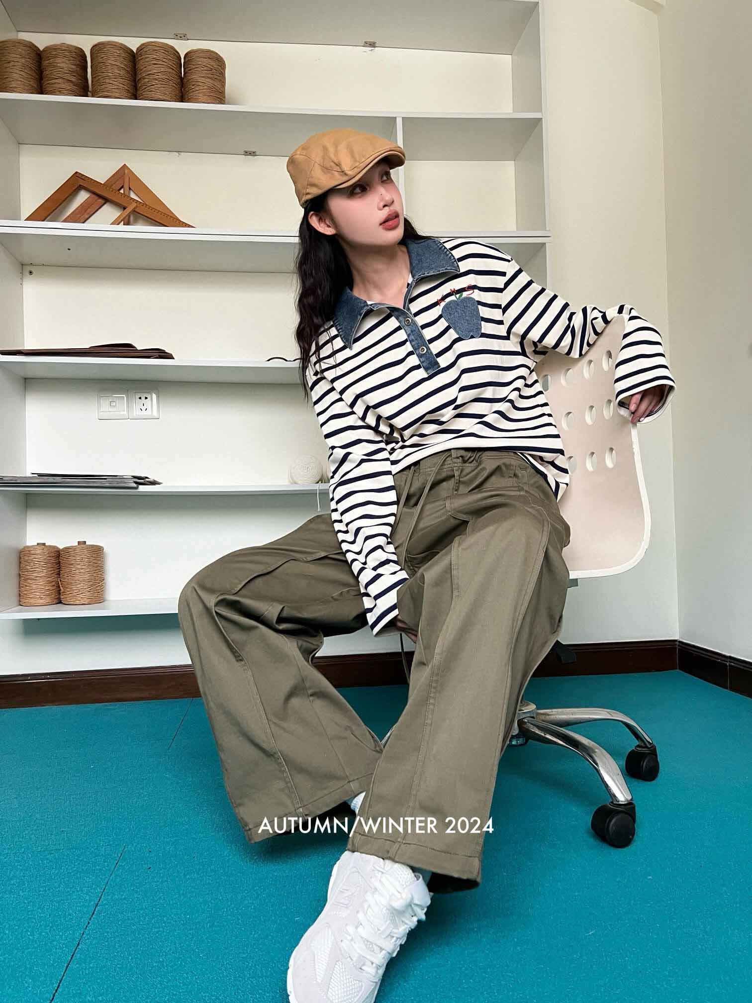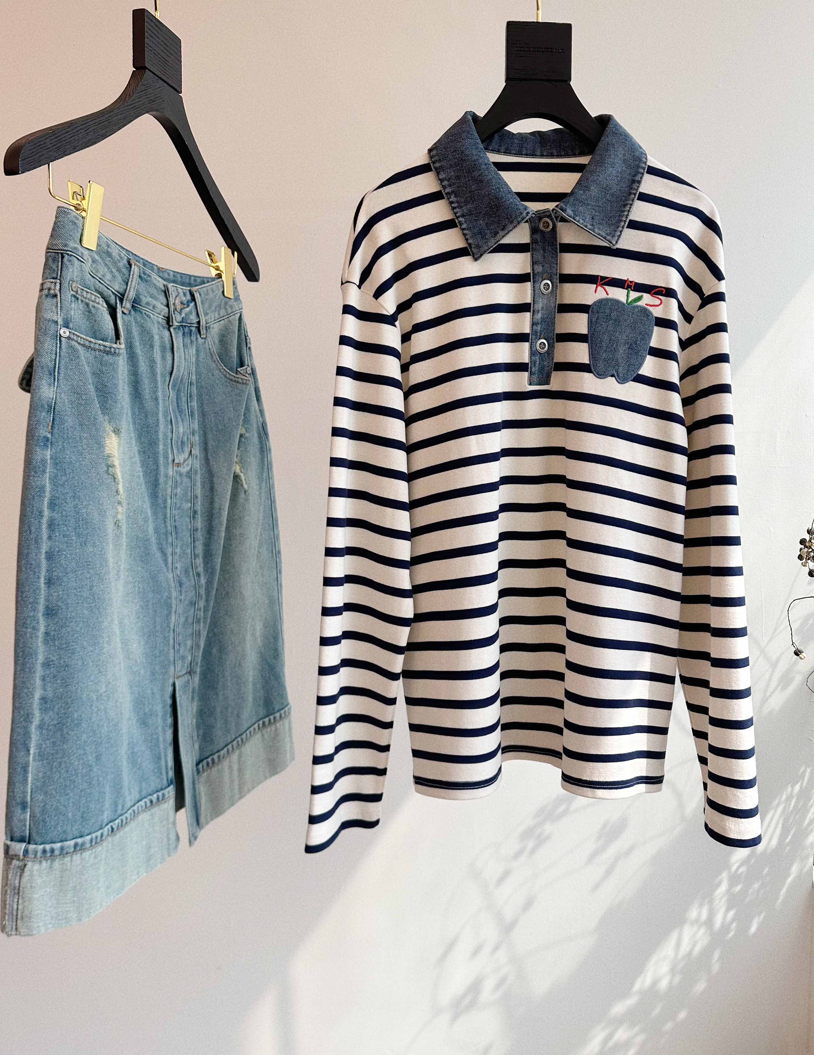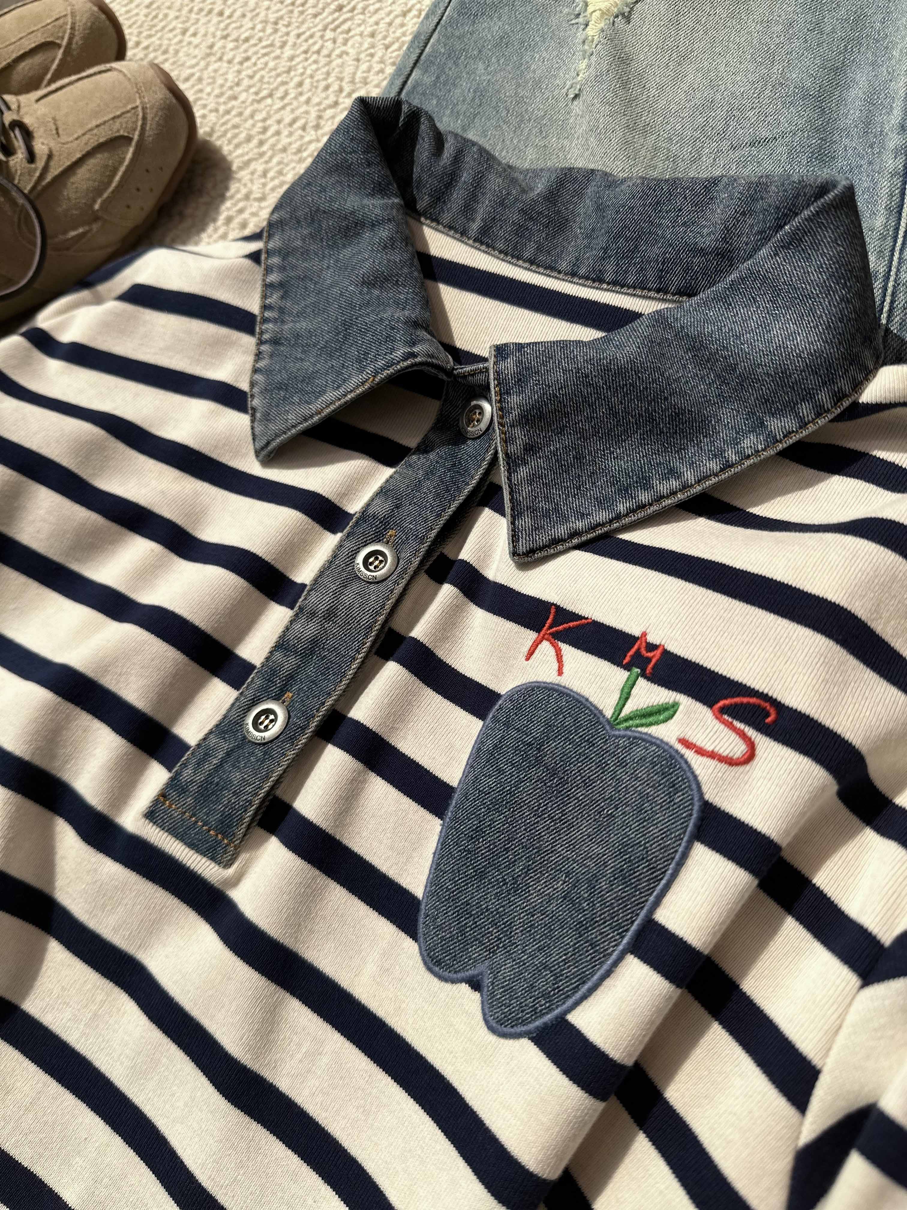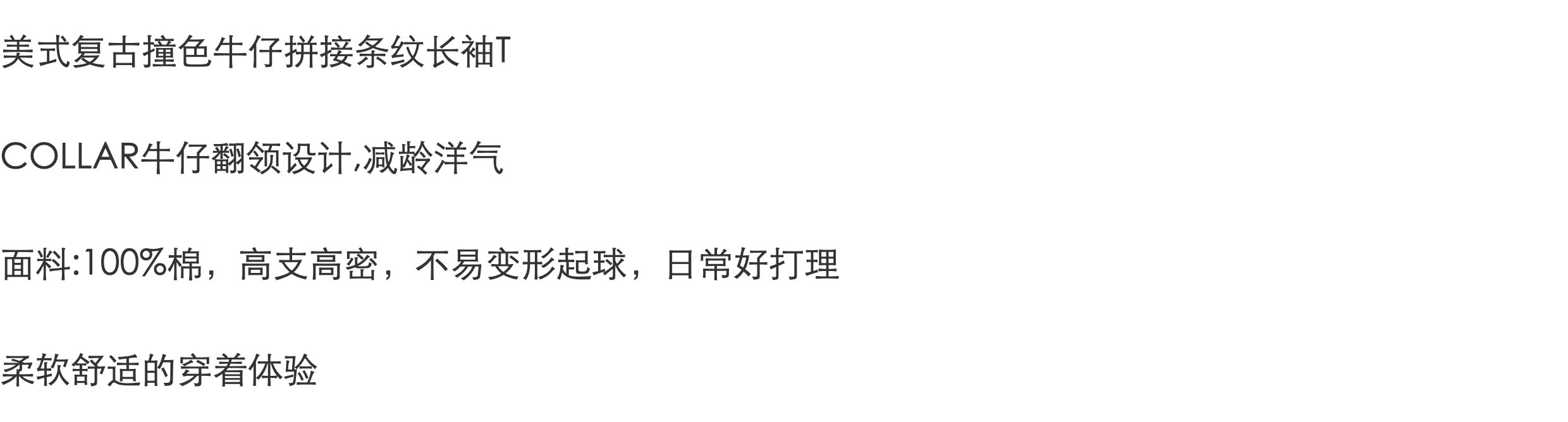顺丰包邮22506洛诗琳美式复古撞色牛仔拼接条纹长袖T恤708