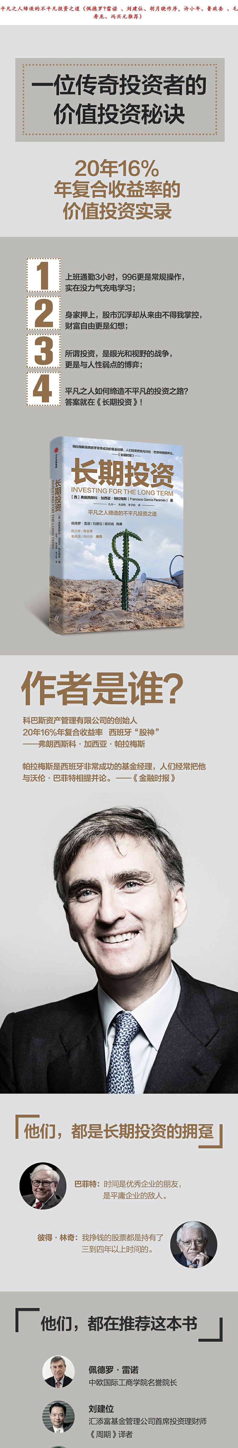 我非常喜欢这本书,主要是为作者的坦诚所感染。作者明确承认,“一个健全的理论框架”对于投资决策是“非常有用的”,并对奥地利学派比较推崇,这在更多关注个体公司的“长期投资”者中是非常罕见的;作者也坦承,书中所谈的投资诀窍并无石破天惊的新见,只是“应用起来却不容易,因为它需要具备一系列性格特征”,而要获得这样的性格并不容易。这提醒我们,要成为长期投资者,我们可能首先得去找到具备这样性格的投资管理人,然后委托他来投资,而不是在读完这本秘籍后就立刻自己干。