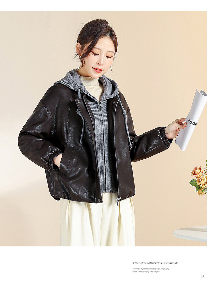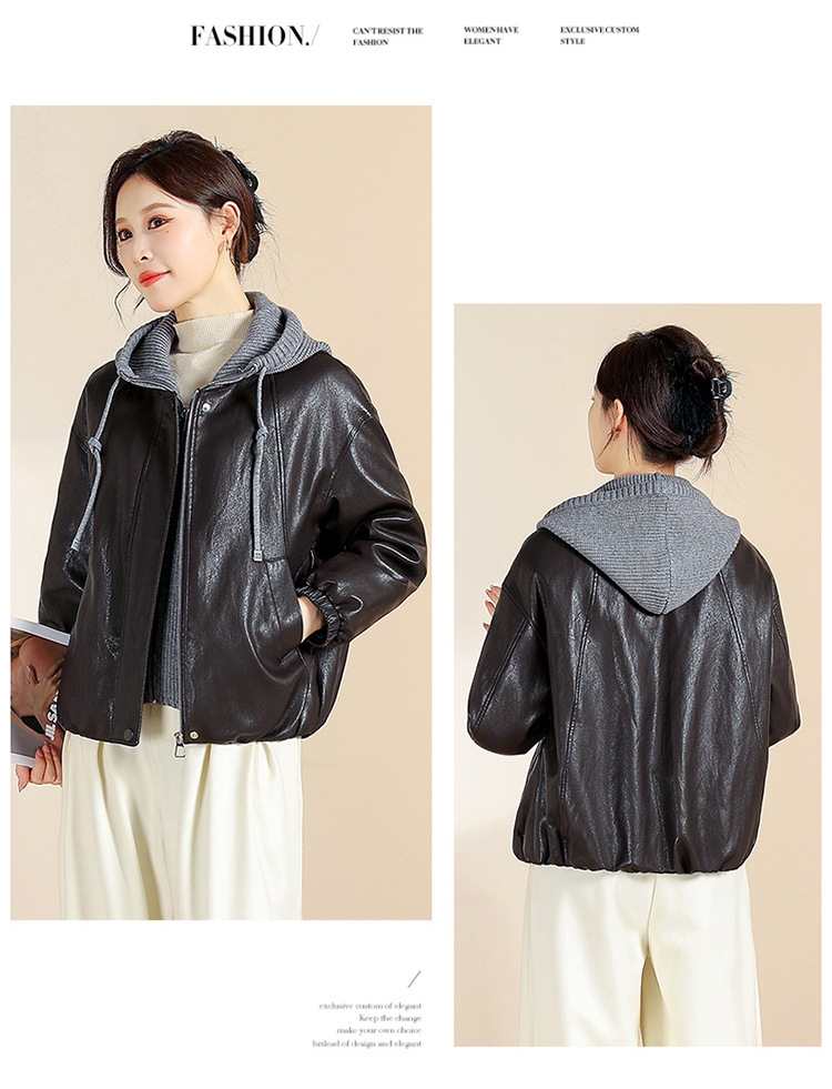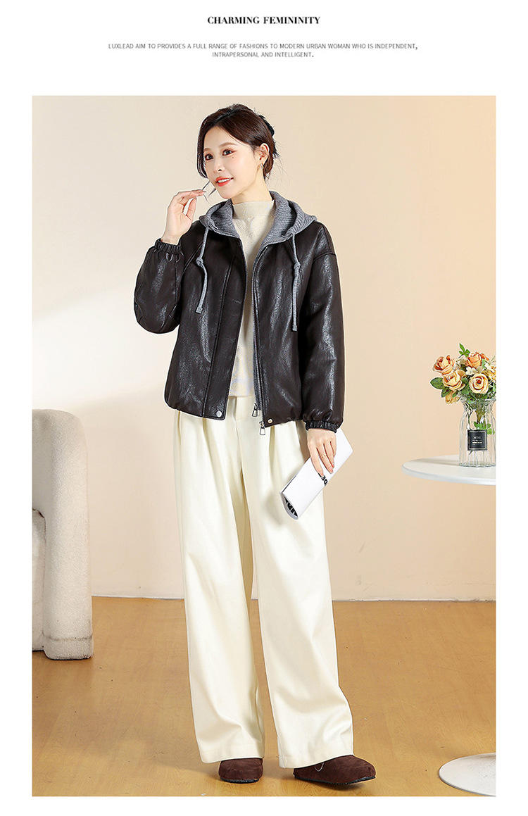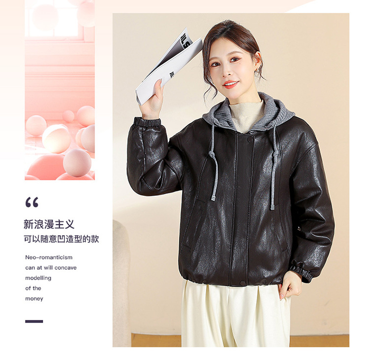 QYM CS25D90-Y时尚PU拼结连帽外套水洗皮休闲皮衣外套